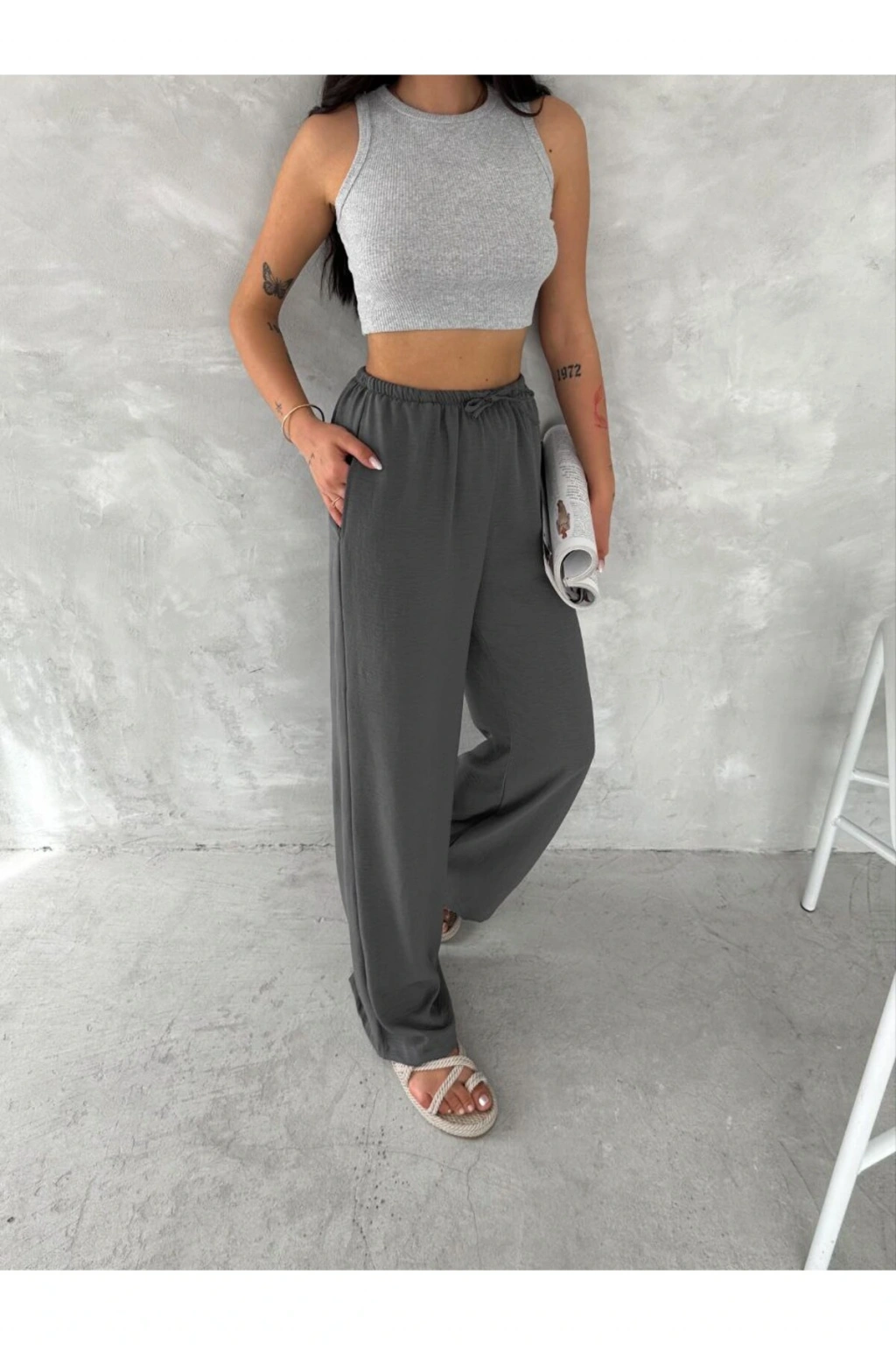 - Rahatlık ve şıklığı bir arada sunan beli lastikli geniş paça pantolon, günlük kullanım için idealdir.; - Her mevsim tercih edilebilen orta kalınlıkta kumaşı ile dört mevsim konfor sağlar.; - Pratik çift cepli tasarımı sayesinde küçük eşyalarınızı yanınızda taşımanız kolaylaşır.; - Baskısız ve sade görünümüyle her türlü üst giyimle uyumlu bir kombin oluşturur.; - Bağcıklı kemer detayı ile belinizi istediğiniz gibi ayarlayabilirsiniz; böylece kişisel tarzınıza göre şekillendirebilirsiniz.; - Aerobin dokuma tipi hafifliği ve nefes alabilir yapısıyla gün boyu rahat etmenizi sağlar.; - Basic koleksiyonun parçası olarak minimalist tasarım anlayışını benimserken, cool & comfort persona ile modern bir stil sunar.; - Yüksek bel kesimi sayesinde vücut hatlarınıza zarifçe oturarak feminen bir siluet çizer.; - Yetişkinler için özel olarak tasarlanmış bu pantolon, hem işlevsellik hem de estetik açıdan beklentilerinizi karşılar.; - Kadın ve kız kullanıcılarına hitap eden bu model, casual ortamlarda rahatlıkla tercih edilebilir.; - Türkiye menşeli olmasıyla yerel üretim avantajlarından faydalanırken, dokuma materyali dayanıklılığı arttırır.; - Regular kalıp ile vücudu saran ancak sıkmayan yapıda olup hareket özgürlüğünüzü kısıtlamaz.; - Düz deseniyle zamansız parçalar arasında yerini alarak gardrobunuzda vazgeçilmez bir parça haline gelir.; - Geniş paça tasarımı modern trendleri yansıtırken aynı zamanda konforlu adımlar atmanız için geniş alan sunar.