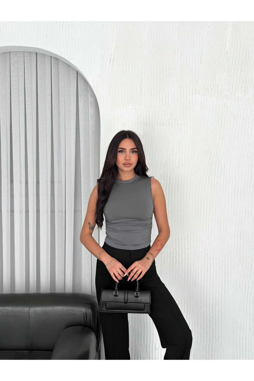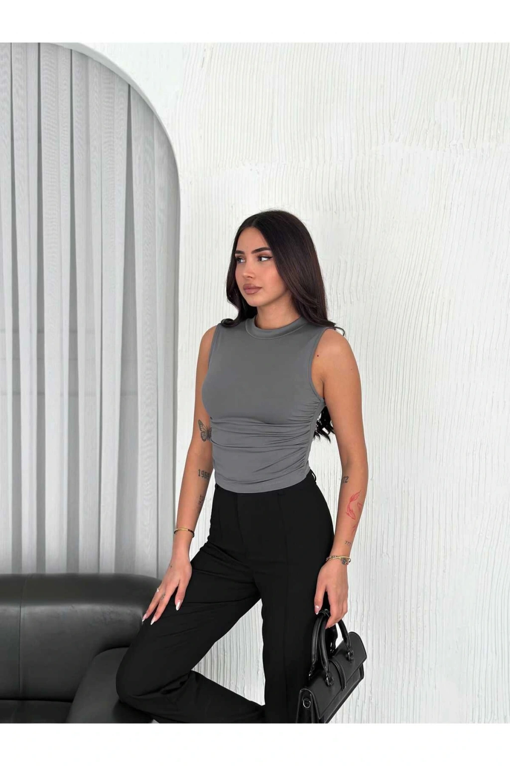 - Her mevsim rahatlıkla tercih edilebilen, zamansız tasarımıyla dikkat çeken büzgü detaylı kolsuz bluz.; - Cepsiz yapısı ile minimalist bir görünüm sunar ve günlük kullanım için idealdir.; - Baskısız tasarım sayesinde sade ve şık bir stil oluştururken, her türlü kombinle uyum sağlar.; - Orta kalınlığındaki kumaşı mevsim geçişlerinde konforlu bir deneyim vaat eder.; - Mono kapama özelliğiyle pratik kullanım sunarken, kolayca giyilip çıkarılabilir.; - Sürdürülebilirlik detayına önem vermeyen bu bluz, çevreye duyarlı tüketicilere hitap etmez.; - Büzgü detayları sayesinde vücut hatlarını zarifçe sararak feminen bir siluet çizer.; - Astarsız yapısıyla hafif ve ferah bir his bırakırken iç göstermez; böylece özgürce hareket etme imkanı tanır.; - Cool & comfort persona'sına sahip olan bu bluz, hem gündüz hem de gece ortamları için uygundur.; - Basic koleksiyonun sadeliğini yansıtan düz deseniyle gardrobunuzda temel parça olarak yerini alır.; - Tekli paketiyle ihtiyacınız olan tek şey bu bluz olacak şekilde tasarlanmıştır; ekstra eşya taşıma derdi olmadan konforun keyfini çıkartabilirsiniz.; - Türkiye'de üretilmiş olmasıyla yerel üretim avantajlarından faydalanırken kalite standartlarına uygunluğu garanti altına alınır.; - Örme kumaşı sayesinde esneklik kazandırarak gün boyu rahat etmenizi sağlar; likra materyali ise formunu korumasına yardımcı olur.; - Bisiklet yakası modern çizgileriyle güncel moda akımlarıyla uyum içinde duruş sergiler.; - Kolsuz tasarım kolay kombinlenebilirlik sunarken, modal dokuma tipi yumuşak dokusuyla teninize nazikçe dokunur.; - Yetişkinlerin günlük ihtiyaçlarına yönelik olarak tasarlanmıştır; her yaştan kadınların gardrobunda temel taşlarından biri haline gelmeye adaydır.; - Normal boy kesimiyle farklı vücut tiplerine uyum sağlayarak herkes tarafından rahatlıkla tercih edilebilir.; - Slim kalıp ile modern ve şık görünümün yanında vücut hatlarınıza mükemmel oturan yapıda üretilmiştir.