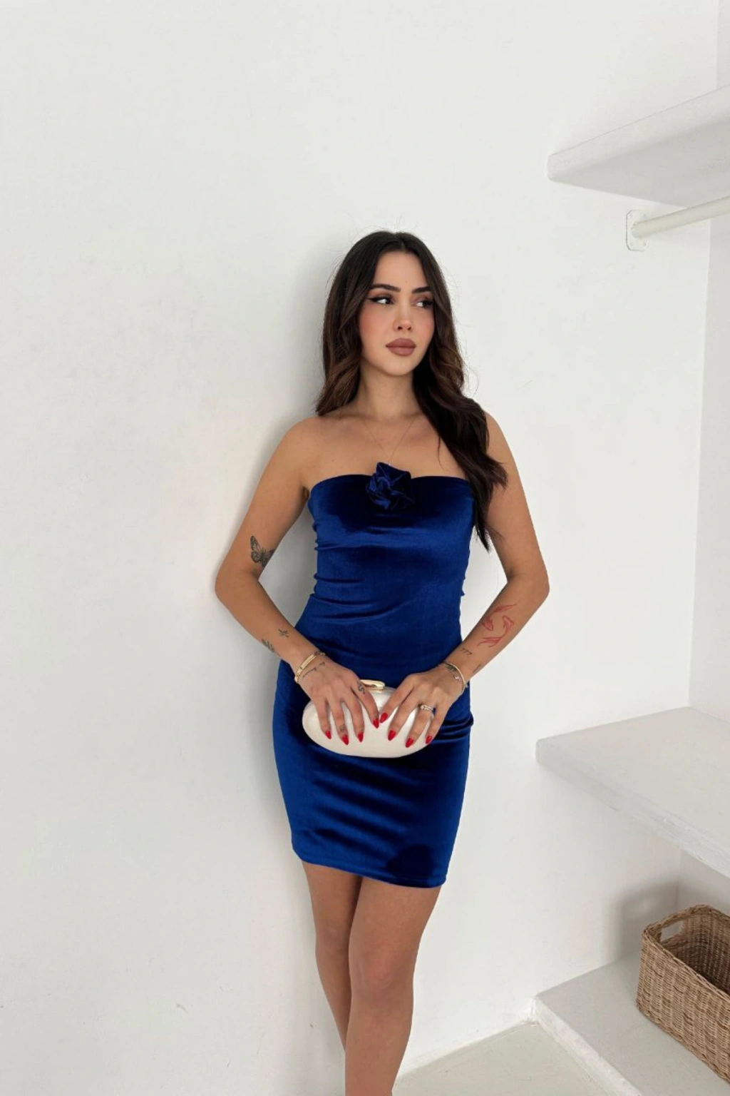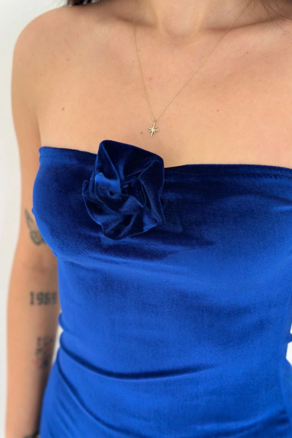 Çiçek Detaylı Kadife Kısa Mavi Straplez Elbise
