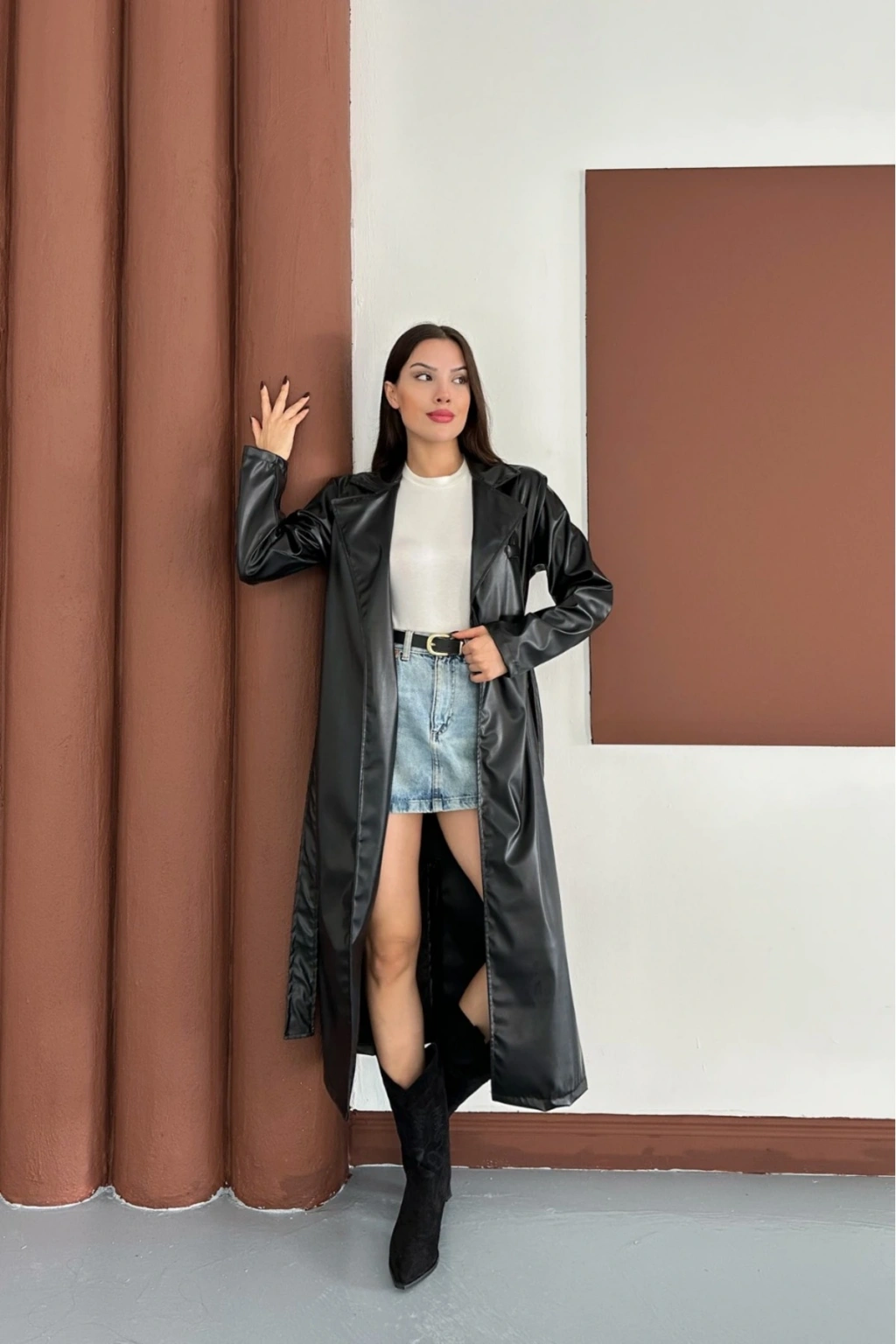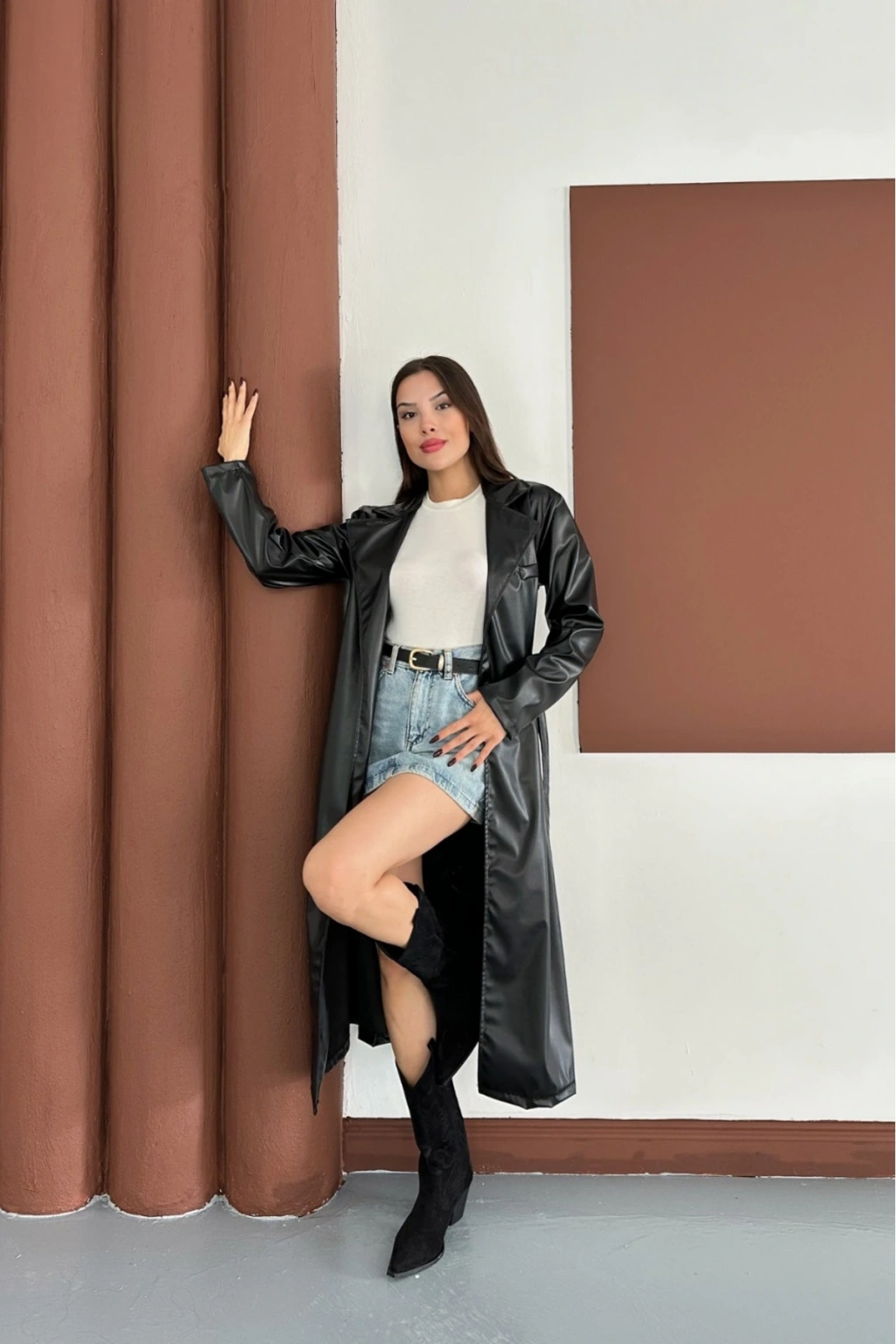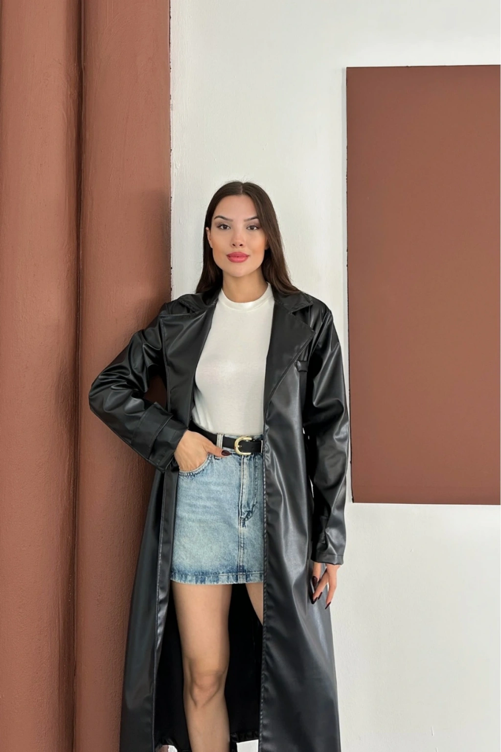- Suni deriden üretilmiş, uzun kollu ve astarsız yapısıyla soğuk havalarda konforlu bir kullanım sunar.; - Kruvaze yaka tasarımı ile modern ve şık bir görünüm sağlar; günlük kullanımda rahatlıkla tercih edilebilir.; - Siyah rengiyle kolayca kombinlenebilen bu trençkot, her ortamda zarif bir stil oluşturmanızı sağlar.; - Orta kalınlığındaki materyali sayesinde mevsim geçişlerinde ideal koruma sunarken, casual tarza uygunluğuyla dikkat çeker.; - Çift cepli tasarım pratik saklama alanları sunarak günlük eşyalarınız için kolay erişim imkanı tanır.; - Kemersiz yapısıyla basit ama etkili bir siluet sergileyerek farklı aksesuarlarla kişiselleştirilebilirliği artırır.; - Basic koleksiyonunun bir parçası olarak minimalist tasarım anlayışını benimseyenler için idealdir; cool & comfort persona'ya hitap eder.