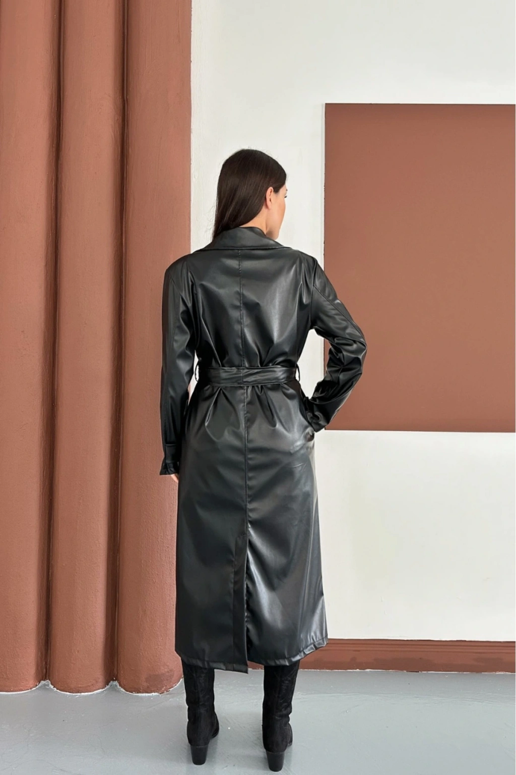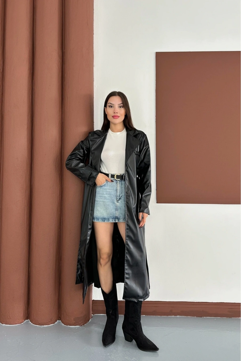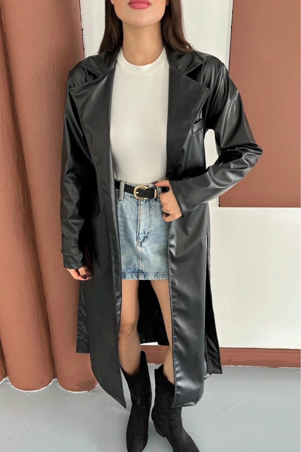 - Suni deriden üretilmiş, uzun kollu ve astarsız yapısıyla soğuk havalarda konforlu bir kullanım sunar.; - Kruvaze yaka tasarımı ile modern ve şık bir görünüm sağlar; günlük kullanımda rahatlıkla tercih edilebilir.; - Siyah rengiyle kolayca kombinlenebilen bu trençkot, her ortamda zarif bir stil oluşturmanızı sağlar.; - Orta kalınlığındaki materyali sayesinde mevsim geçişlerinde ideal koruma sunarken, casual tarza uygunluğuyla dikkat çeker.; - Çift cepli tasarım pratik saklama alanları sunarak günlük eşyalarınız için kolay erişim imkanı tanır.; - Kemersiz yapısıyla basit ama etkili bir siluet sergileyerek farklı aksesuarlarla kişiselleştirilebilirliği artırır.; - Basic koleksiyonunun bir parçası olarak minimalist tasarım anlayışını benimseyenler için idealdir; cool & comfort persona'ya hitap eder.
