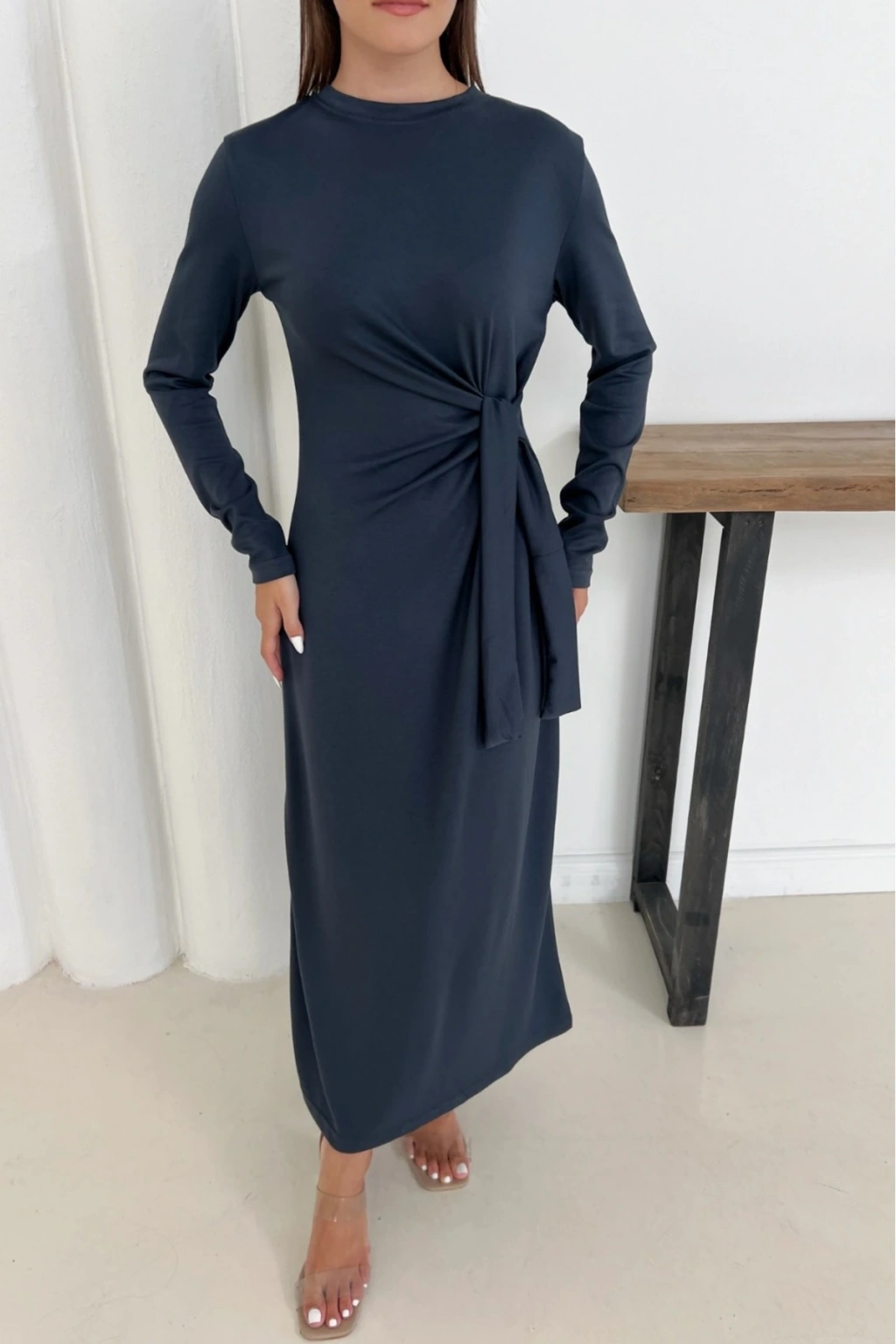 Kadın Antrasit Modal Kumaş Yandan Bağlama Detaylı Uzun Elbise