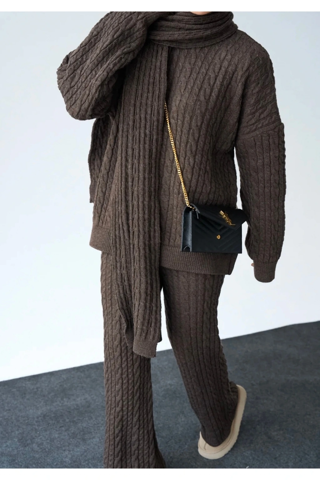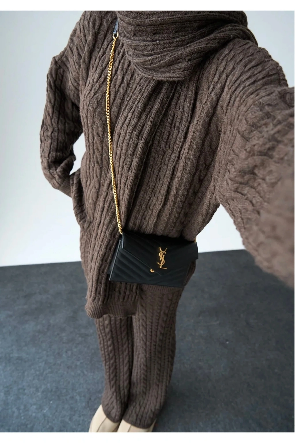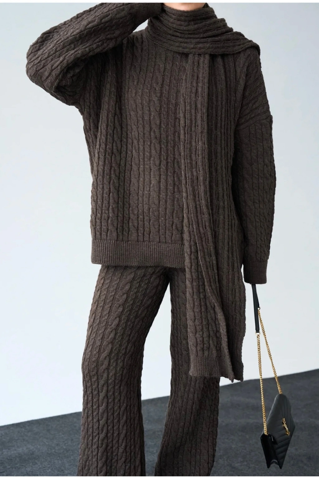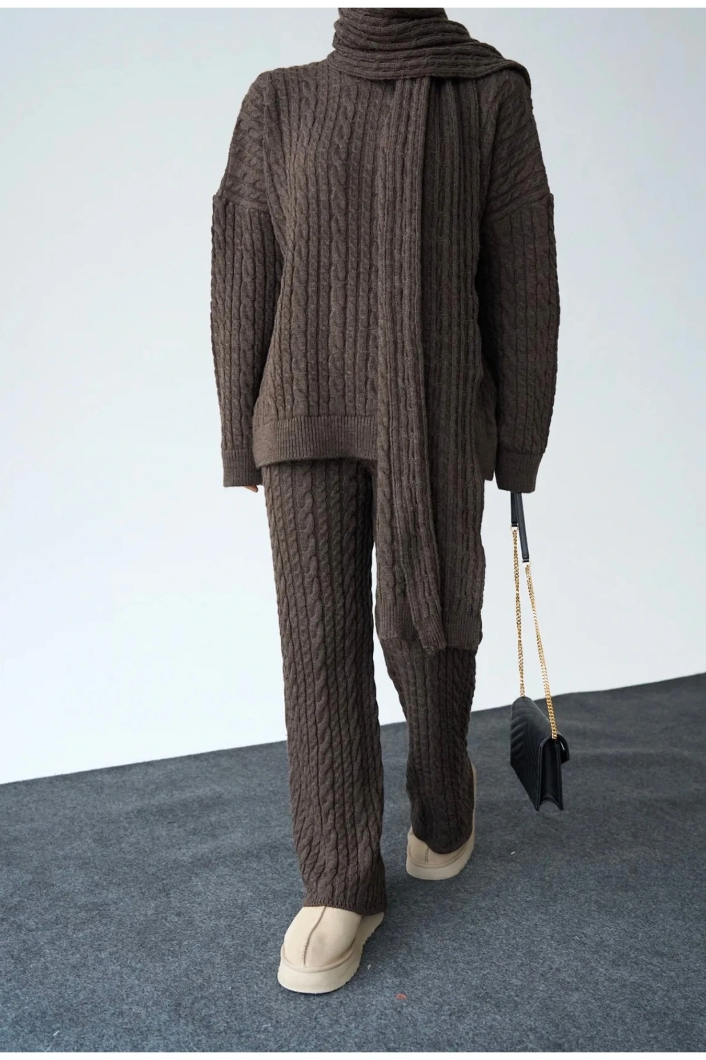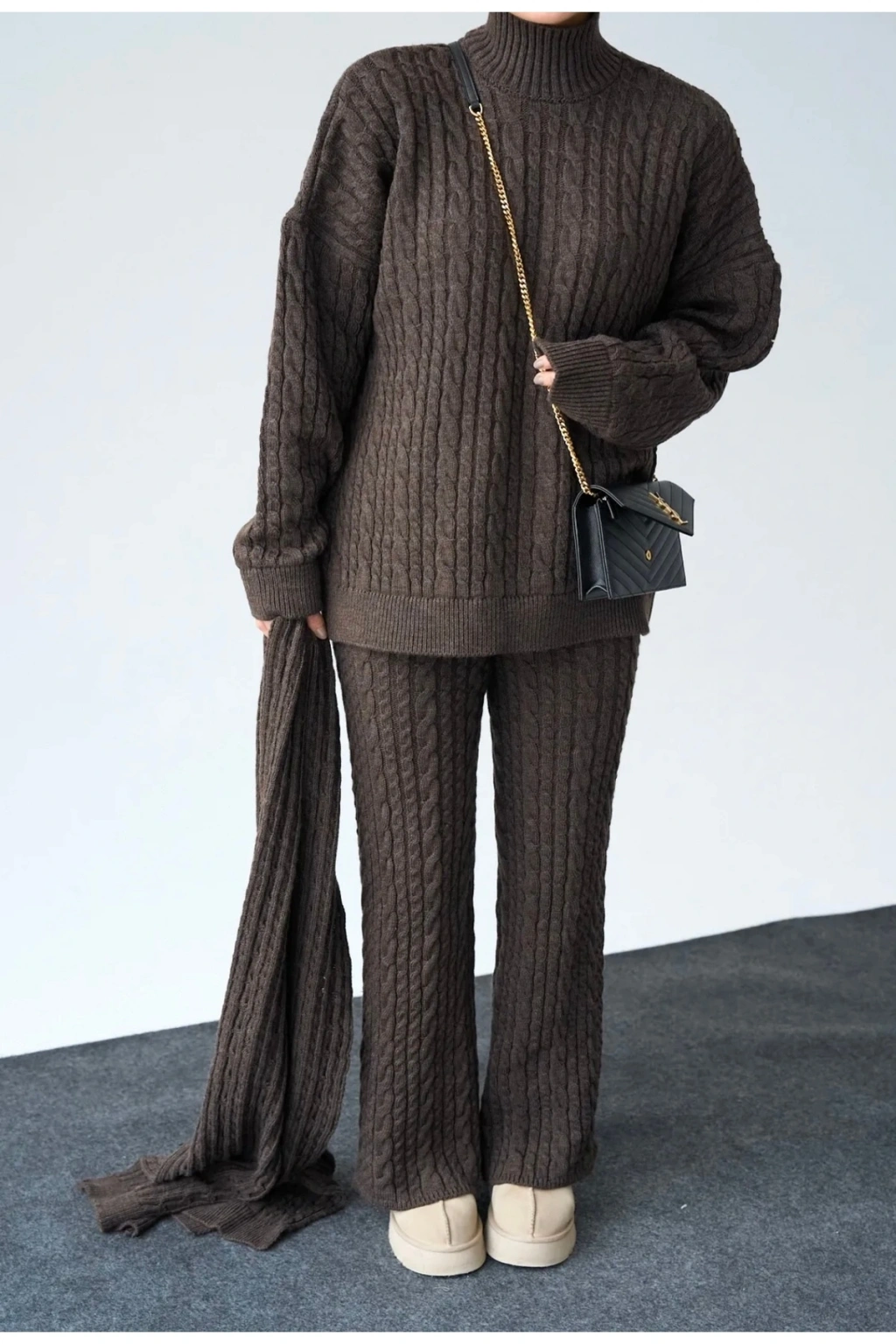 - Üç parçadan oluşan set, günlük kullanım için ideal bir seçenek sunar; atkı, balıkçı yaka kazak ve pantolon.; - Cool & comfort tarzıyla rahatlık ve şıklığı bir arada yaşatan bu takım, günlük aktivitelerinizde konforunuzdan ödün vermez.; - Dik yaka tasarımı ile modern ve zarif bir görünüm sağlarken, aynı zamanda soğuk havalarda sıcak tutar.; - Yetişkinlerin tercihi olan bu takım, uzun boy kesimiyle vücut hatlarını nazikçe sararak rahat bir kullanım sunar.; - Triko kumaşı sayesinde yumuşak dokunuşuyla cildinize nazik davranırken, uzun süreli giyimde bile konfor sağlar.; - Regular kalıbı ile her bedene uyum sağlayan bu parça, hareket özgürlüğünüzü kısıtlamaz.; - Saç örgüsü deseniyle farklılık yaratmak isteyenler için idealdir; hem stil sahibi hem de pratik bir aksesuar olarak öne çıkar.; - Kadınların ve kızların gardrobunda yerini alacak bu takım, casual ortamlarda bile stil sahibi görünmenizi sağlar.; - Standart kol tipine sahip olup, uzun kol boyu ile mevsim geçişlerinde ideal koruma sunar.; - Pamuklu materyali sayesinde nefes alabilirlik özelliğiyle gün boyu ferahlık hissi verirken, dayanıklılığından ödün vermez.; - Casual/günlük ortamlara uygun olarak tasarlanmıştır; evde, işte ya da dışarıda rahatlıkla tercih edebilirsiniz.