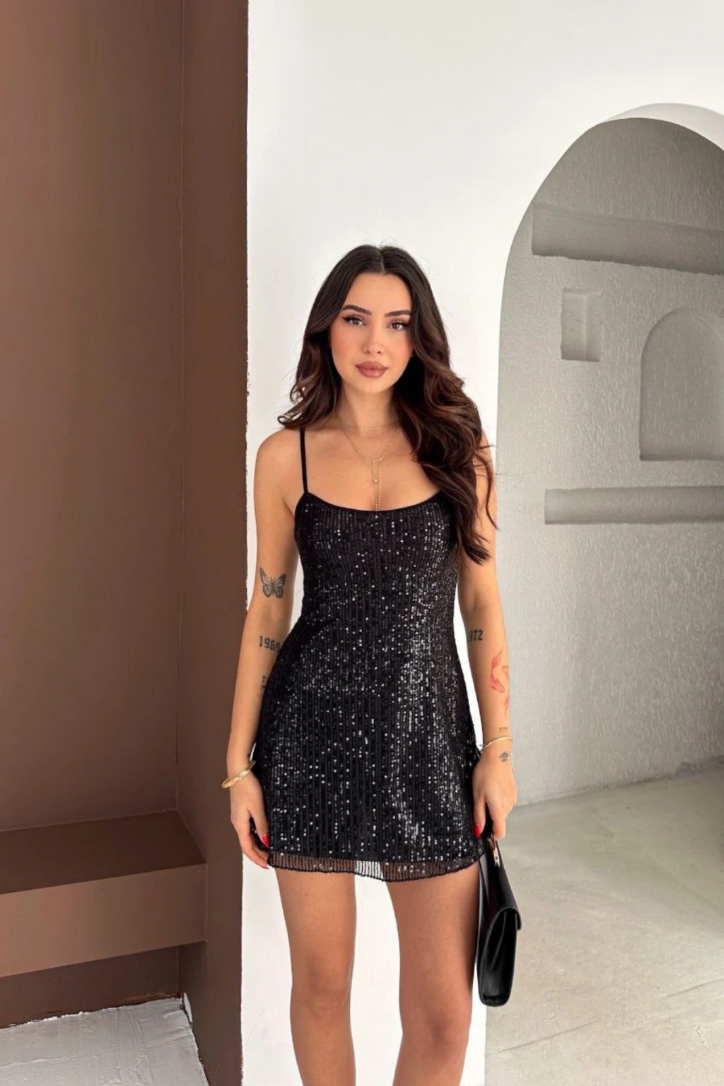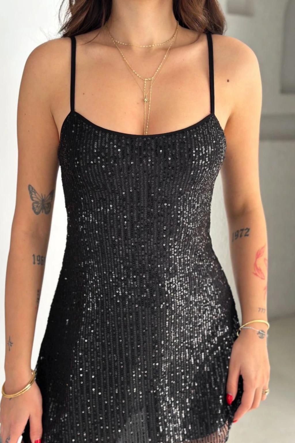 Kadın Ayarlana Bilir Askılı Pul Paletli Siyah Mini Elbise