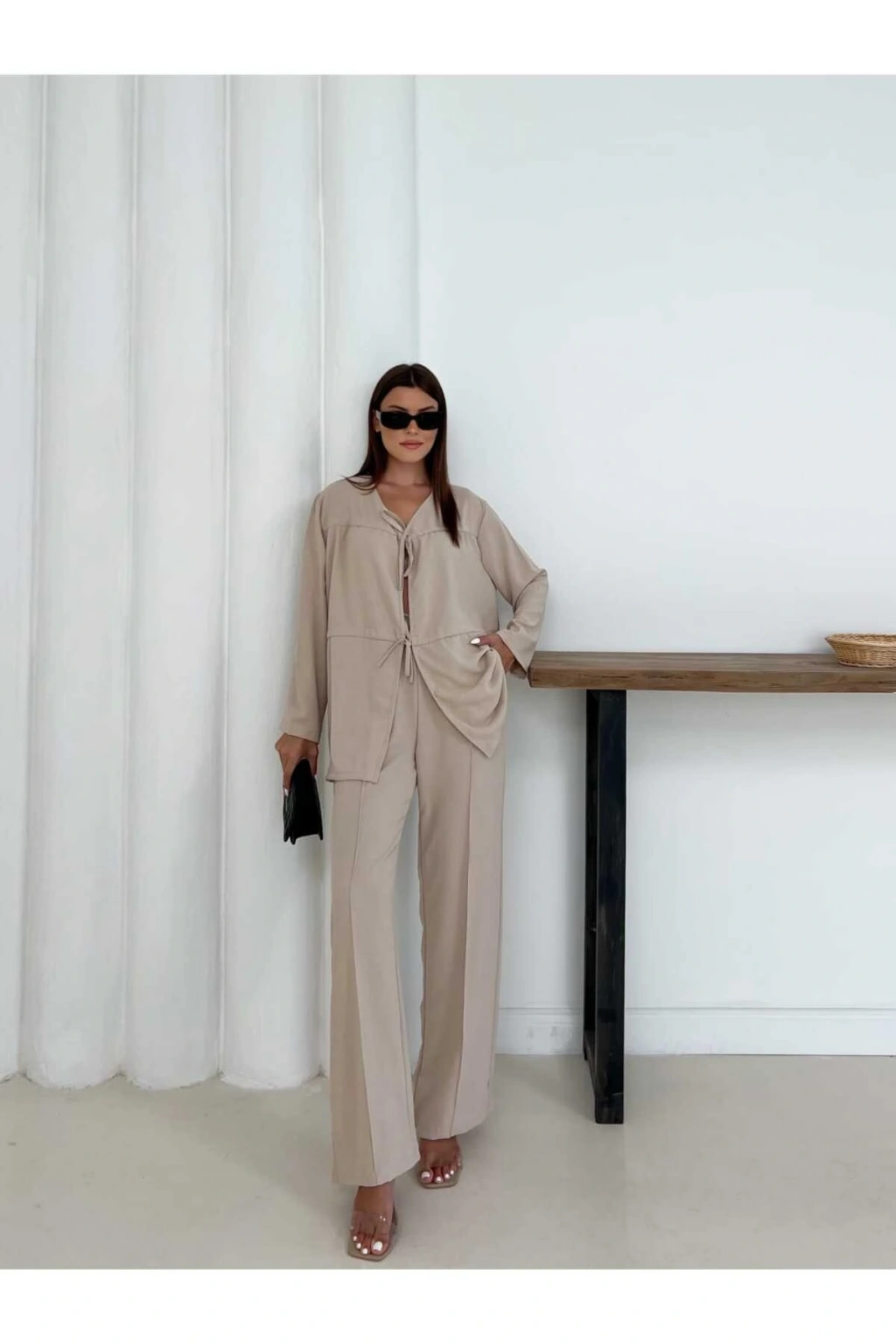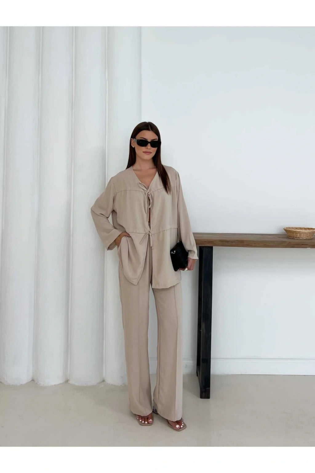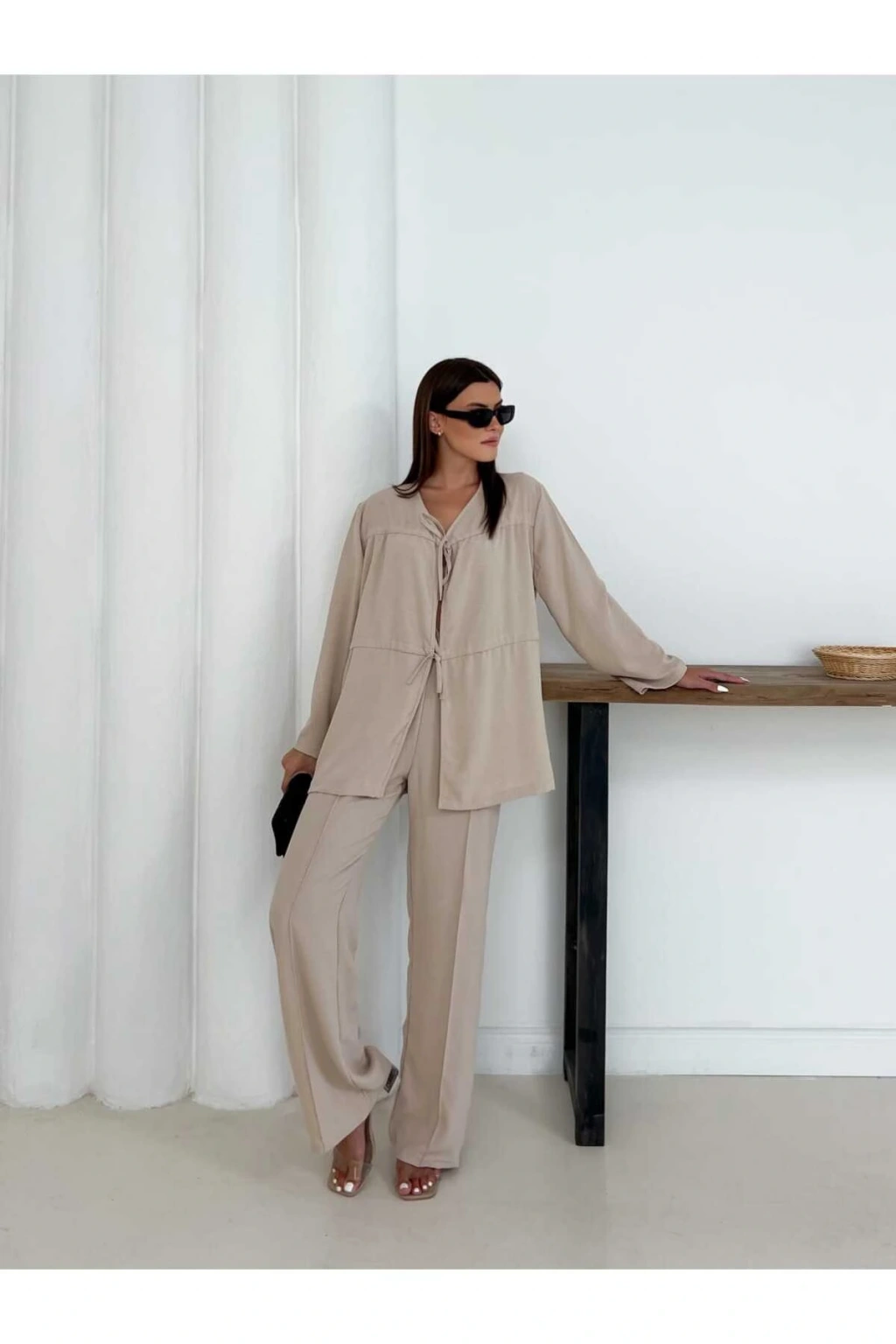 - Aerobin kumaştan üretilmiş olup, hafif ve nefes alabilen yapısıyla yaz ayları için idealdir.; - Bağlama detaylı tasarımı sayesinde kişisel zevke göre ayarlanabilir bel yüksekliği sunar.; - V yaka kesimi ile modern ve şık bir görünüm sağlar.; - Bağlama veya bağcık kullanarak kolayca giyilip çıkartılabilir; pratik kullanım imkanı tanır.; - Normal bel kesimi rahat hareket etme özgürlüğü verirken, geniş paça tasarımı konforlu bir kullanım sunar.; - İki parçadan oluşan set (pantolon ve kimono) hem kombin seçeneklerini artırır hem de stil sahibi bir görünüm kazandırır.; - Sade ve düz deseniyle zamansız bir tarza sahip olmanızı sağlar; farklı aksesuarlarla kolayca kişiselleştirilebilir.; - Aerobin dokuması sayesinde dayanıklılığı arttırırken, beli lastikli yapısı ekstra konfor sunar.; - Günlük kullanım için uygun olan bu takım, casual ortamlarda rahatlıkla tercih edilebilir.; - Pamuklu materyali cildinizle dosttur ve uzun süreli kullanım için uygundur.; - Casual giyim anlayışına uygun olarak tasarlanmış olup, her türden aksesuarla kolayca eşleştirilebilir.