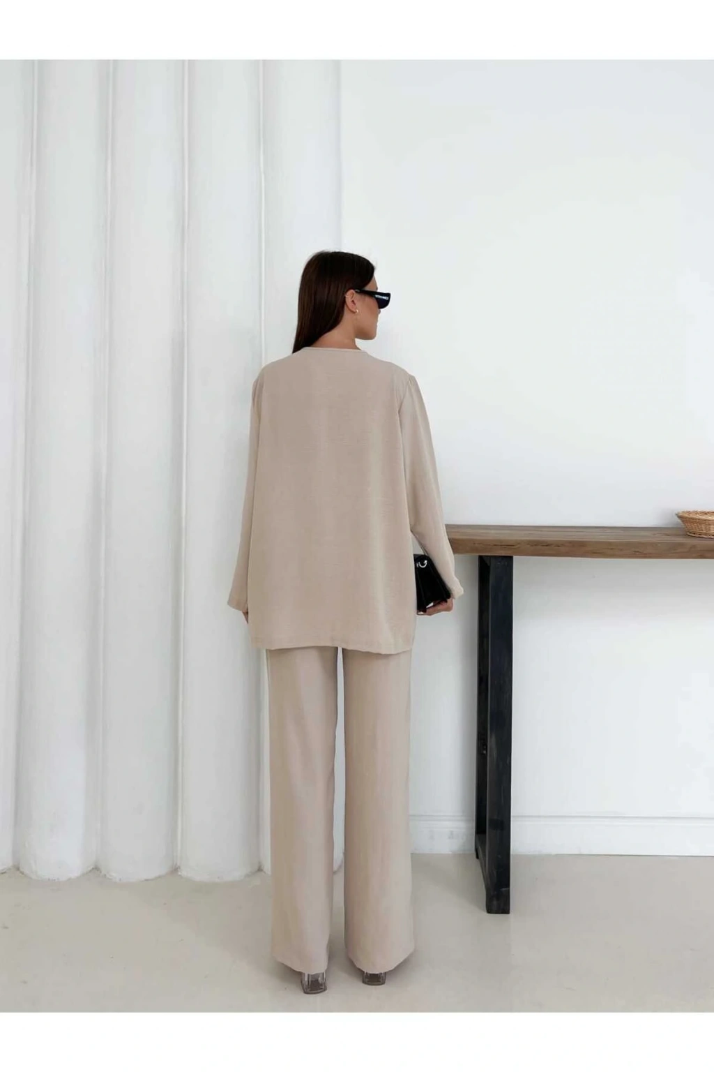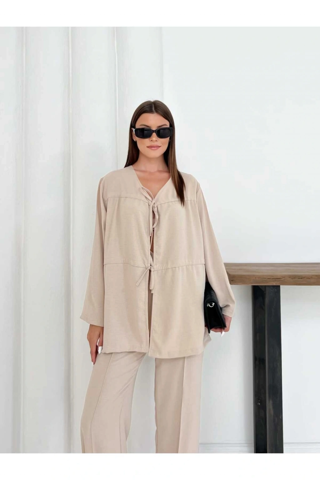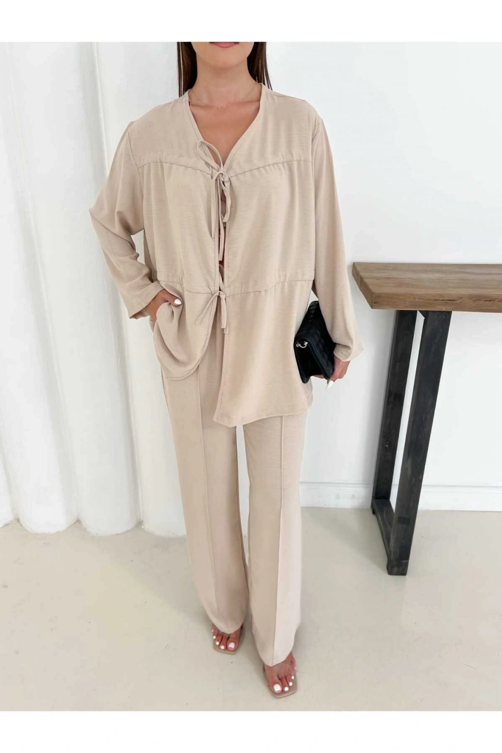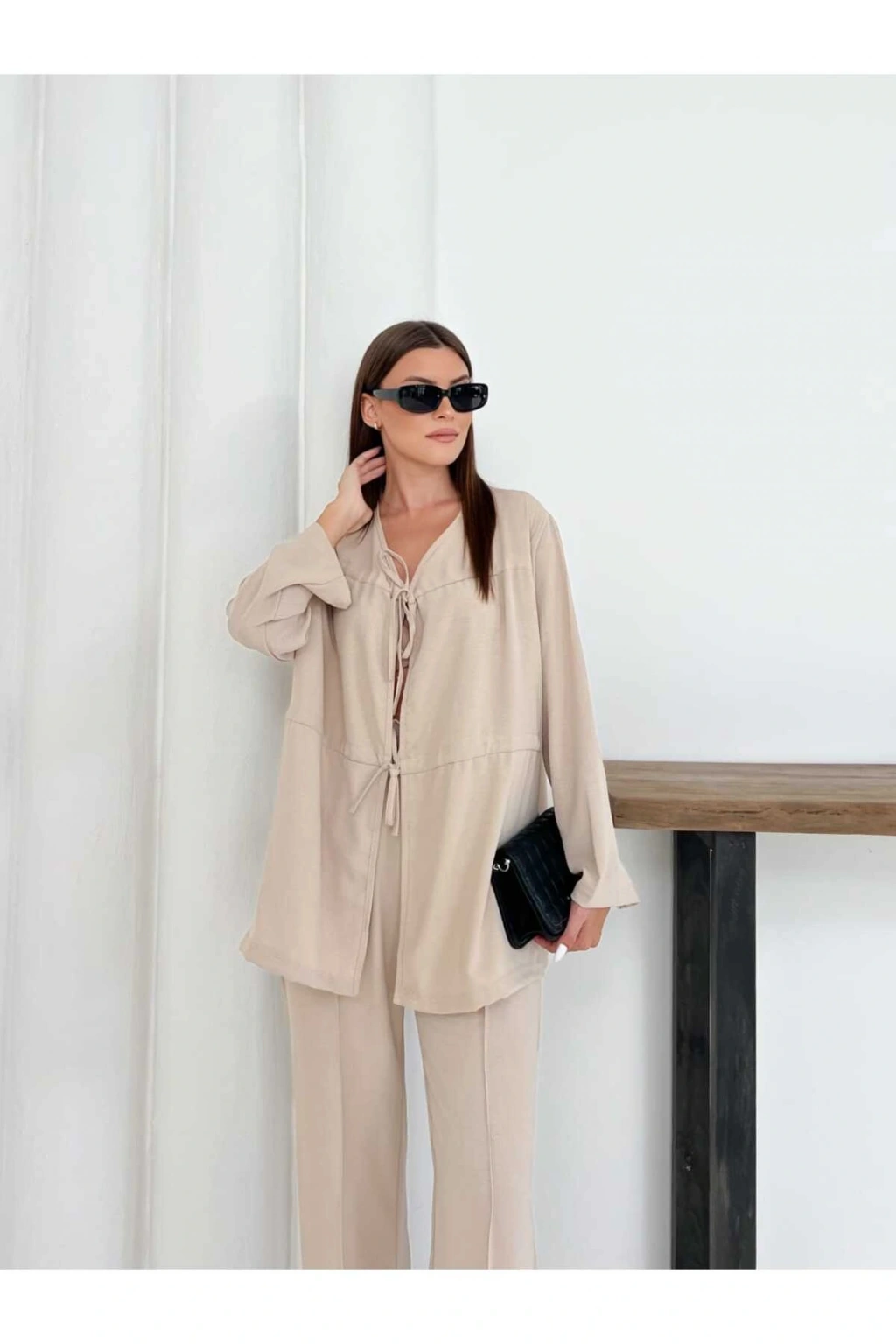 Kadın Bej Aerobin Kumaş Pantolon Ve Kimona İkili Takım
