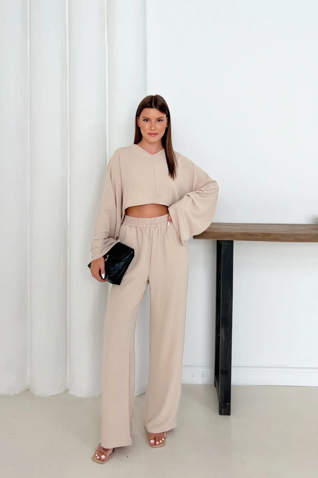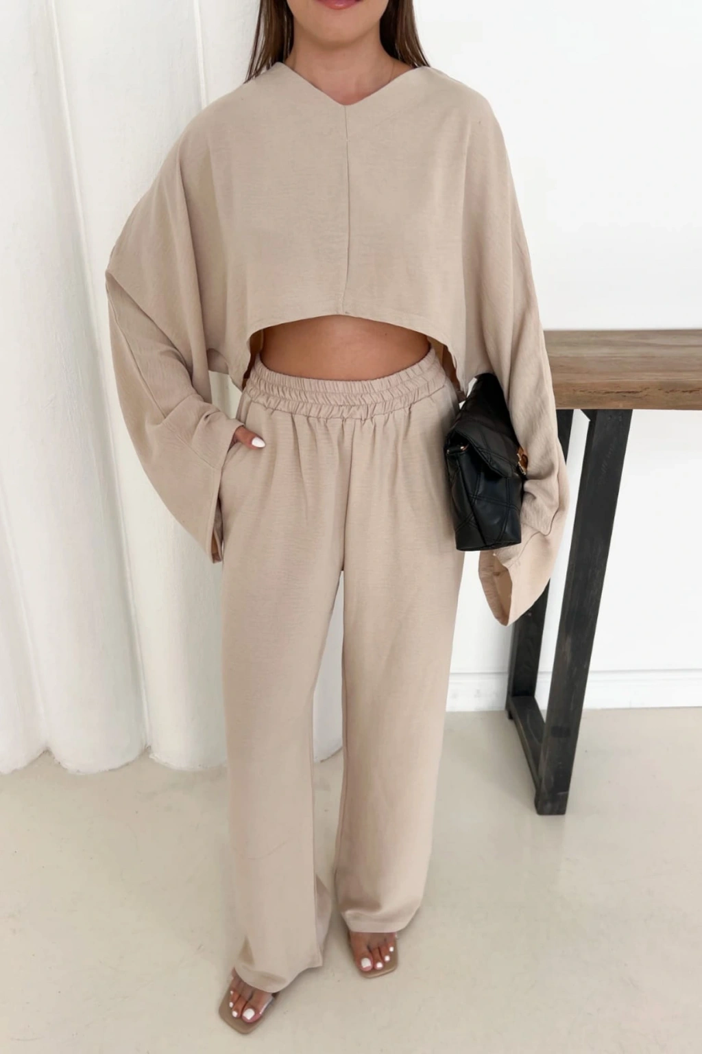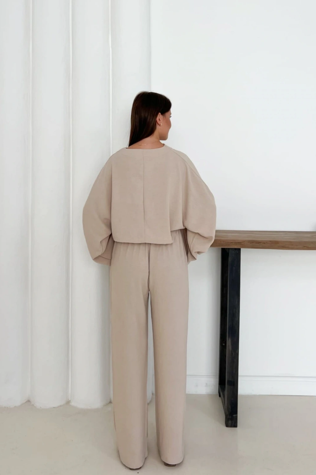 - Rahat kesimiyle günlük kullanım için ideal, yarasa kol detaylarına sahip keten takım.; - V yaka tasarımı ile şıklığı ve konforu bir arada sunan bu takım, her ortamda rahatlıkla tercih edilebilir.; - Lastikli bel yapısı sayesinde gün boyu rahat hareket etme olanağı sağlar; hem evde hem de dışarıda keyifli anlar yaşatır.; - İki parçadan oluşan set içeriğiyle pratik kombinler oluşturmanızı kolaylaştırır; hem zamandan hem de mekandan tasarruf etmenizi sağlar.; - Sade ve düz deseniyle her türlü aksesuarla uyumlu olan bu takım, gardırobunuzun vazgeçilmez parçasına dönüşecek.; - Keten karışım kumaşı sayesinde hafifliği ve nefes alabilirliği ile yaz aylarının vazgeçilmezi haline gelirken, tüm sezonlarda da kullanılabilir.; - Geniş paça pantolon kesimi modern bir görünüm kazandırırken, yarasa kol üst parça ile dengeli bir siluet oluşturur.; - Astarsız yapısıyla hafif ve ferah hissettiren bu takım, casual giyim tarzınıza mükemmel şekilde eşlik eder.; - Çift cepli tasarım fonksiyonelliği arttırarak günlük eşyalarınız için pratik saklama alanları sunar.; - Düz renk seçeneğiyle kolayca diğer giysilerinizle kombinleyebileceğiniz bu takım, stilinizi ön plana çıkartır.; - Oversize kalıbıyla rahatlığından ödün vermeyen kullanıcılar için idealdir; geniş kesimi sayesinde gün içindeki hareket özgürlüğünüzü kısıtlamaz.; - Günlük kullanım için tasarlanmış olup, casual giyiminize zarif bir dokunuş katmak isteyenler için birebirdir.