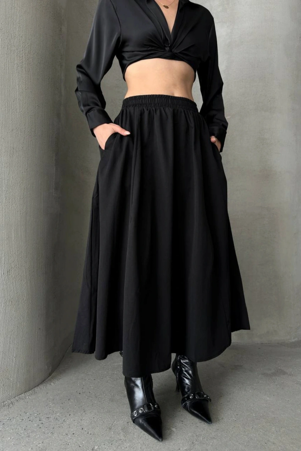 - Rahatlıkla kullanabileceğiniz, beli lastikli tasarımı sayesinde gün boyu konfor sunar.; - İki adet fonksiyonel cep ile eşyalarınızı yanınızda taşımanız için pratik çözümler sağlar.; - Her mevsim rahatlıkla tercih edebileceğiniz orta kalınlıkta kumaşıyla dört mevsim idealdir.; - Sade ve şık görünümüyle her türlü üst giyimle kolayca kombinlenebilir.; - Günlük kullanım için uygun olan bu etek, casual tarza sahip kadınların gardırobunun vazgeçilmezi olacak.; - Astarsız yapısıyla hafif ve ferah bir his verirken, dokuma kumaşı dayanıklılığı artırır.; - Uzun boy kesimi ile bacakları olduğundan daha uzun göstererek zarif bir siluet oluşturur.; - Kolay bakım imkanı sunan bu ürün, temizliği kolaydır ve sık yıkamaya uygundur.; - Günlük kullanım için ideal olan bu etek, hem işlevsellik hem de estetik açıdan beklentilerinizi karşılayacaktır.