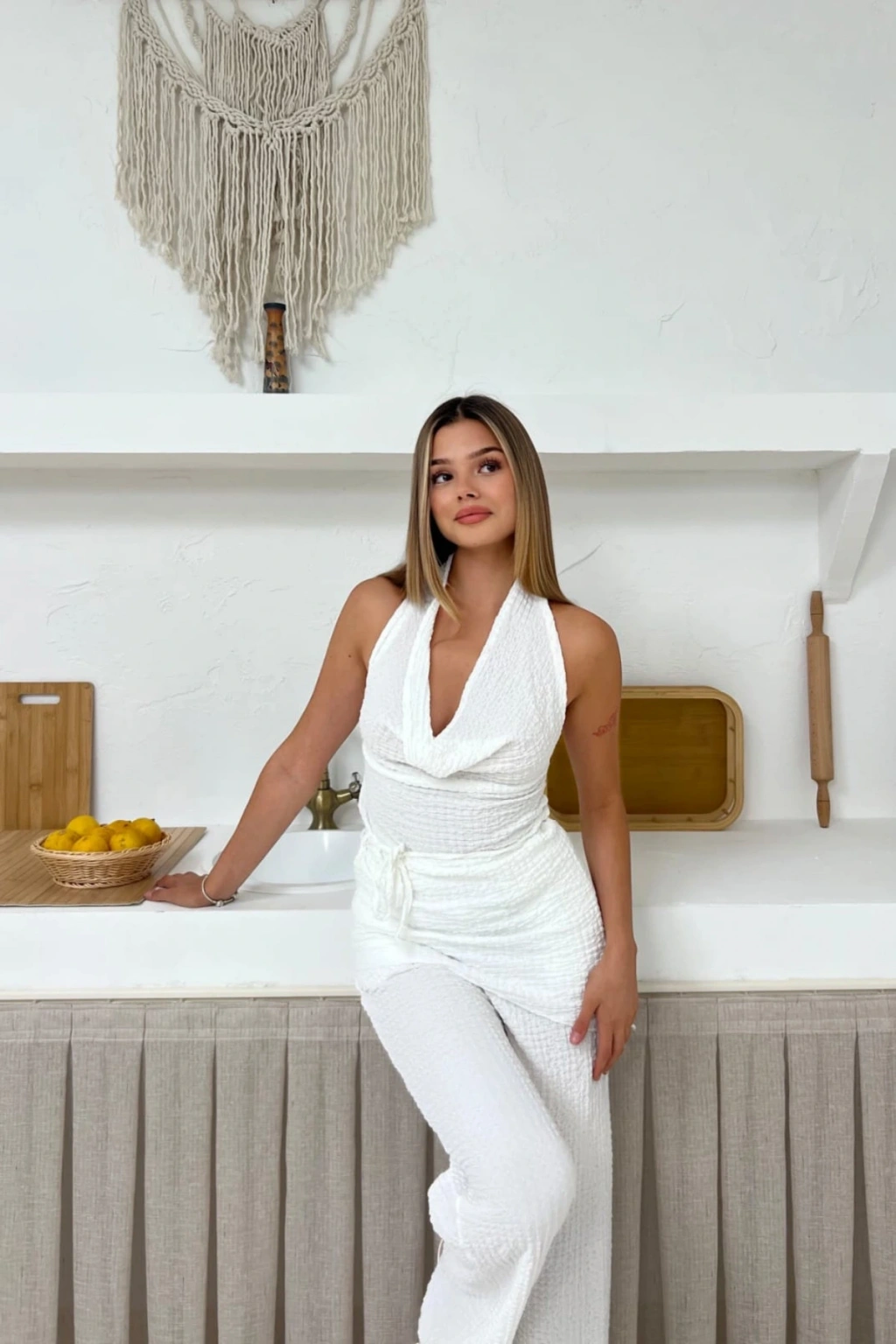 Kadın Beyaz Degaje Yaka Sırt Dekolteli Bluz Pantolon Takım