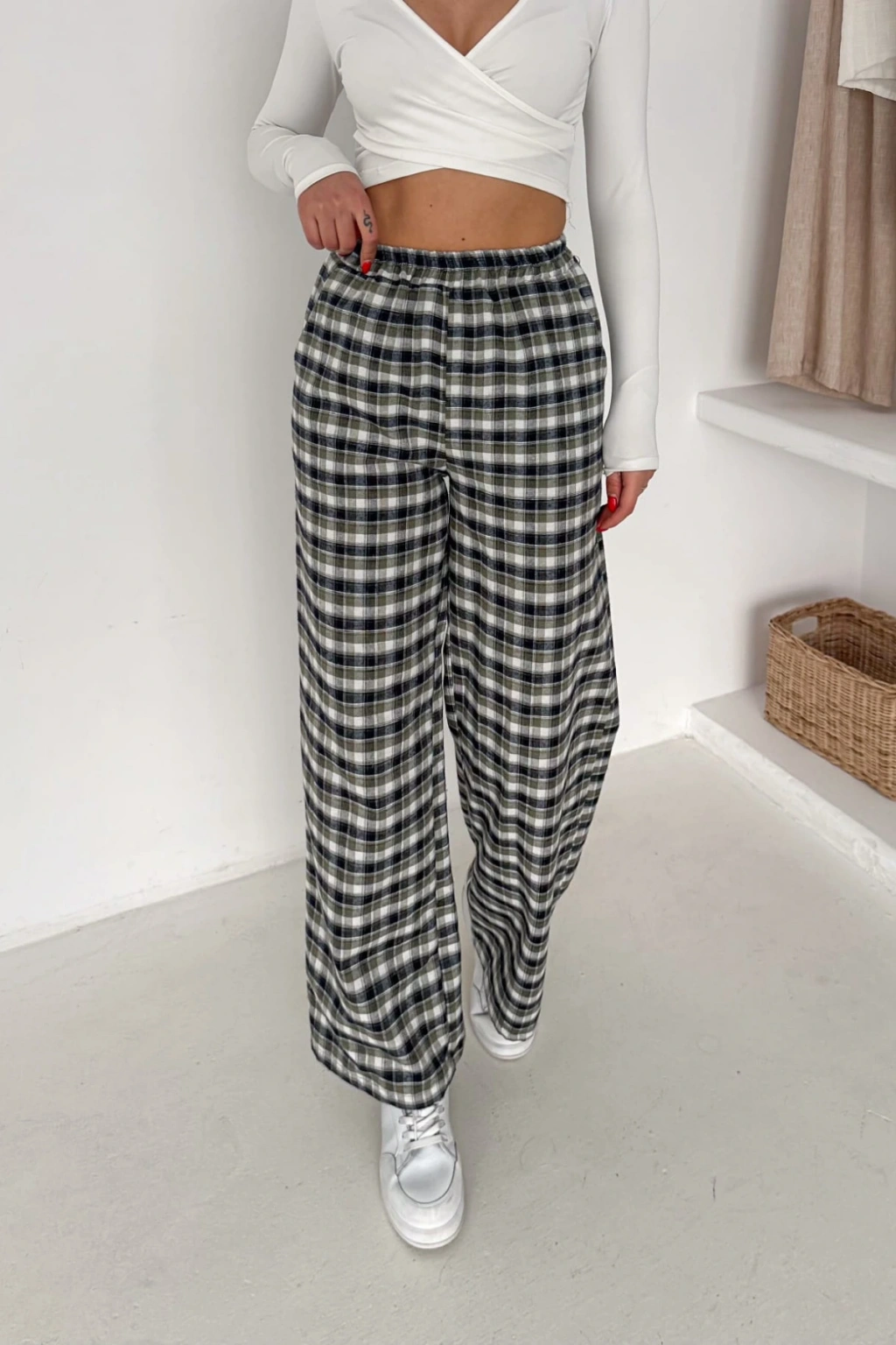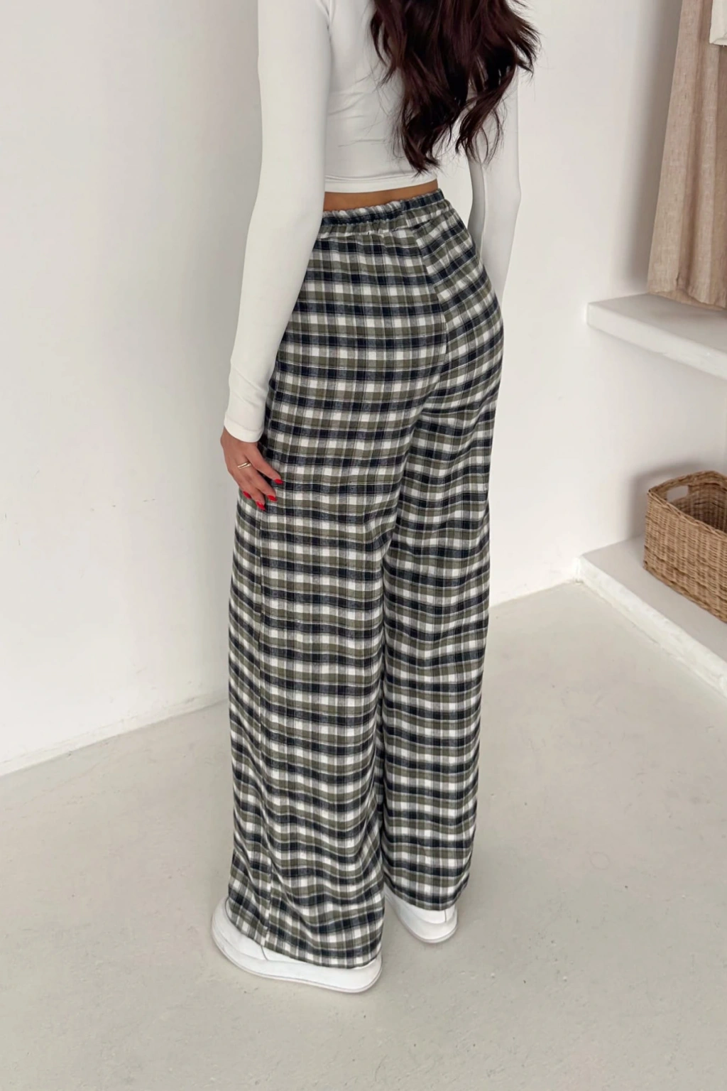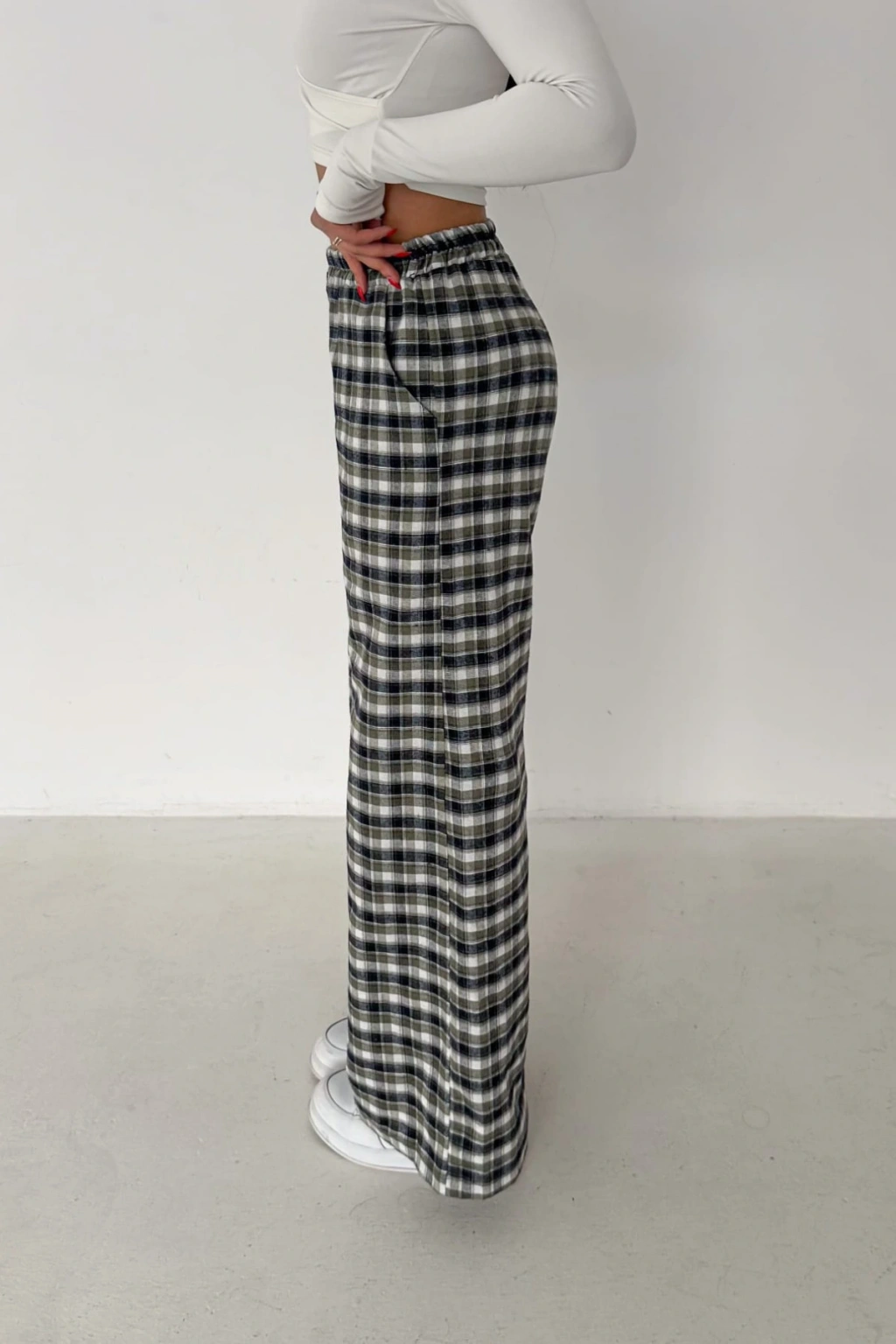 - Ekose deseniyle dikkat çeken bu pantolon, hem şık hem de rahat bir görünüm sunar.; - Yüksek bel tasarımı sayesinde vücut hatlarını zarifçe sarar ve modern bir siluet oluşturur.; - Bol kalıbı ile gün boyu konforlu bir kullanım sağlar; hareket özgürlüğünüzü kısıtlamaz.; - Tüm sezonlar için uygun olan bu pantolon, gardırobunuzun vazgeçilmez parçası haline gelir.; - Casual ortamlarda rahatlıkla tercih edebileceğiniz bu pantolon, günlük şıklığınızı tamamlar.; - Çift cepli tasarımı pratik kullanım imkanı sunarken, geniş paça kesimi modern bir stil vurgusu yapar.; - Orta kalınlıkta dokuma kumaşı ile mevsim geçişlerinde ideal bir seçimdir.; - Kemersiz tasarımı sayesinde bel kısmında doğal bir duruş sergiler ve esnek bel yapısıyla gün boyu rahatlık sağlar.; - Cool & Comfort persona ile tasarlanan bu pantolon, hem stil sahibi hem de konforlu bir