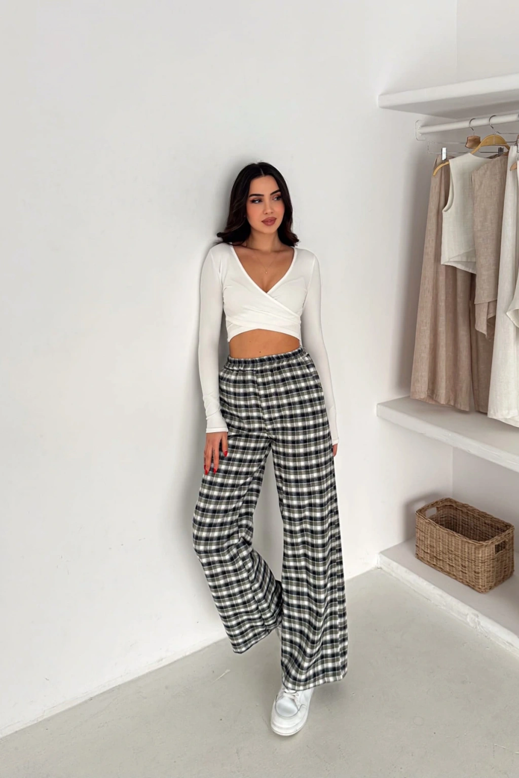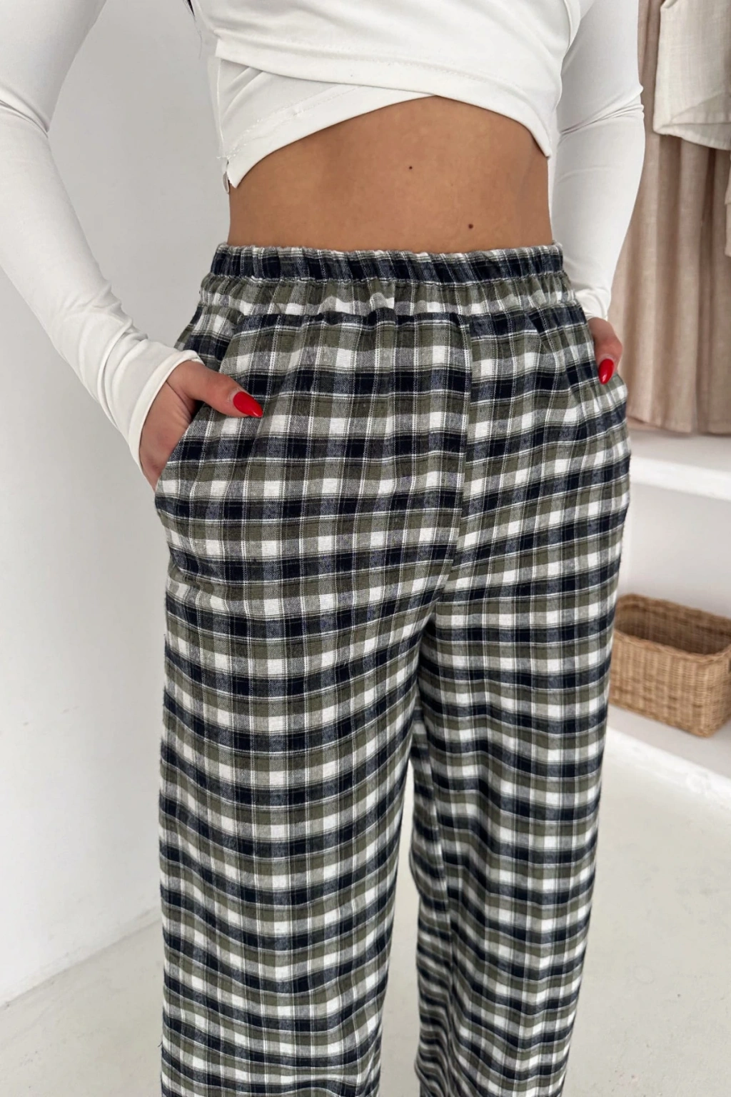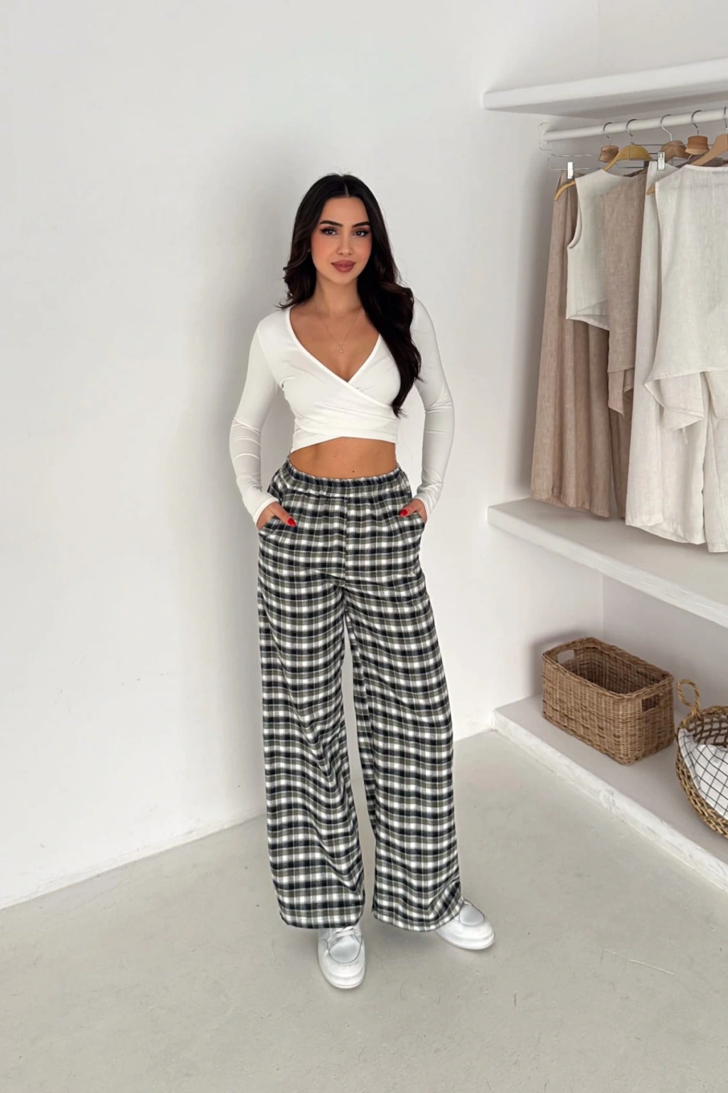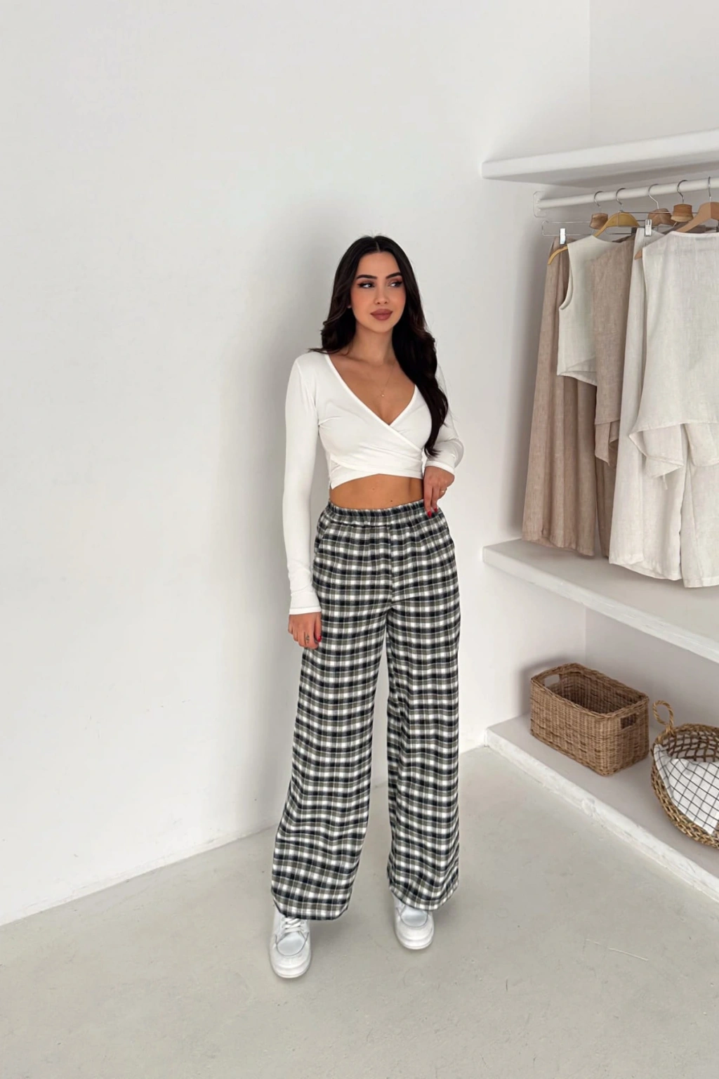 - Ekose deseniyle dikkat çeken bu pantolon, hem şık hem de rahat bir görünüm sunar.; - Yüksek bel tasarımı sayesinde vücut hatlarını zarifçe sarar ve modern bir siluet oluşturur.; - Bol kalıbı ile gün boyu konforlu bir kullanım sağlar; hareket özgürlüğünüzü kısıtlamaz.; - Tüm sezonlar için uygun olan bu pantolon, gardırobunuzun vazgeçilmez parçası haline gelir.; - Casual ortamlarda rahatlıkla tercih edebileceğiniz bu pantolon, günlük şıklığınızı tamamlar.; - Çift cepli tasarımı pratik kullanım imkanı sunarken, geniş paça kesimi modern bir stil vurgusu yapar.; - Orta kalınlıkta dokuma kumaşı ile mevsim geçişlerinde ideal bir seçimdir.; - Kemersiz tasarımı sayesinde bel kısmında doğal bir duruş sergiler ve esnek bel yapısıyla gün boyu rahatlık sağlar.; - Cool & Comfort persona ile tasarlanan bu pantolon, hem stil sahibi hem de konforlu bir