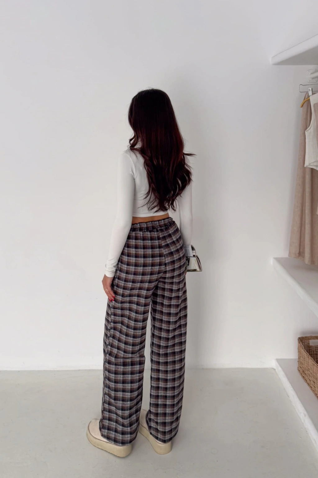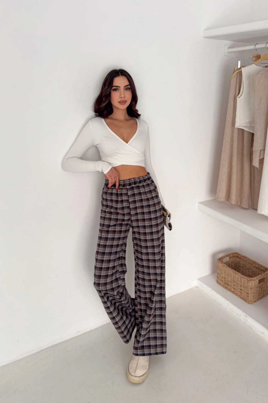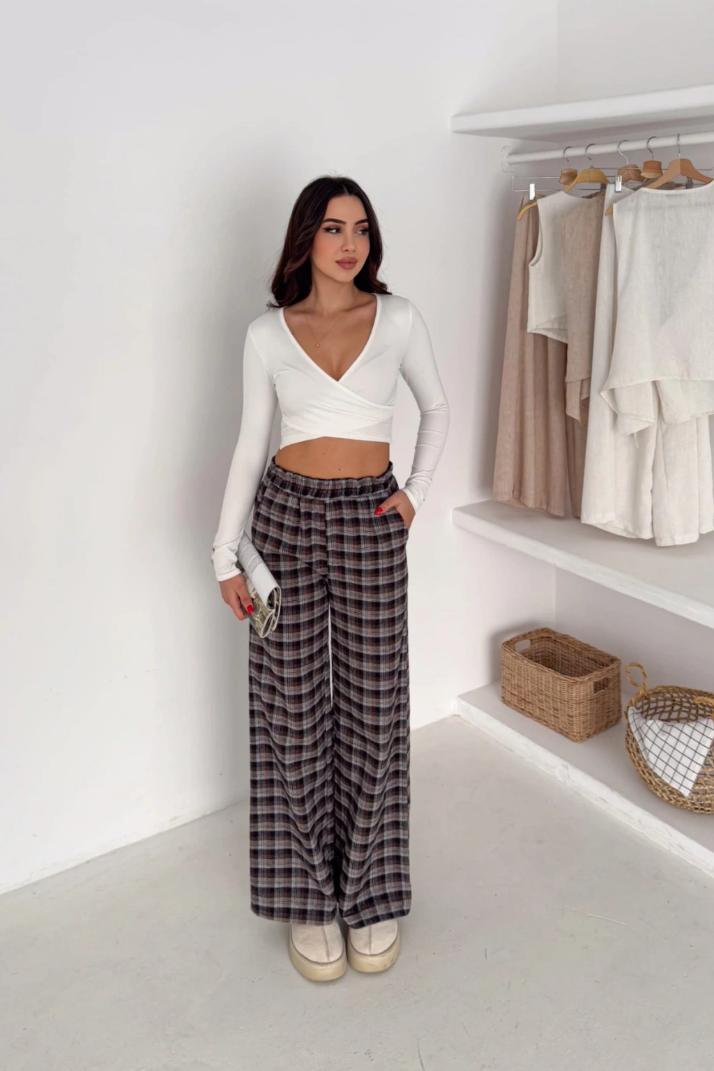 Kadın Ekose Yüksek Bel Palazzo Pantolon