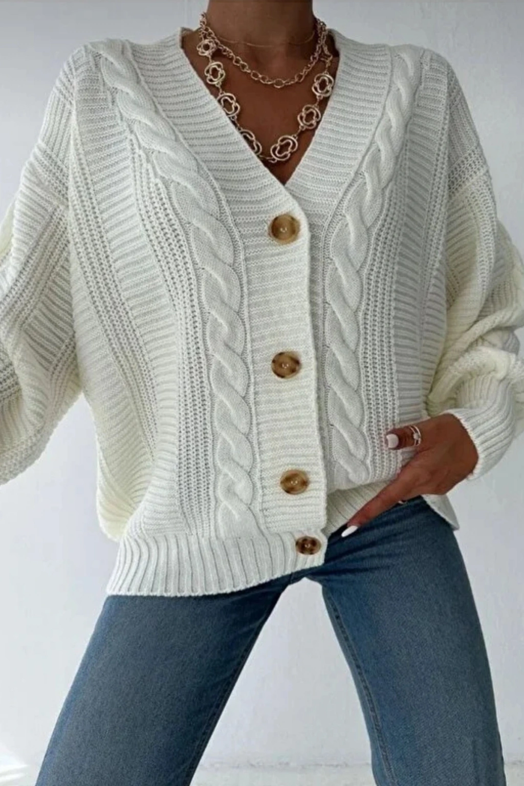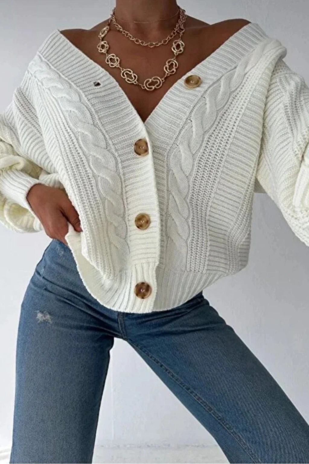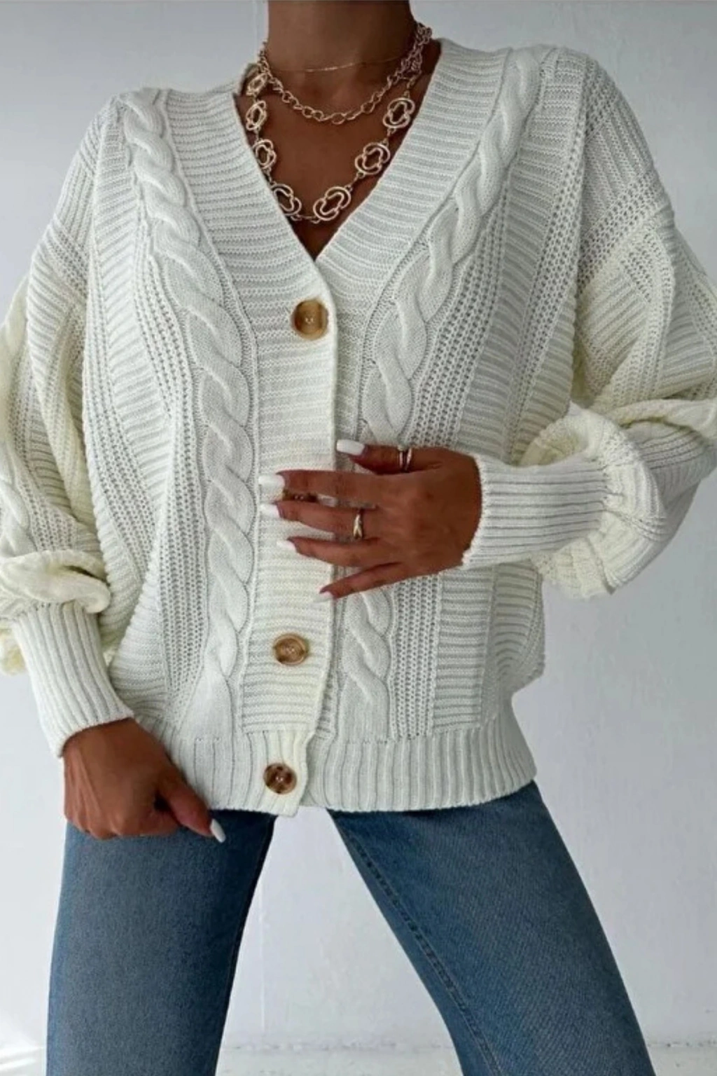 - Günlük kullanım için ideal, rahat ve şık bir tasarıma sahip saç örgü triko hırka.; - Uzun kollu yapısı ile mevsim geçişlerinde ideal sıcaklık sağlar.; - V yaka kesimi ile modern ve zarif bir görünüm sunar.; - Düğmeli kapama şekli, kolay kullanım ve şık bir detay katarken, cepsiz tasarımı minimalist bir stil oluşturur.; - Örgü dokuma tipi, dayanıklılığı ve konforu bir arada sunar.; - Oversize kalıbı sayesinde rahat hareket etme özgürlüğü verir.; - Cool & Comfort persona'ya hitap eden bu hırka, günlük yaşamınızda stilinizi korumanızı sağlar.; - TR menşeili olmasıyla yerel üretimden yana tercihinizi gösterir.; - Regular boyu ile farklı vücut tiplerine uyum sağlar.;