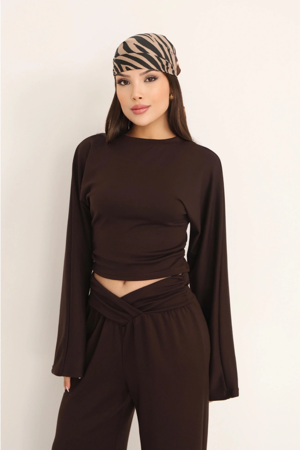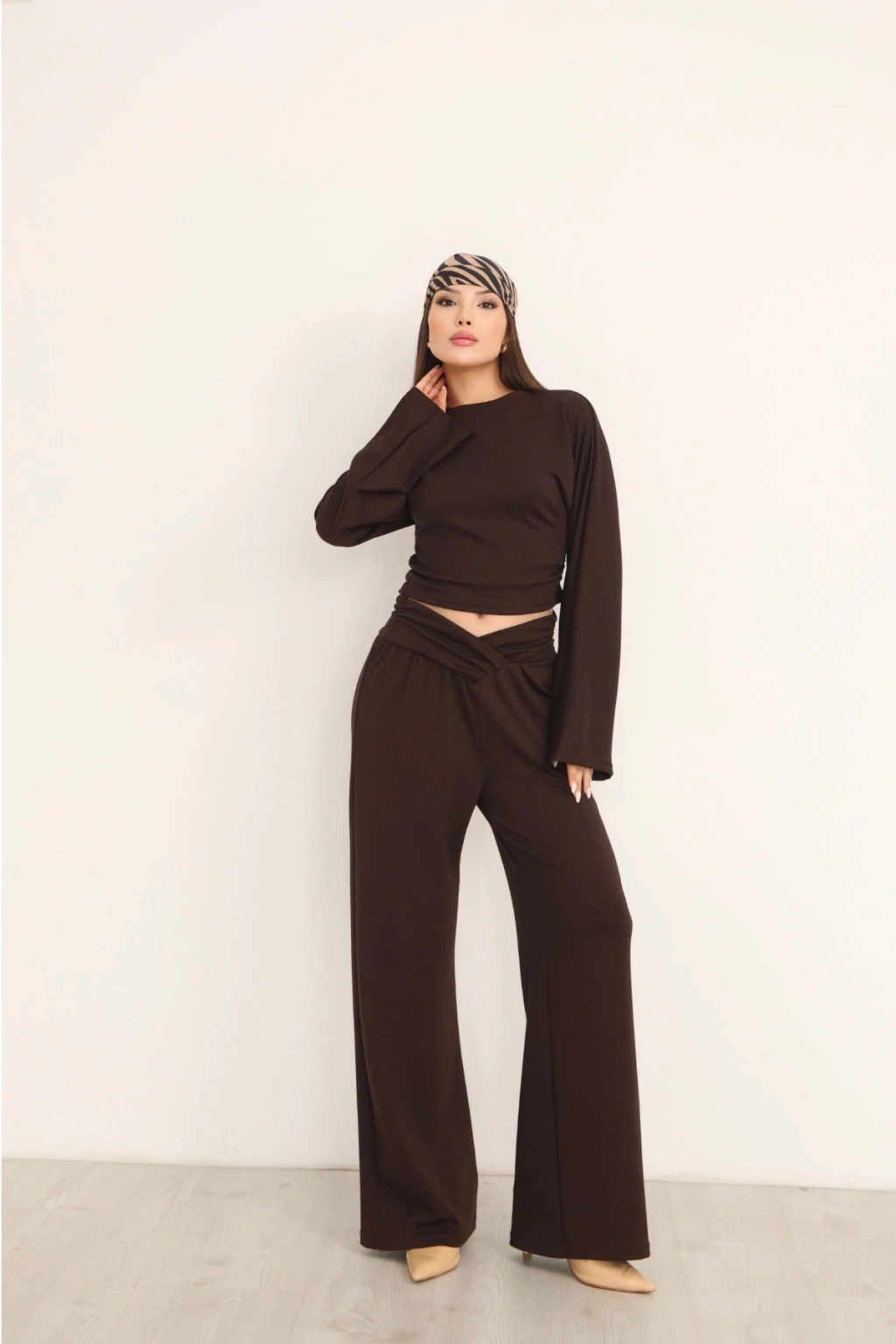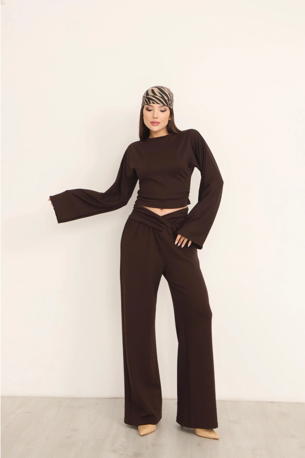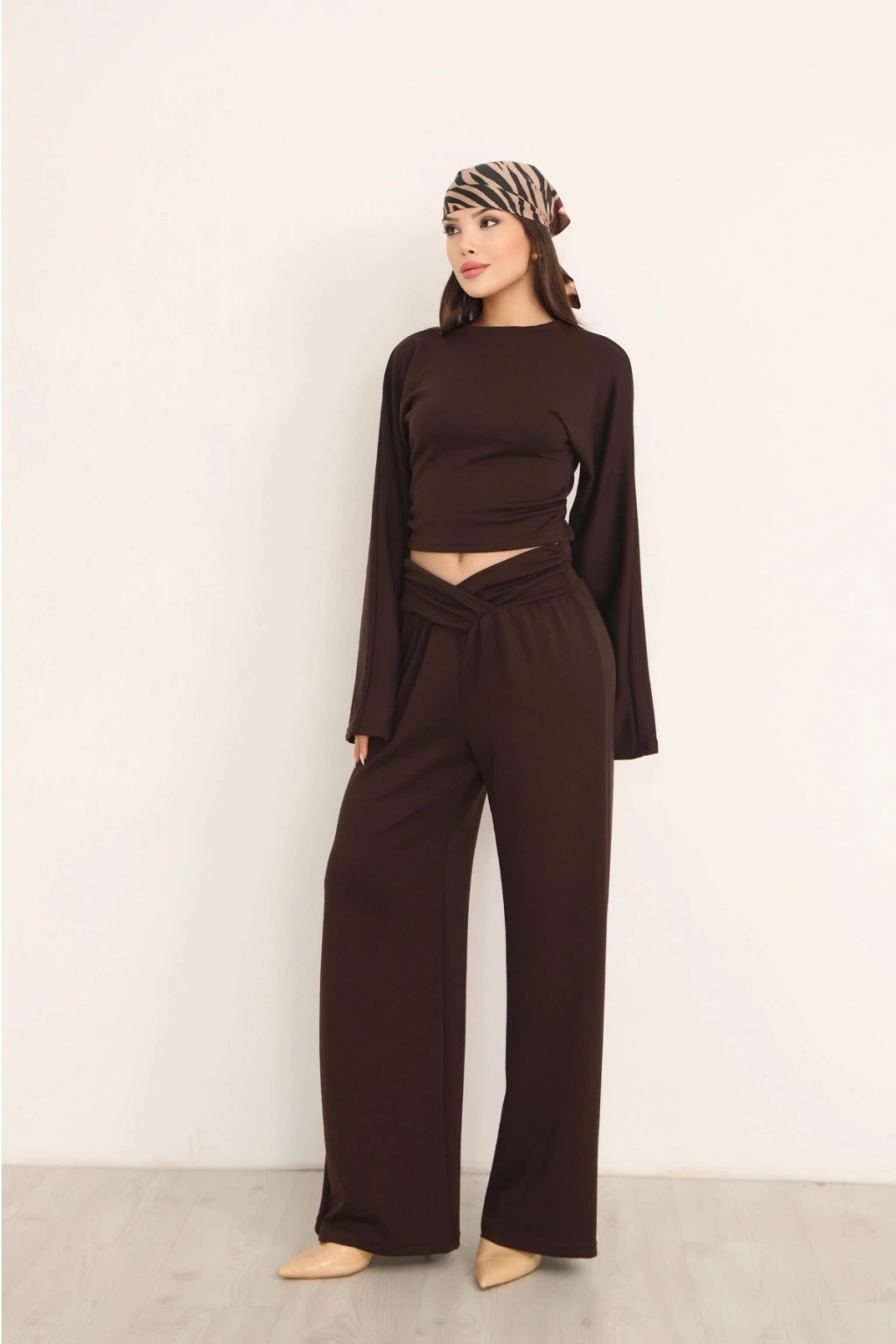 Kadın Kahverengi Çapraz Bel Palazzo Pantolonlu İkili Takım