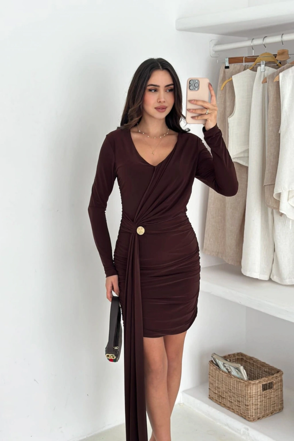 Kadın Kahverengi Sandy Drapeli Gold Toka Detaylı Mini Elbise