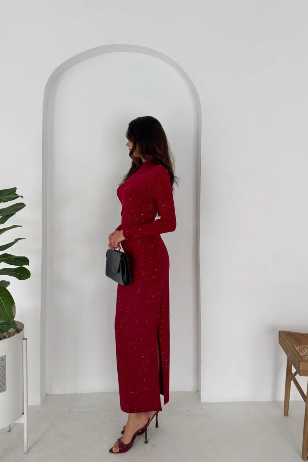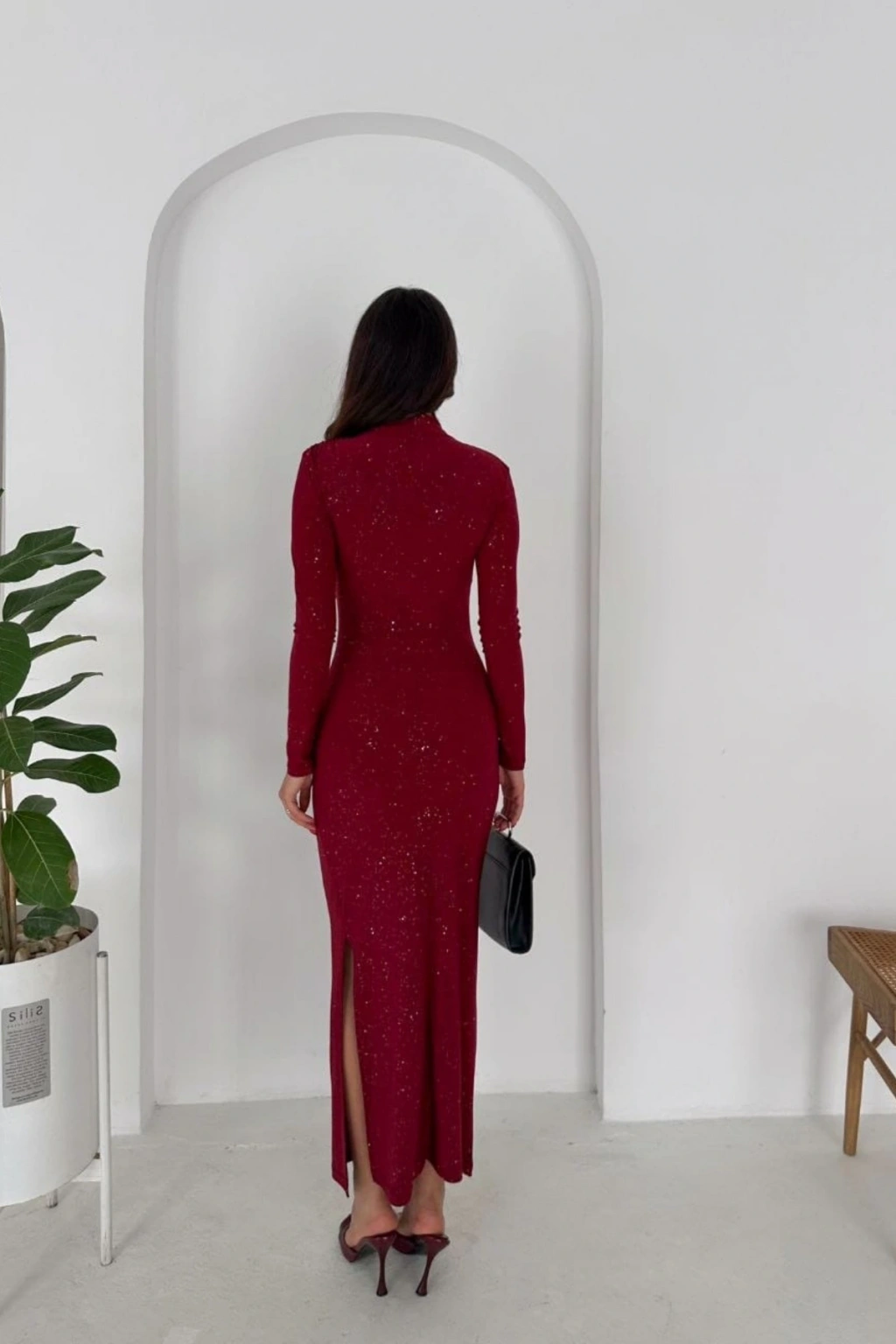 Kadın Kırmızı Uzun Kollu Yırtmaç Detaylı Simli Elbise