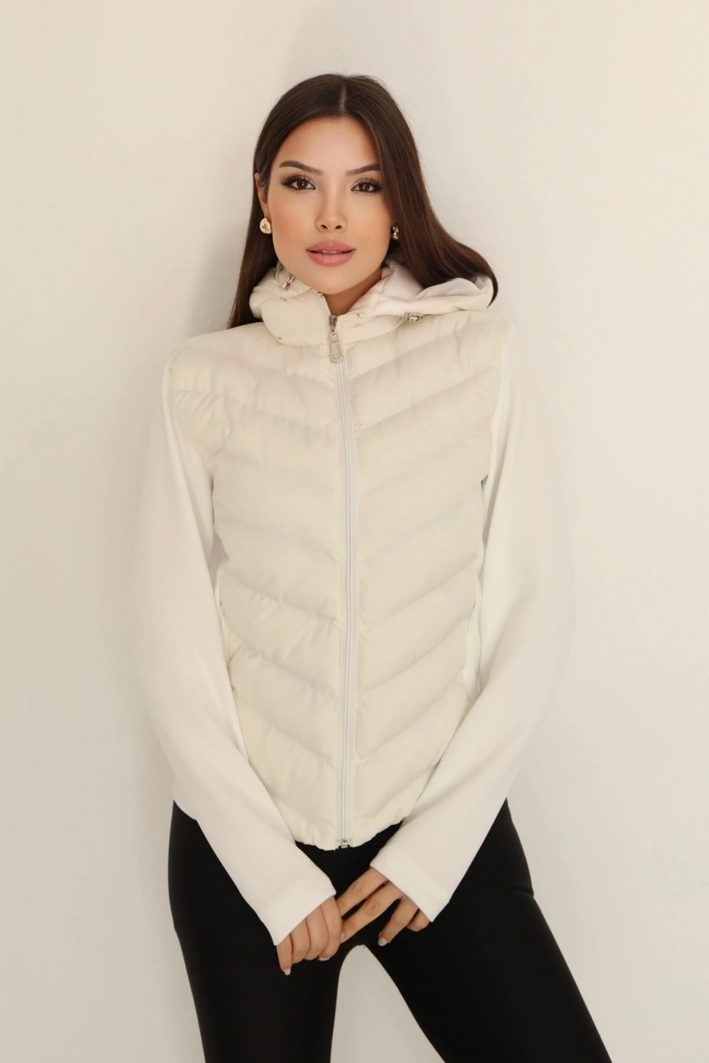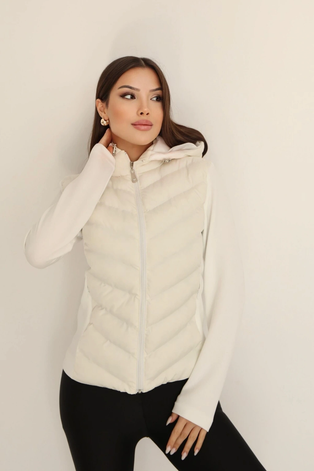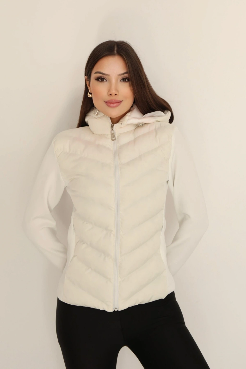 Kadın Krem Kapüşonlu Şişme Mont – Fermuarlı