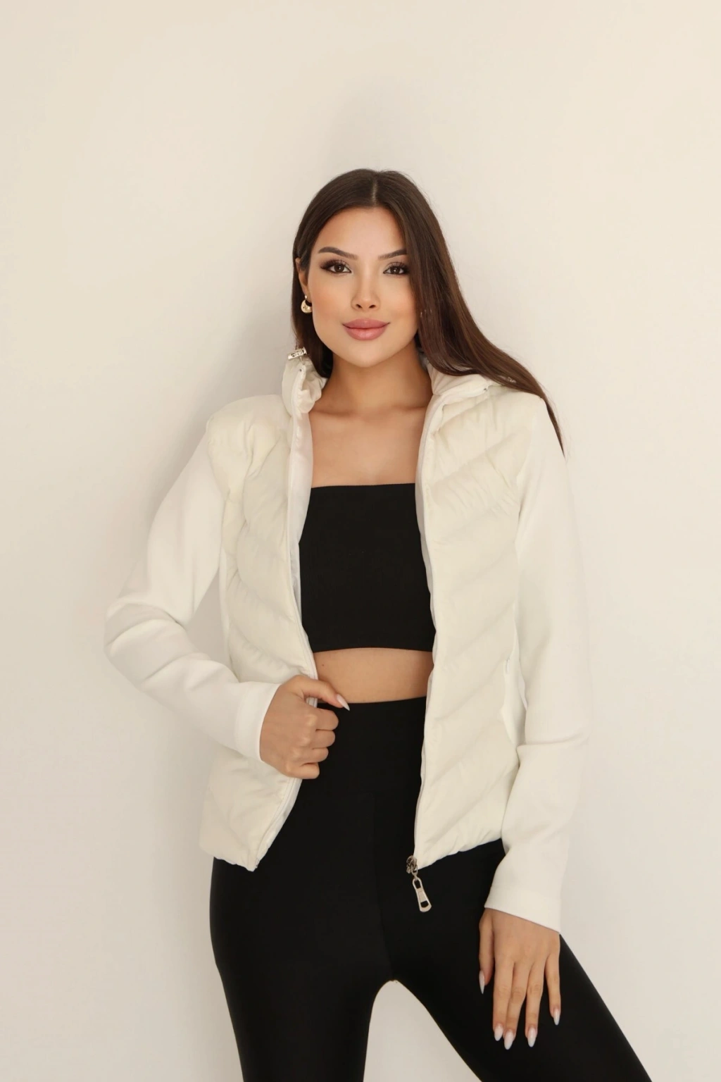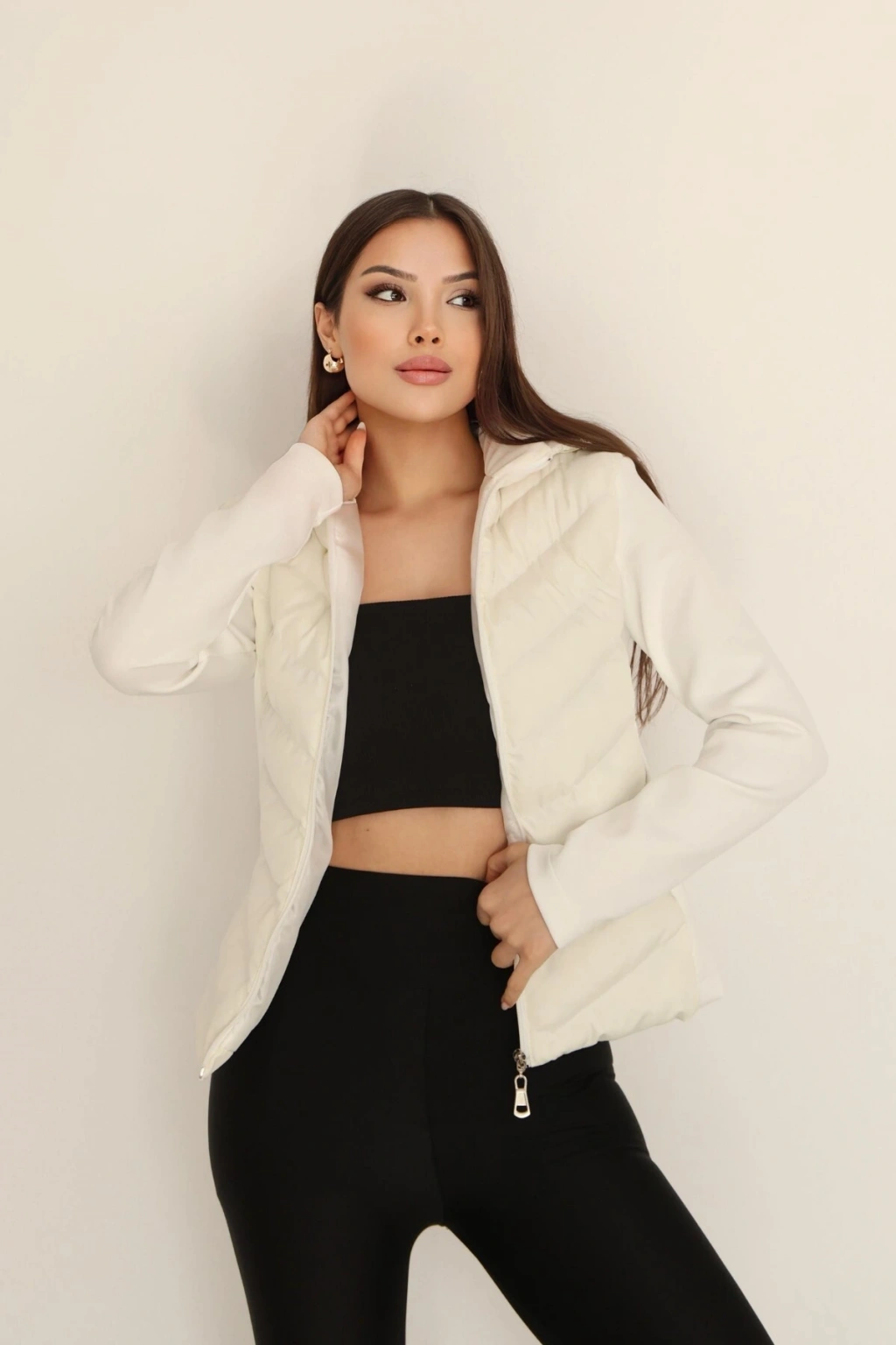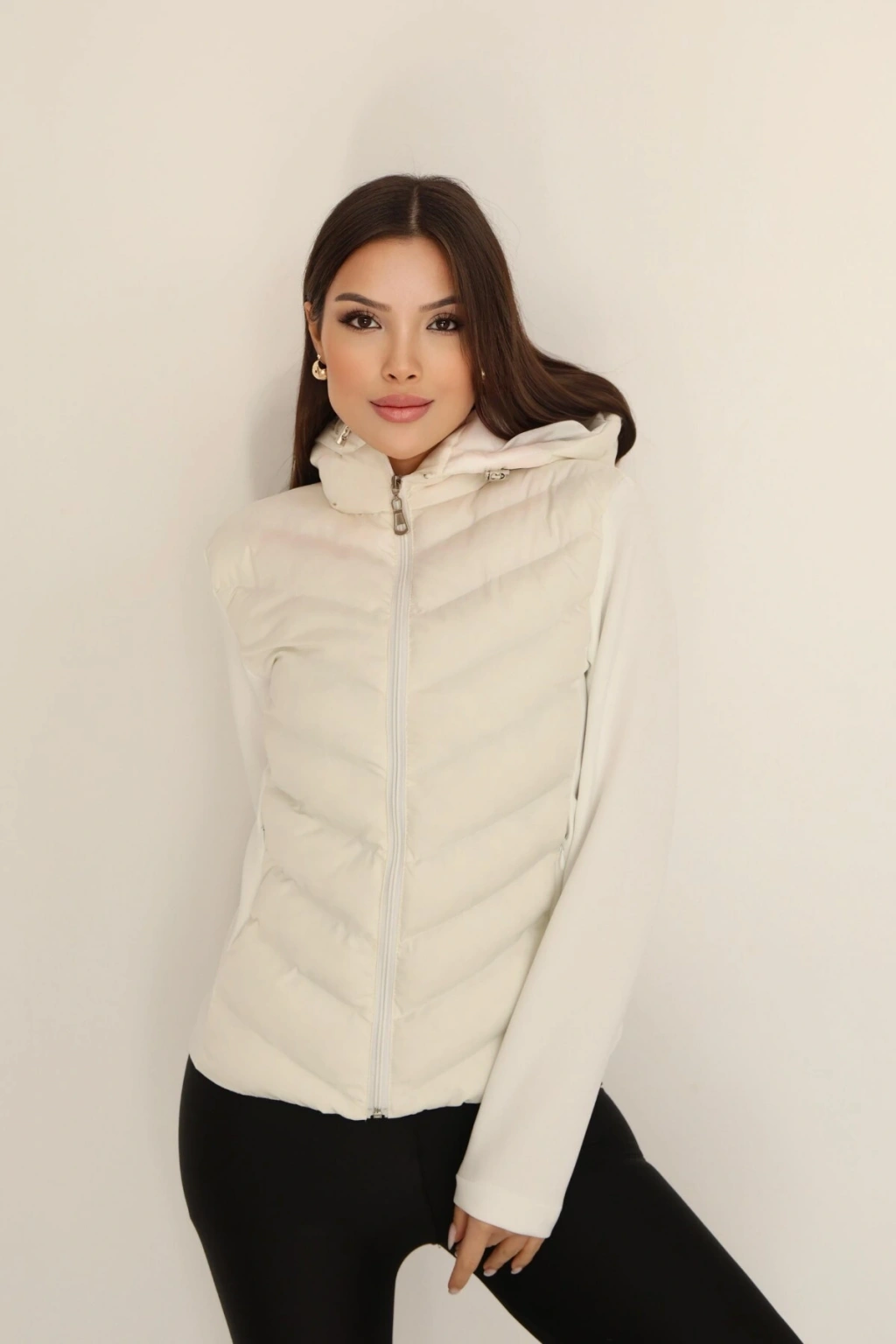 Kadın Krem Kapüşonlu Şişme Mont – Fermuarlı