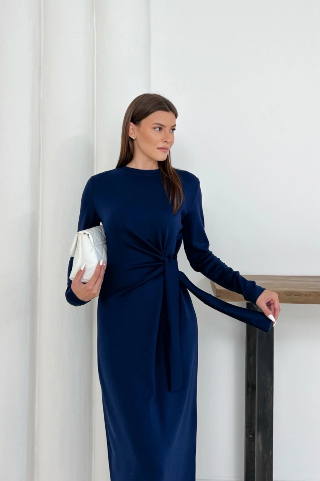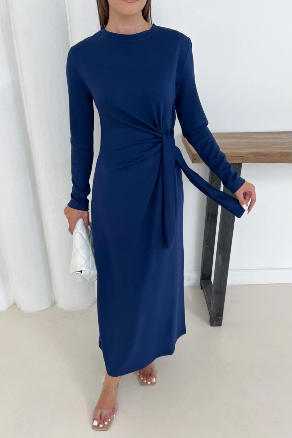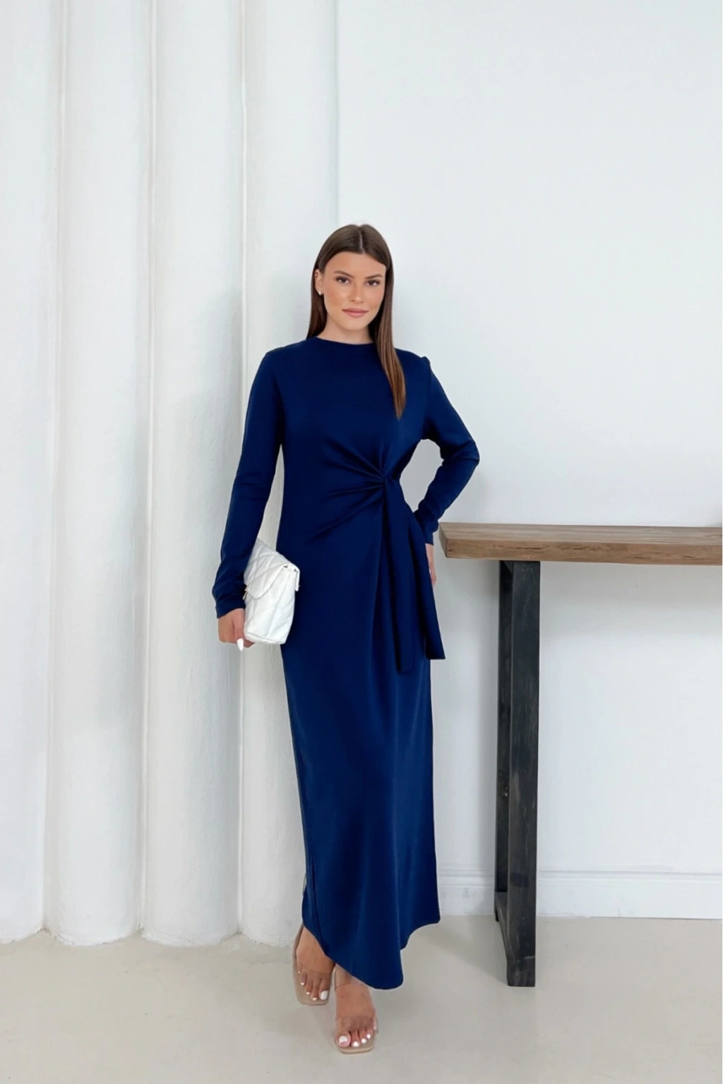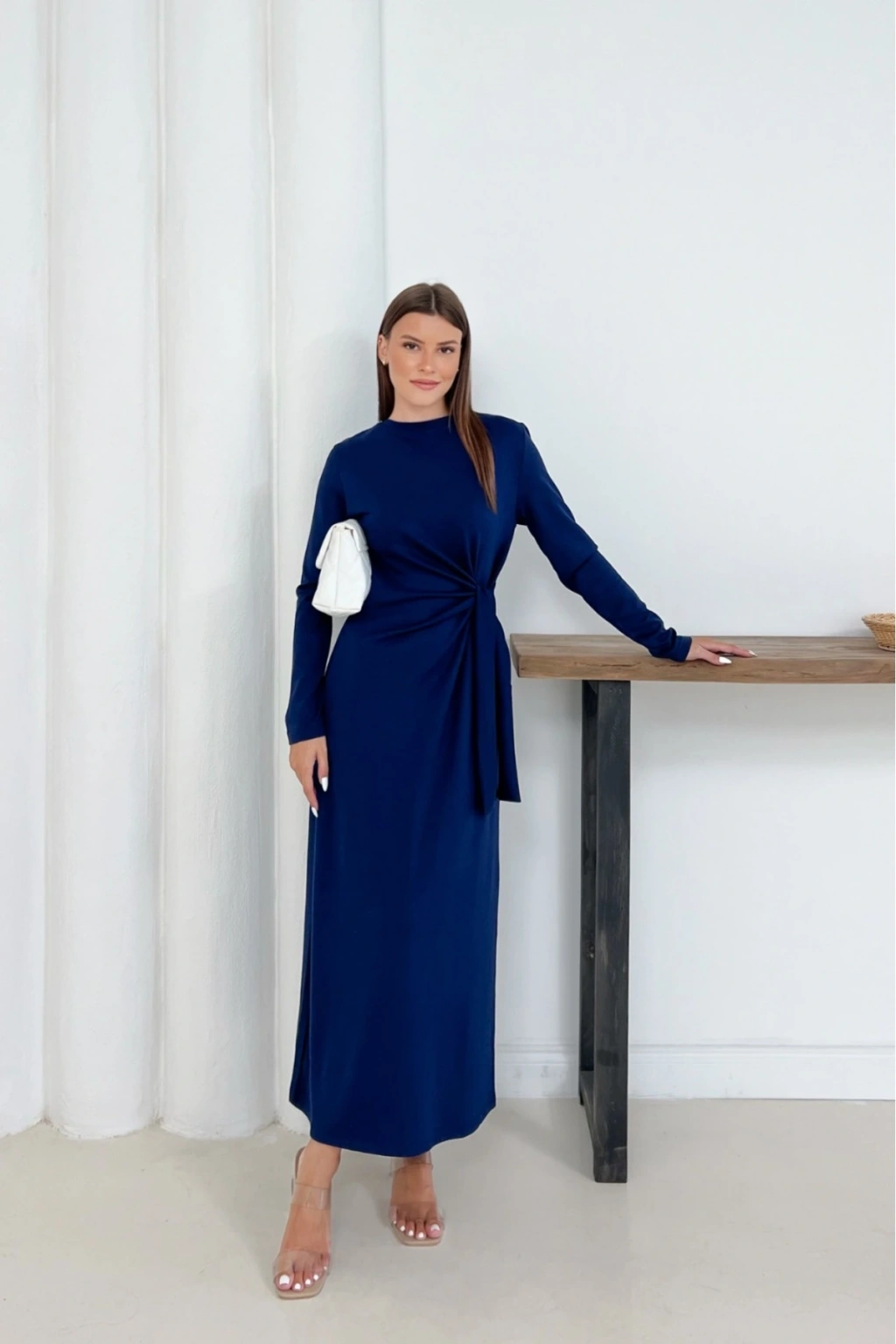 Kadın Lacivert Modal Kumaş Yandan Bağlama Detaylı Uzun Elbise