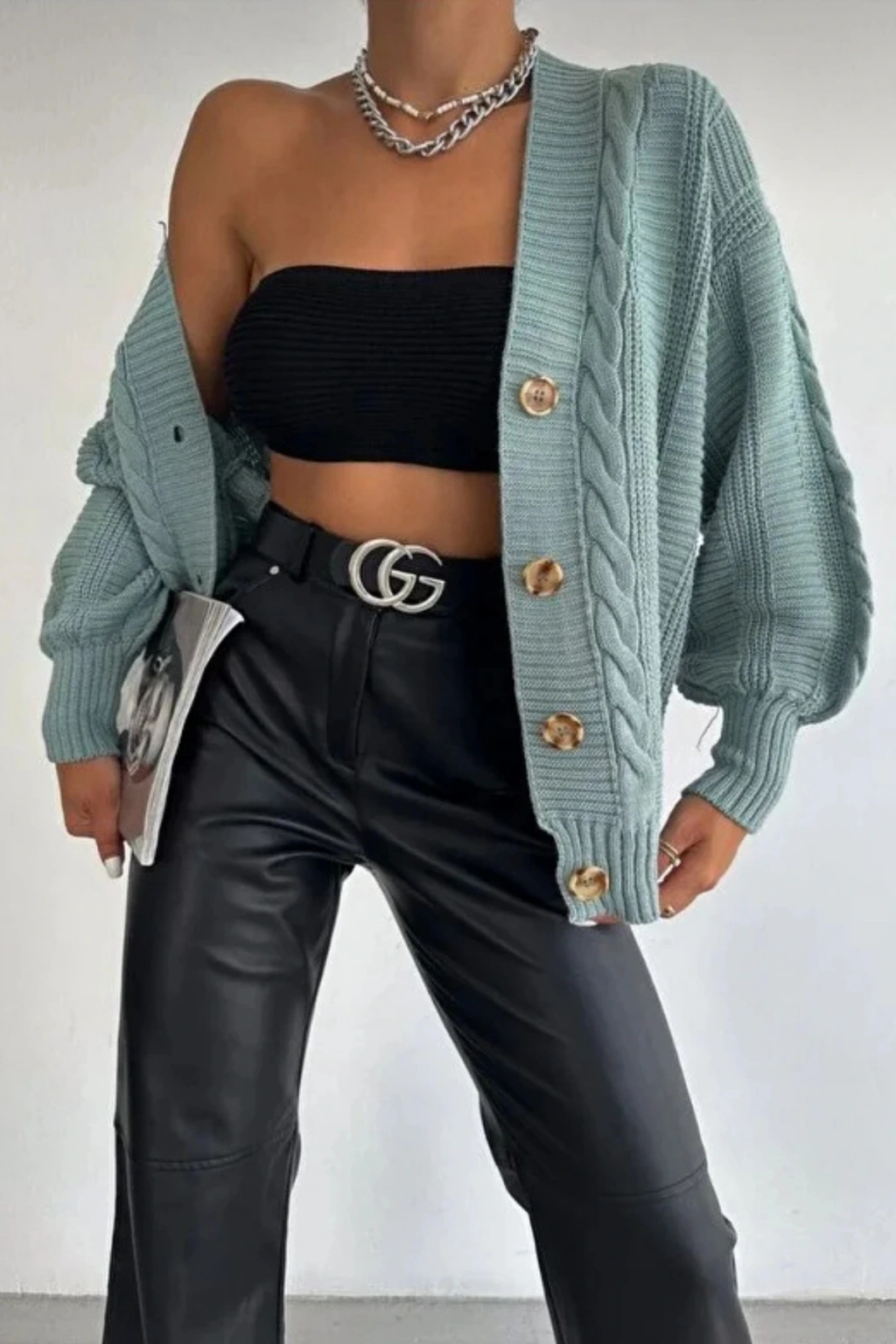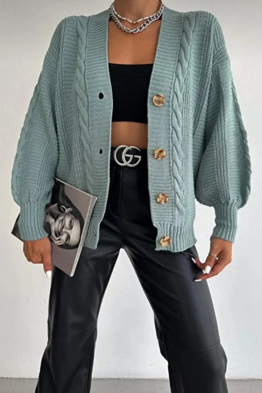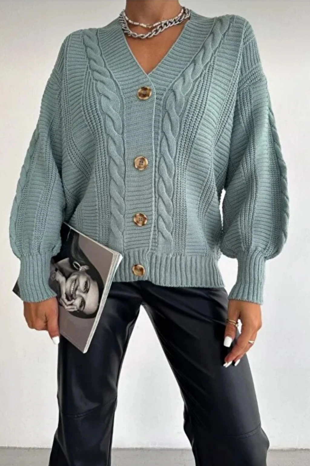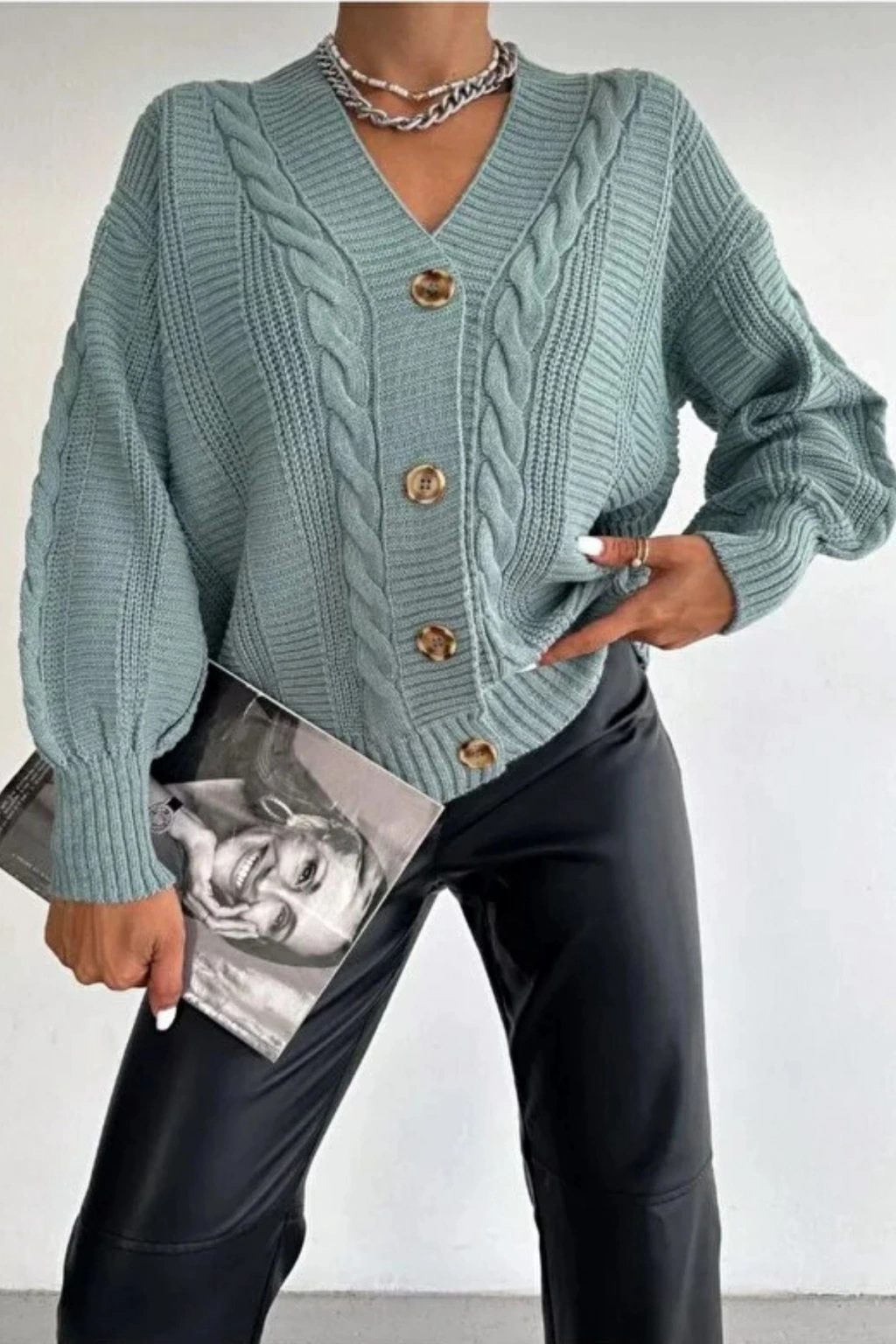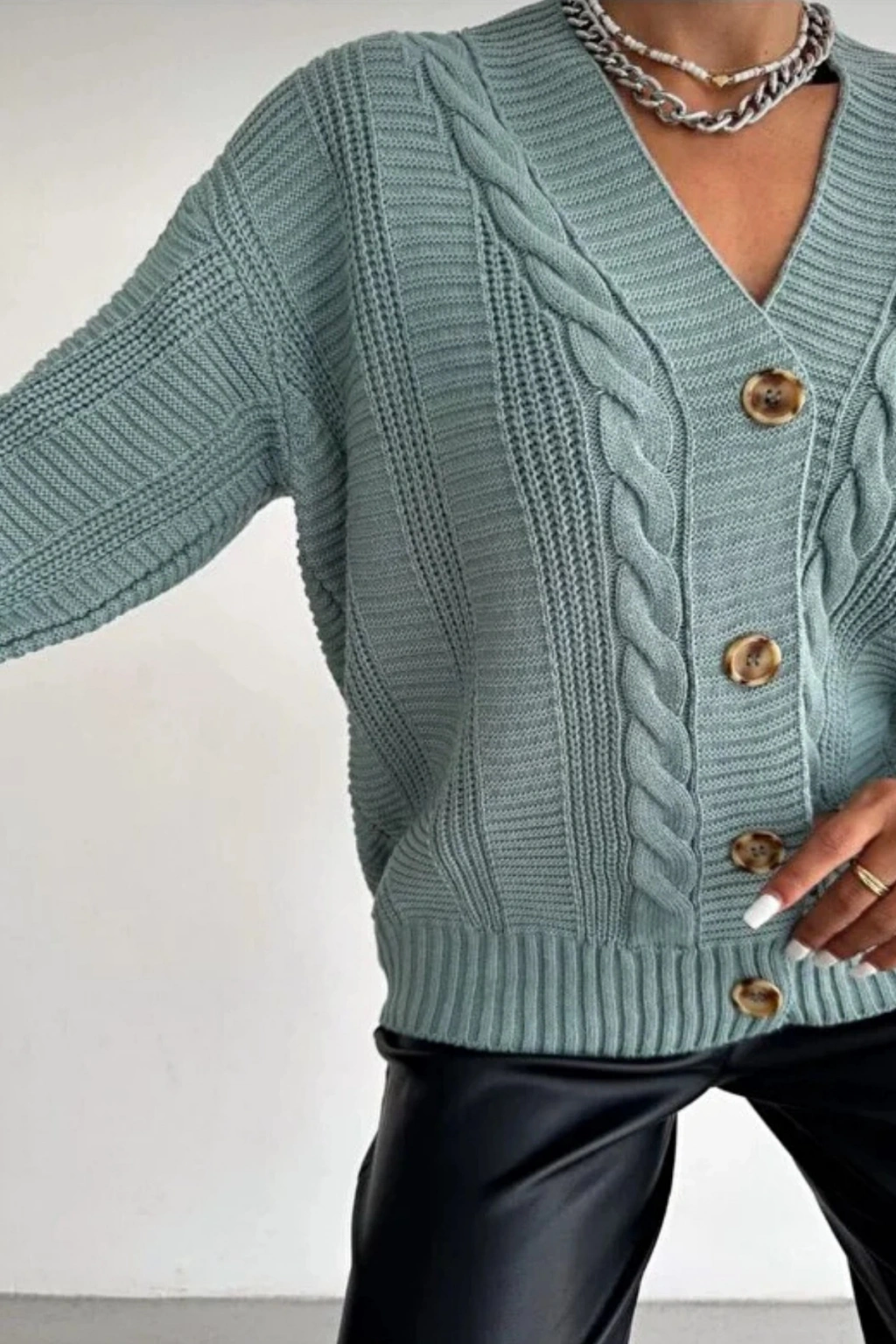 Kadın Mint V Yaka Düğmeli Saç Örgü Triko Hırka
