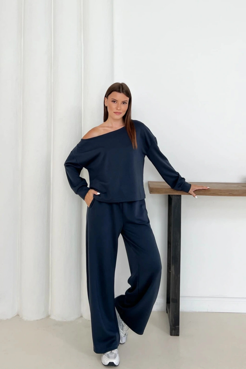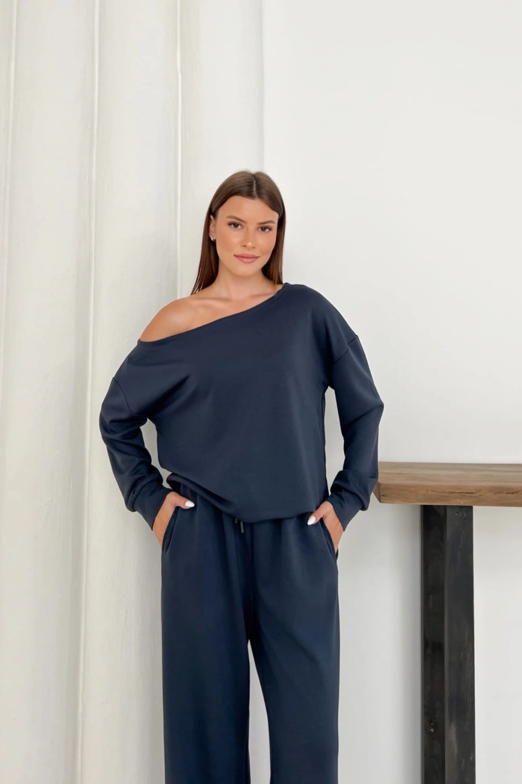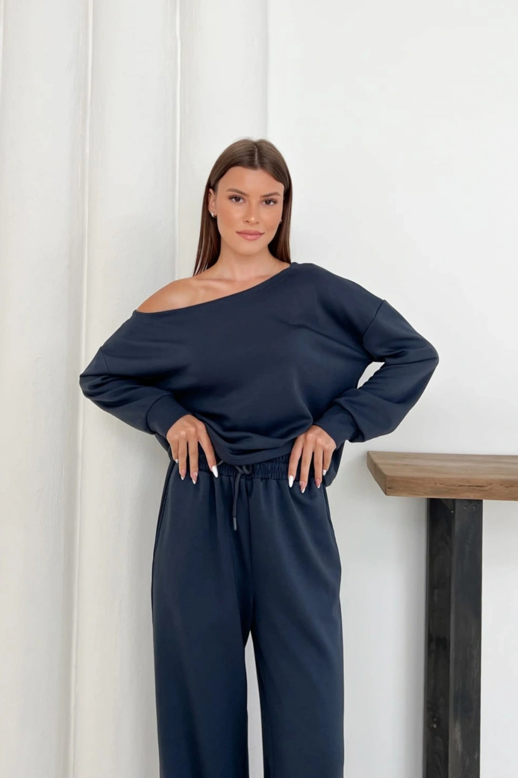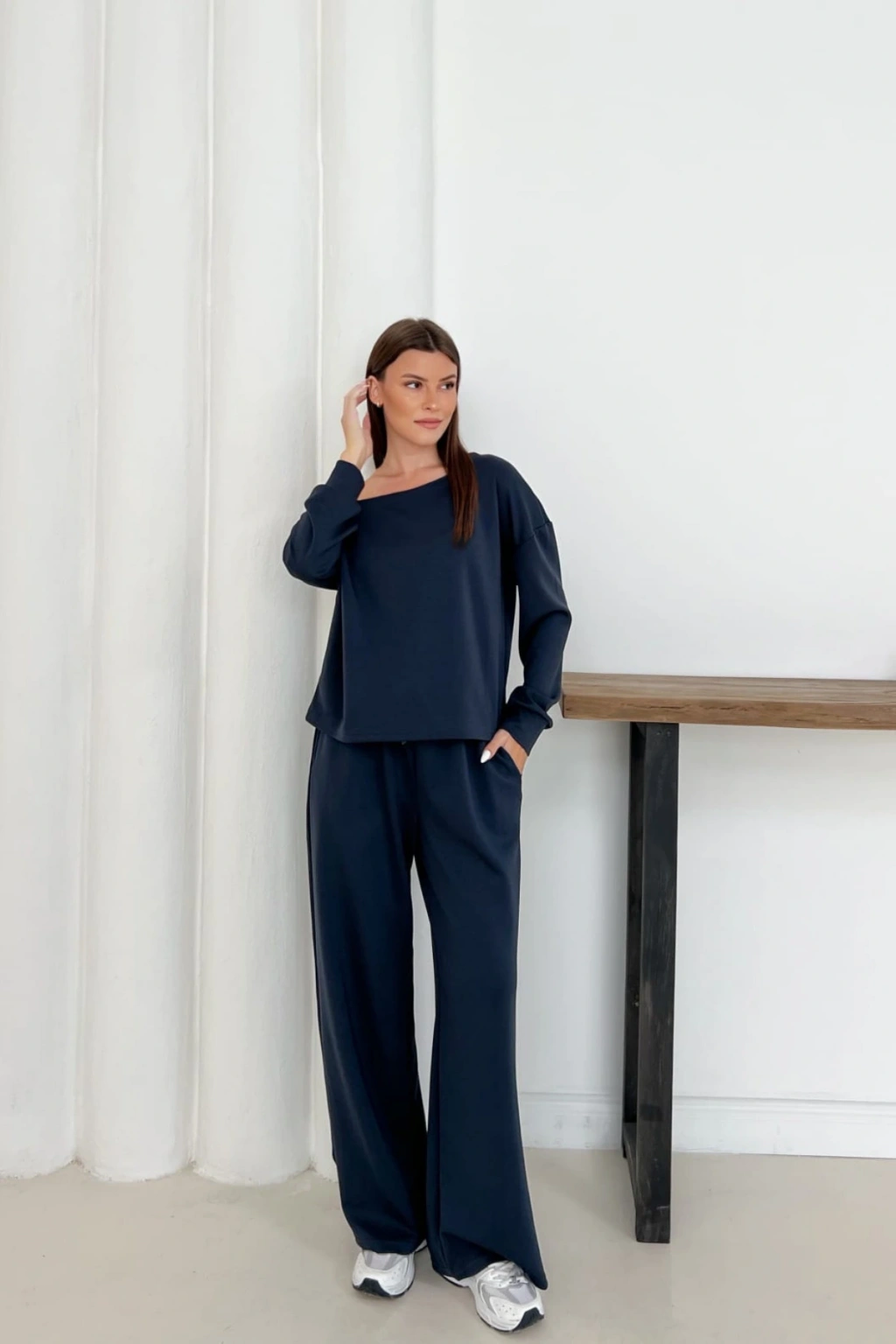 - Rahatlık ve şıklığı bir arada sunan modal kumaştan üretilmiş, günlük kullanım için ideal.; - Tek omuz tasarımı ile modern ve dinamik bir görünüm sağlar.; - Bağlama detayları sayesinde kolayca ayarlanabilir ve kişisel zevke göre şekillendirilebilir.; - Lastikli bel yapısı konforlu bir oturuş sunarken, geniş paça kesimi hareket özgürlüğü tanır.; - İki parçadan oluşan set; sweatshirt ve eşofmandan oluşarak kombinlerinizi tamamlamanızda pratiklik sağlar.; - Sade ve düz deseniyle her türlü üst giyimle uyum içinde olurken, casual tarza sahip her ortamda rahatlıkla tercih edilebilir.; - Pamuklu materyali cildinizle dost dokunuşlar sunarken, uzun süreli kullanımlarda bile formunu korur.; - Her mevsime uygun regular boy kesimiyle dört mevsim rahatlıkla giyilebilir.; - Günlük kullanım için ideal olan bu takım, casual stilinizi yansıtırken aynı zamanda konforundan ödün vermez.