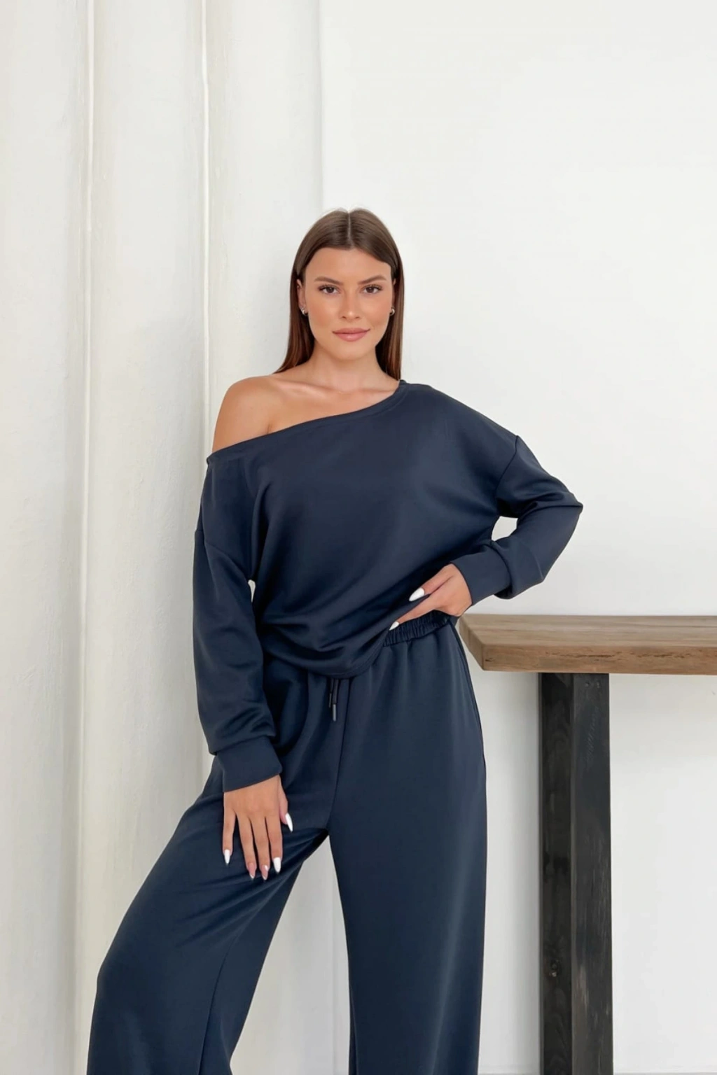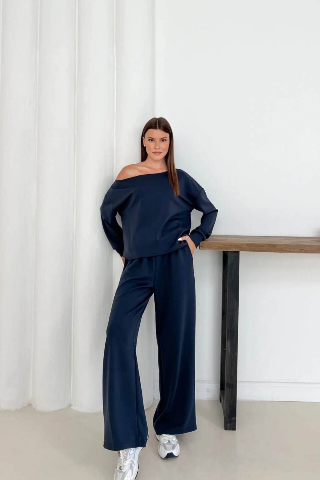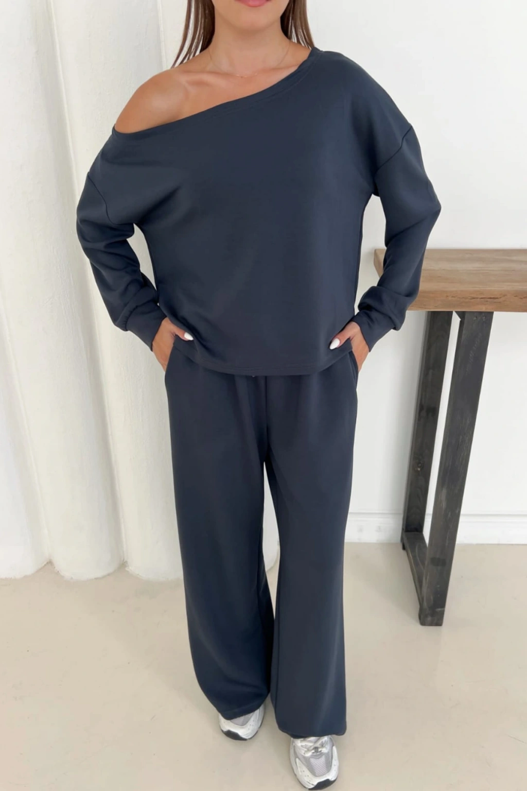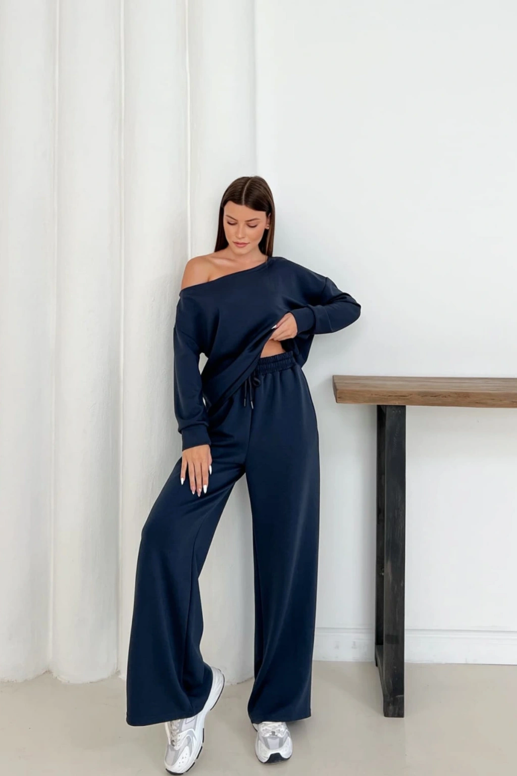 - Rahatlık ve şıklığı bir arada sunan modal kumaştan üretilmiş, günlük kullanım için ideal.; - Tek omuz tasarımı ile modern ve dinamik bir görünüm sağlar.; - Bağlama detayları sayesinde kolayca ayarlanabilir ve kişisel zevke göre şekillendirilebilir.; - Lastikli bel yapısı konforlu bir oturuş sunarken, geniş paça kesimi hareket özgürlüğü tanır.; - İki parçadan oluşan set; sweatshirt ve eşofmandan oluşarak kombinlerinizi tamamlamanızda pratiklik sağlar.; - Sade ve düz deseniyle her türlü üst giyimle uyum içinde olurken, casual tarza sahip her ortamda rahatlıkla tercih edilebilir.; - Pamuklu materyali cildinizle dost dokunuşlar sunarken, uzun süreli kullanımlarda bile formunu korur.; - Her mevsime uygun regular boy kesimiyle dört mevsim rahatlıkla giyilebilir.; - Günlük kullanım için ideal olan bu takım, casual stilinizi yansıtırken aynı zamanda konforundan ödün vermez.