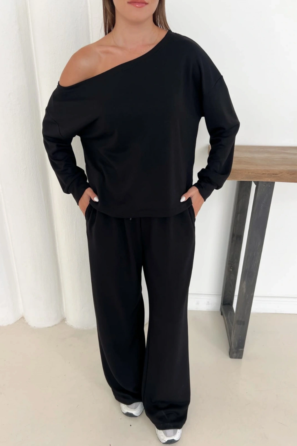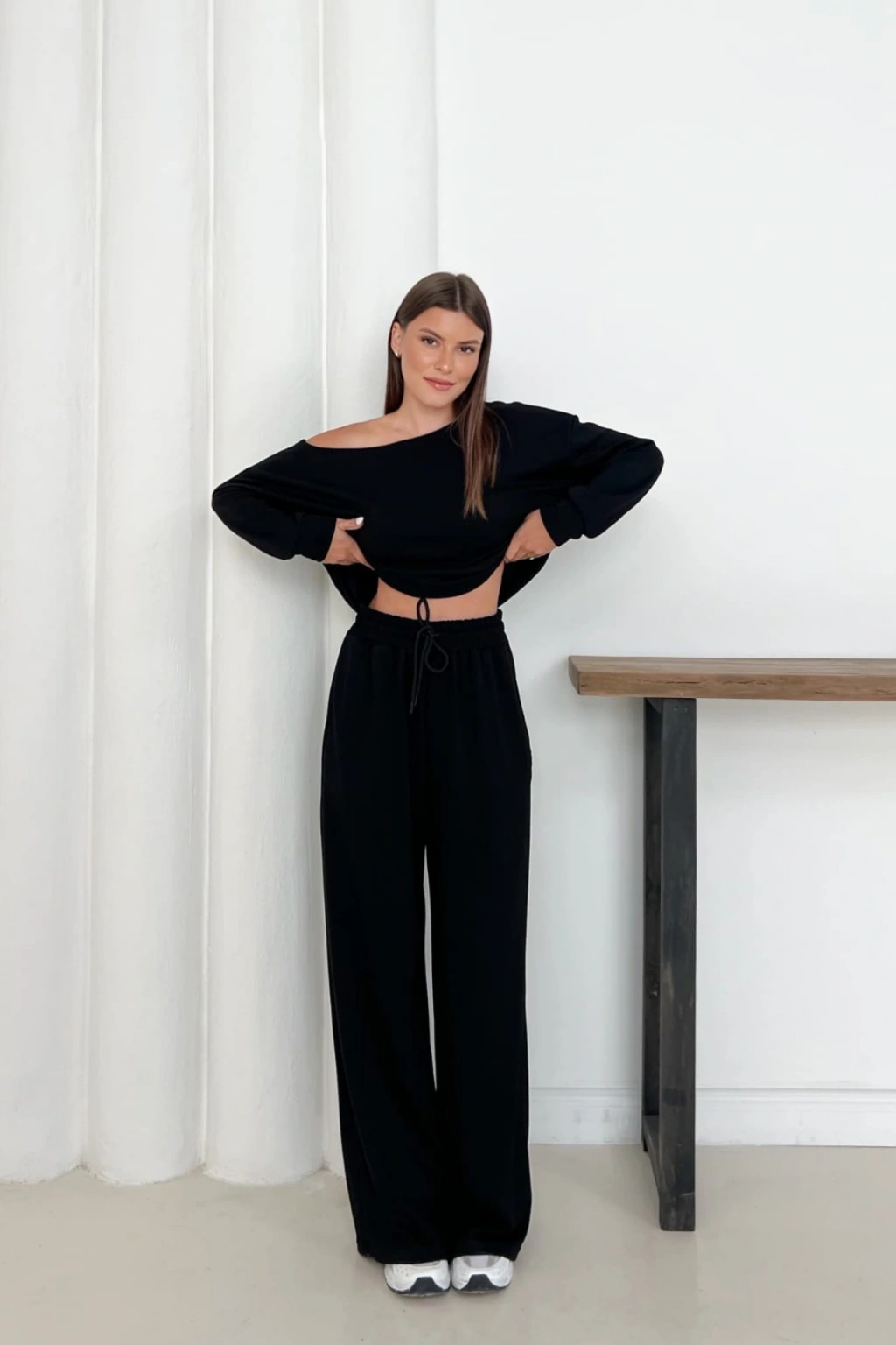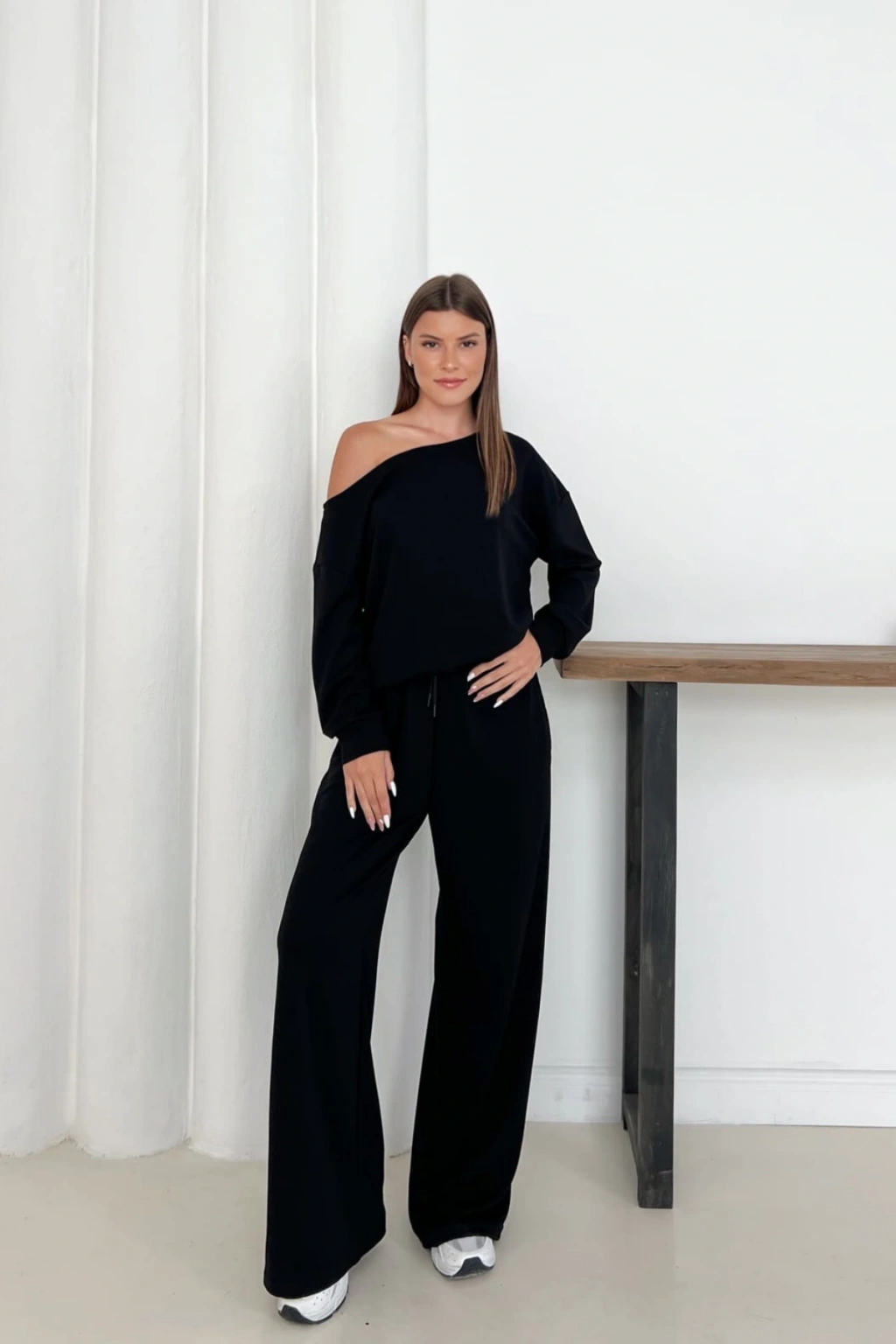 - Rahatlık ve şıklığı bir arada sunan modal kumaştan üretilmiş, günlük kullanım için ideal.; - Tek omuz tasarımı ile modern ve dinamik bir görünüm sağlar.; - Bağlama detayları sayesinde kolayca ayarlanabilir ve kişisel zevke göre şekillendirilebilir.; - Lastikli bel yapısı konforlu bir oturuş sunarken, geniş paça kesimi hareket özgürlüğü tanır.; - İki parçadan oluşan set; sweatshirt ve eşofmandan oluşarak kombinlerinizi tamamlamanızda pratiklik sağlar.; - Sade ve düz deseniyle her türlü üst giyimle uyum içinde olurken, casual tarza sahip her ortamda rahatlıkla tercih edilebilir.; - Pamuklu materyali cildinizle dost dokunuşlar sunarken, uzun süreli kullanımlarda bile formunu korur.; - Her mevsime uygun regular boy kesimiyle dört mevsim rahatlıkla giyilebilir.; - Günlük kullanım için ideal olan bu takım, casual stilinizi yansıtırken aynı zamanda konforundan ödün vermez.