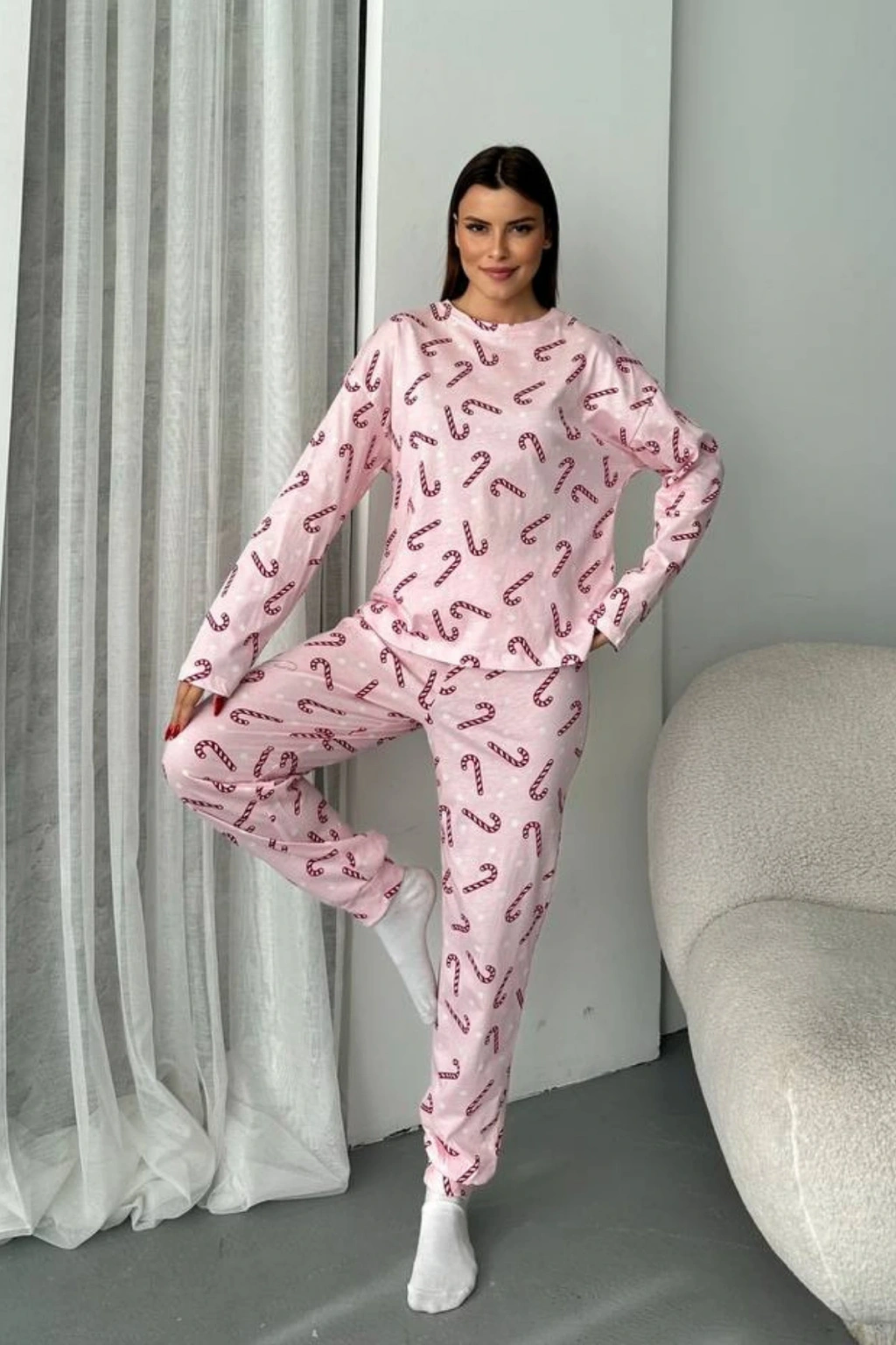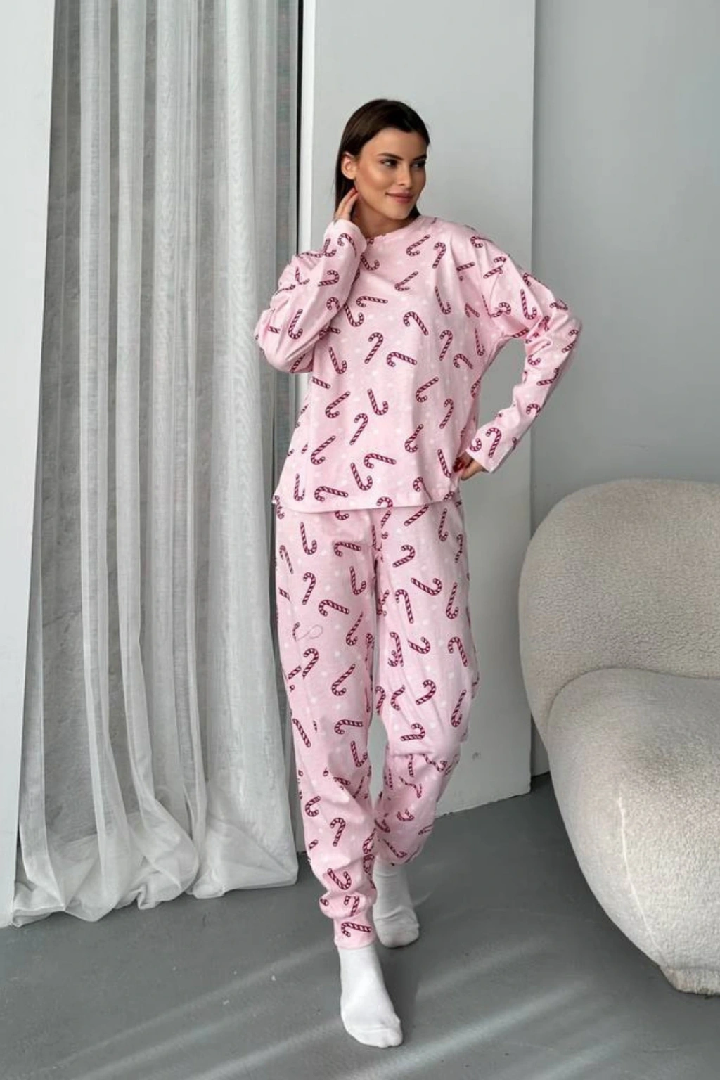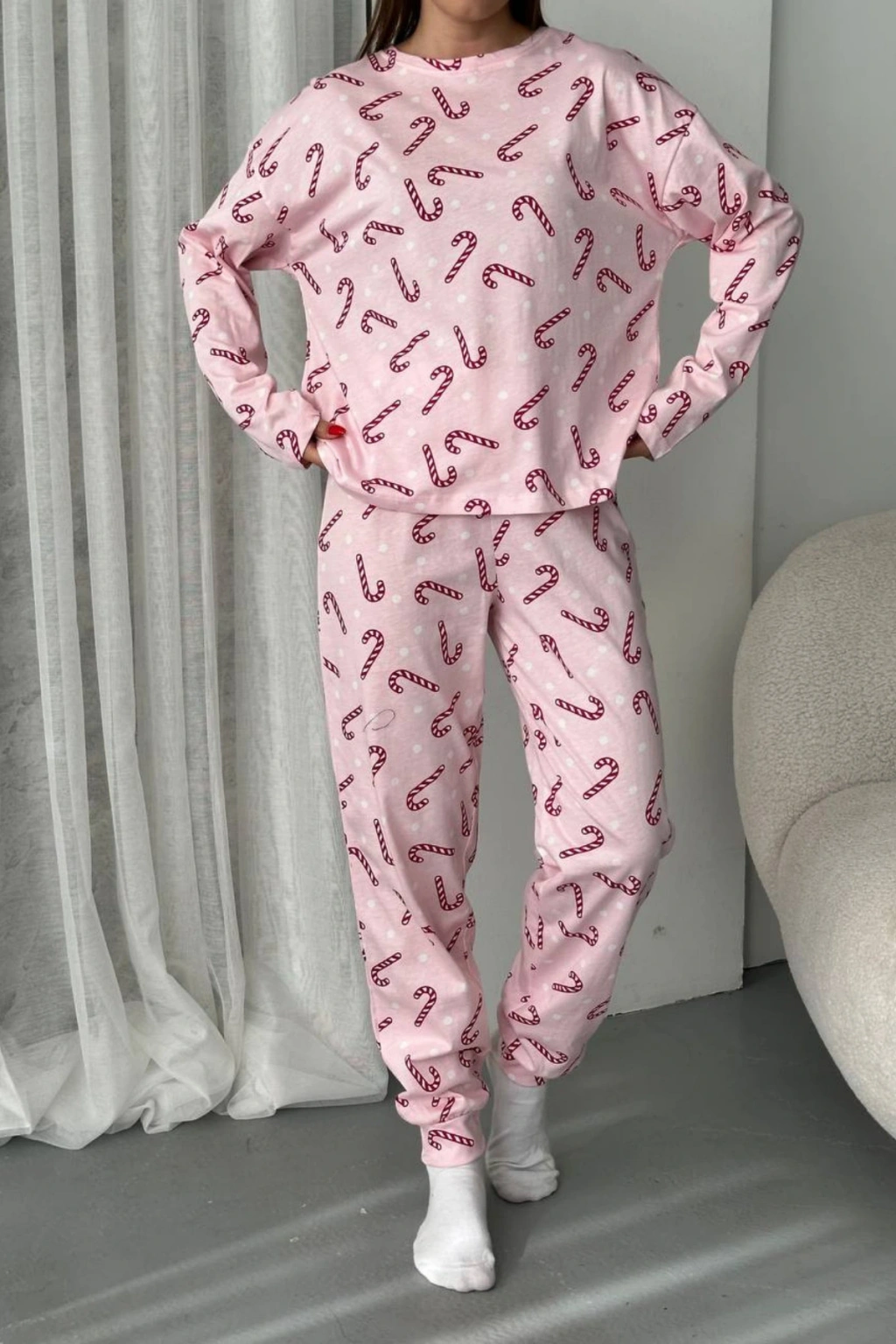 Kadın Şeker Desenli Alt Üst Pijama Takımı-Pembe