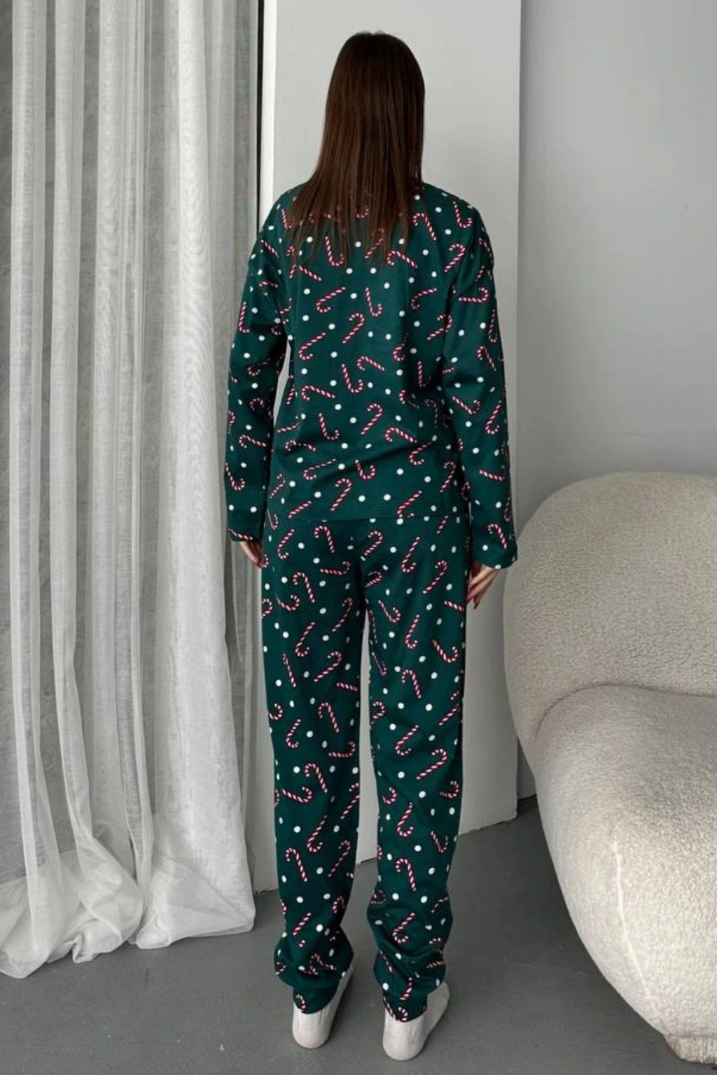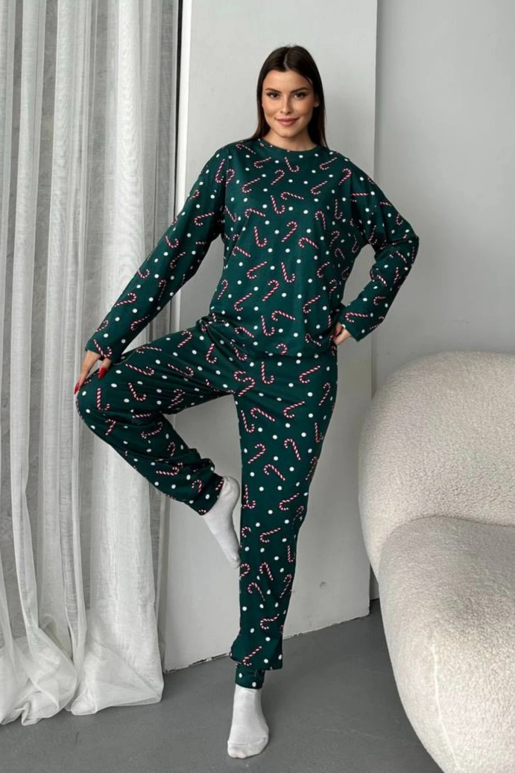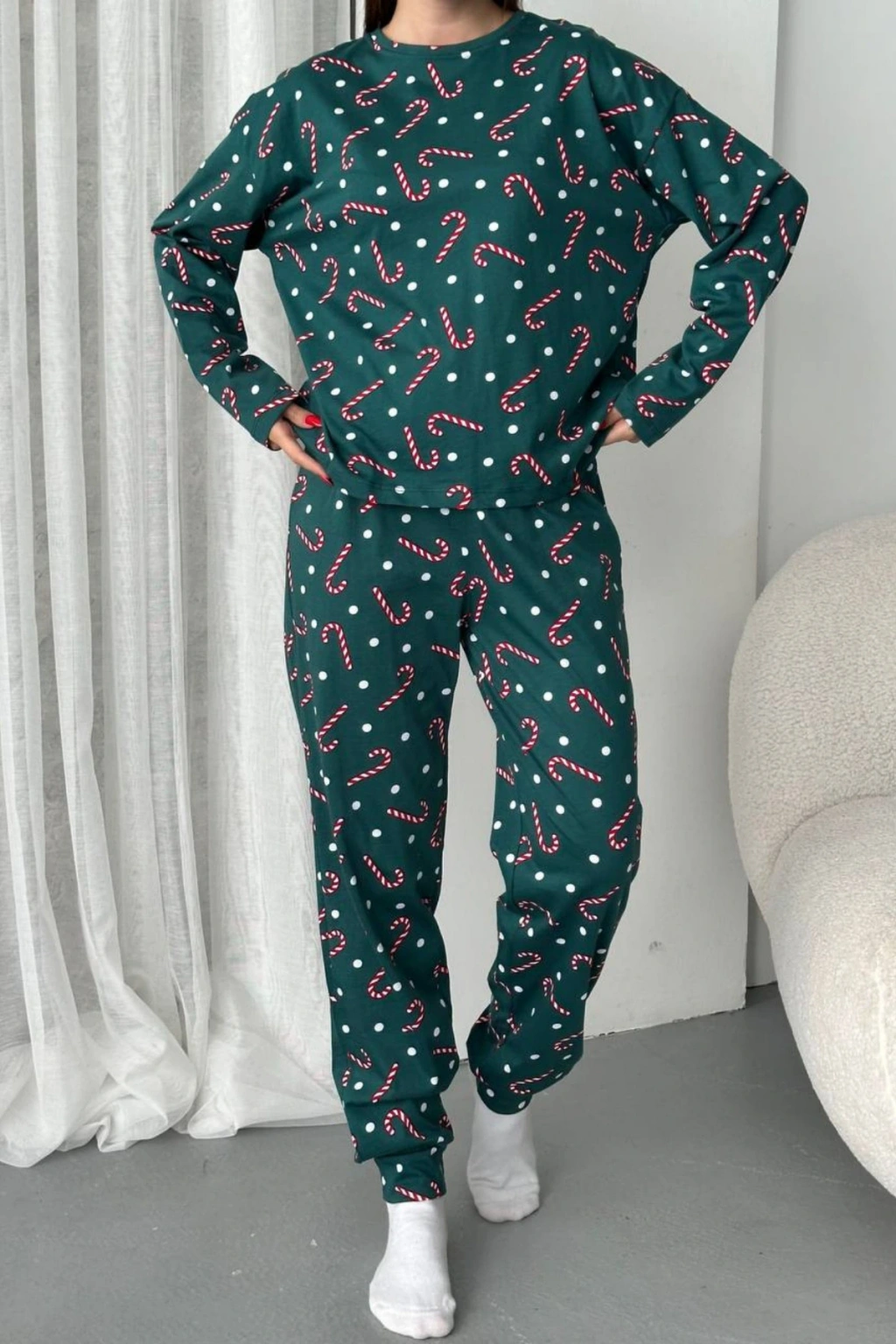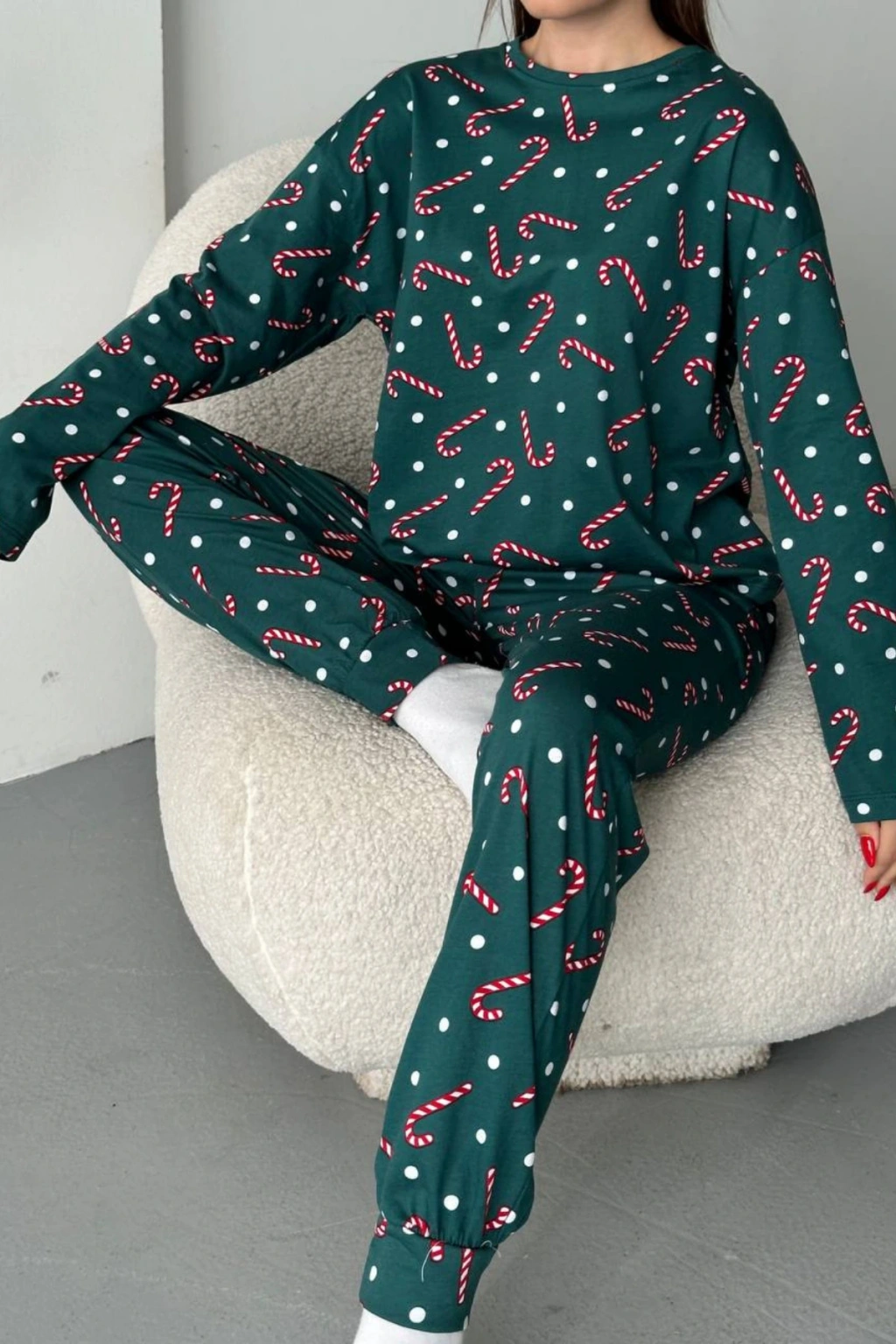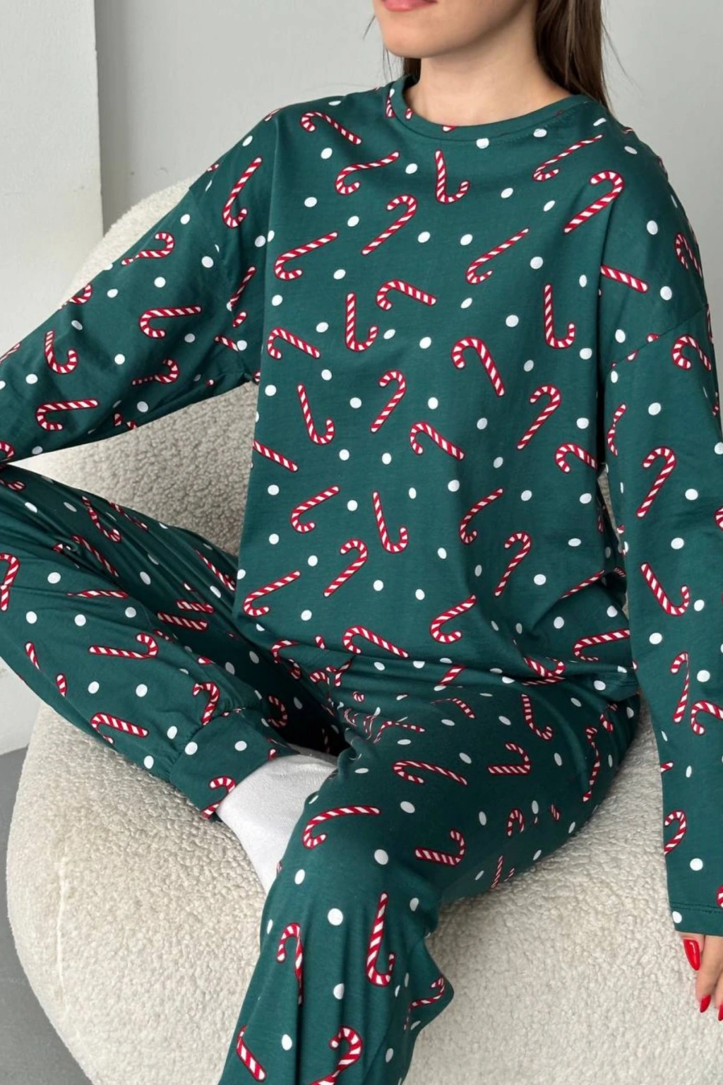 - Şeker desenli tasarımı ile göz alıcı bir görünüm sunar ve günlük kullanım için idealdir.; - Uzun paça boyu ve dar paça kesimi sayesinde rahat bir hareket alanı sağlar.; - Süprem dokuma tipi, yumuşak dokusuyla konforlu bir kullanım vaat eder.; - Casual koleksiyonunun bir parçası olarak, evde ya da lounge ortamında rahatlıkla tercih edilebilir.; - Uzun kollu tasarımı ile mevsim geçişlerinde de sıcak tutar ve şıklığı korur.; - Bisiklet yaka detayı modern ve sade bir stil oluştururken, tüm sezonlar için uygundur.; - %100 pamuk materyali cildin nefes almasını sağlar ve uzun süreli kullanım için idealdir.; - 2'li paket içeriği ile hem üst hem de alt parçayı içeren tam bir pijama takımı sunar.; - Normal bel kesimi ile vücut hatlarınıza uyum sağlar ve rahat bir oturuş sunar.; - Yetişkin yaş grubuna hitap eden regular kalıbı, her bedene uygunluk gösterir.; - Türkiye menşeli olmasıyla yerel üretim desteklenmiş olup, kalite standartlarına uygun üretilmiştir.;