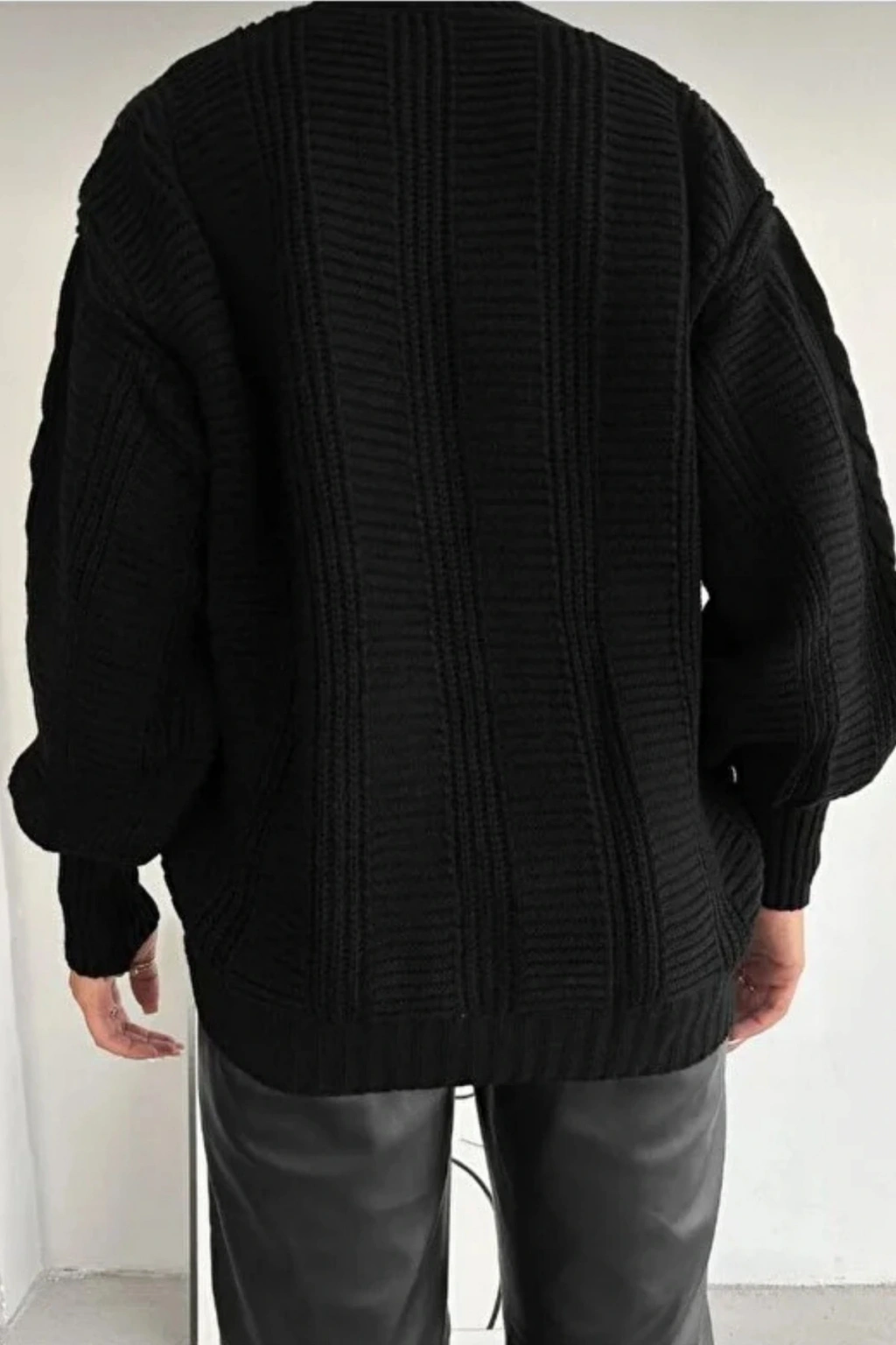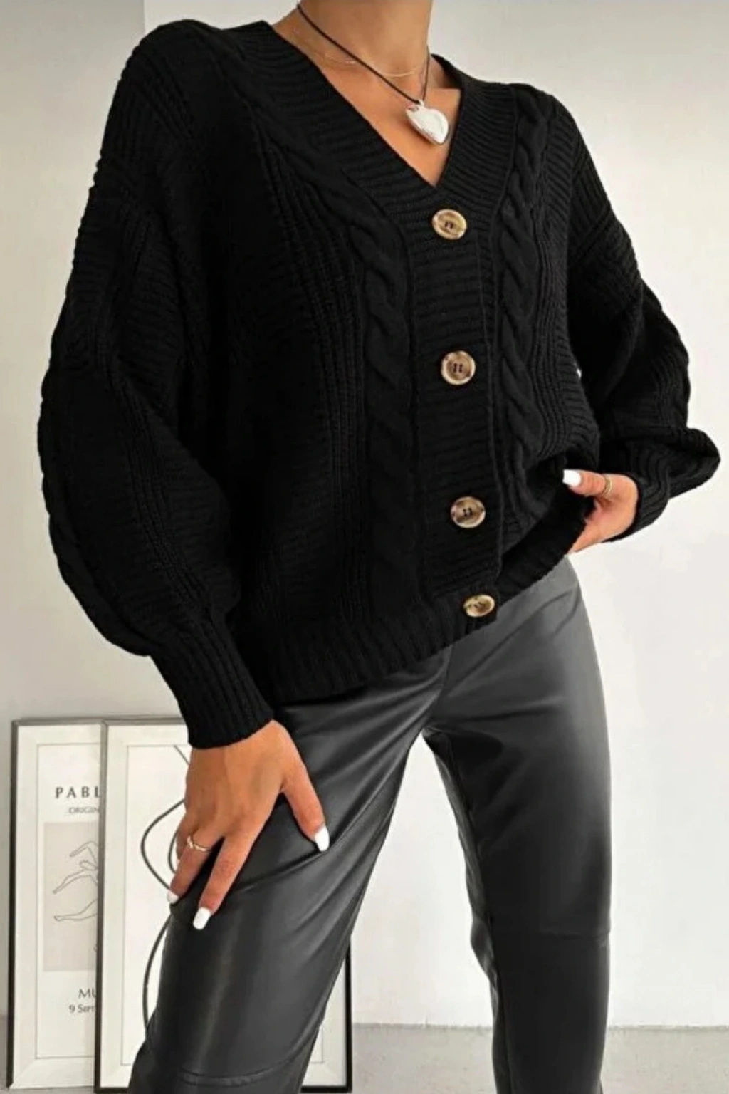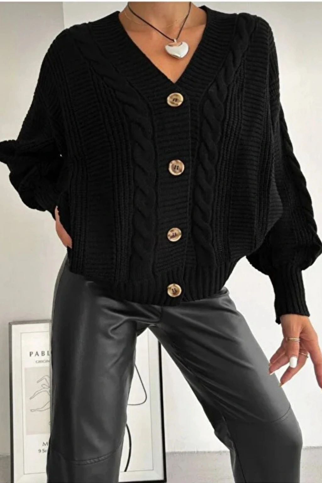 Kadın Siyah V Yaka Düğmeli Saç Örgü Triko Hırka