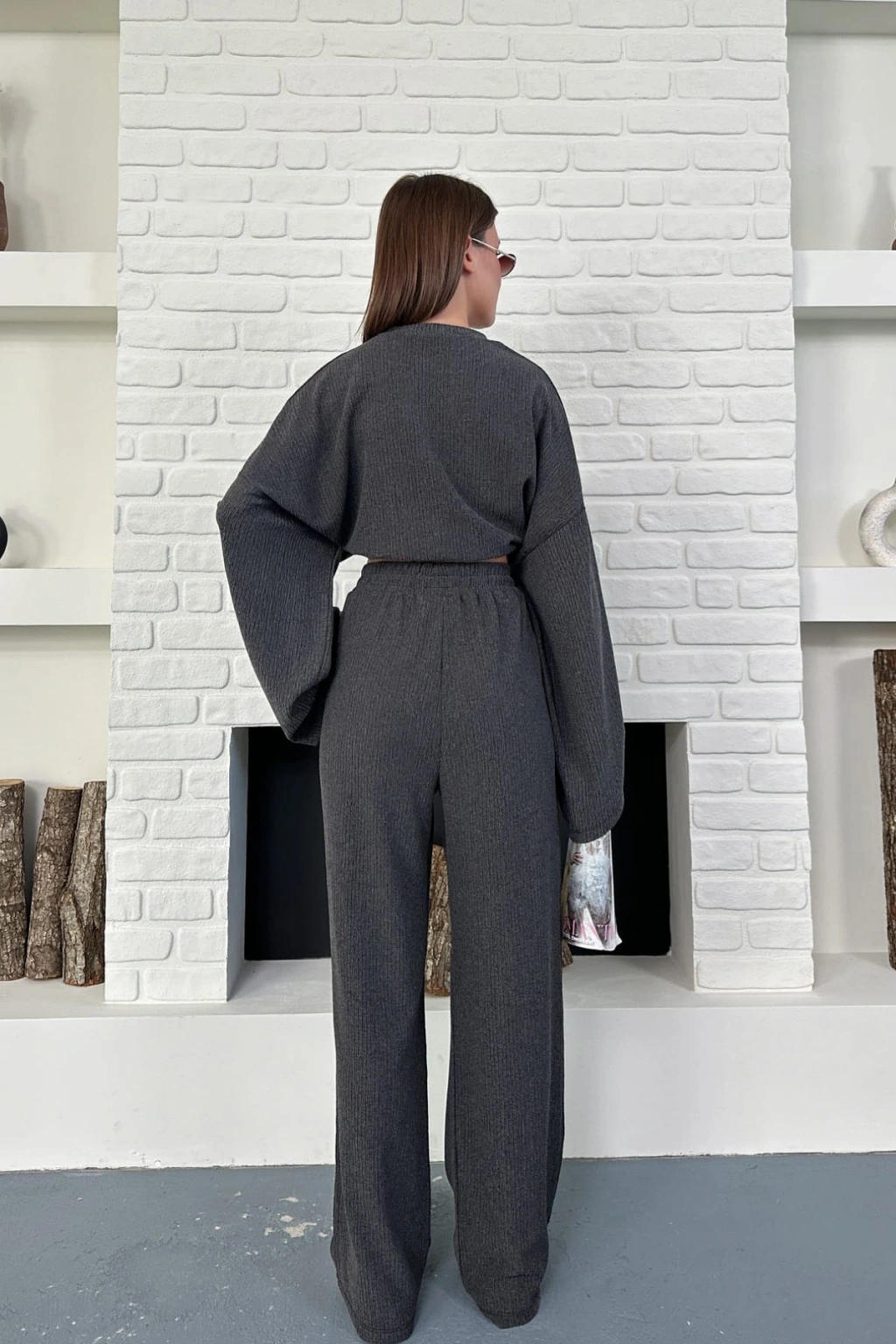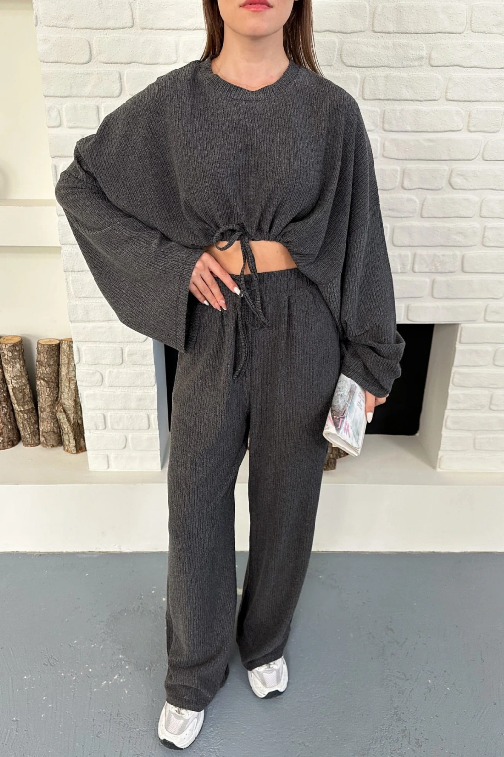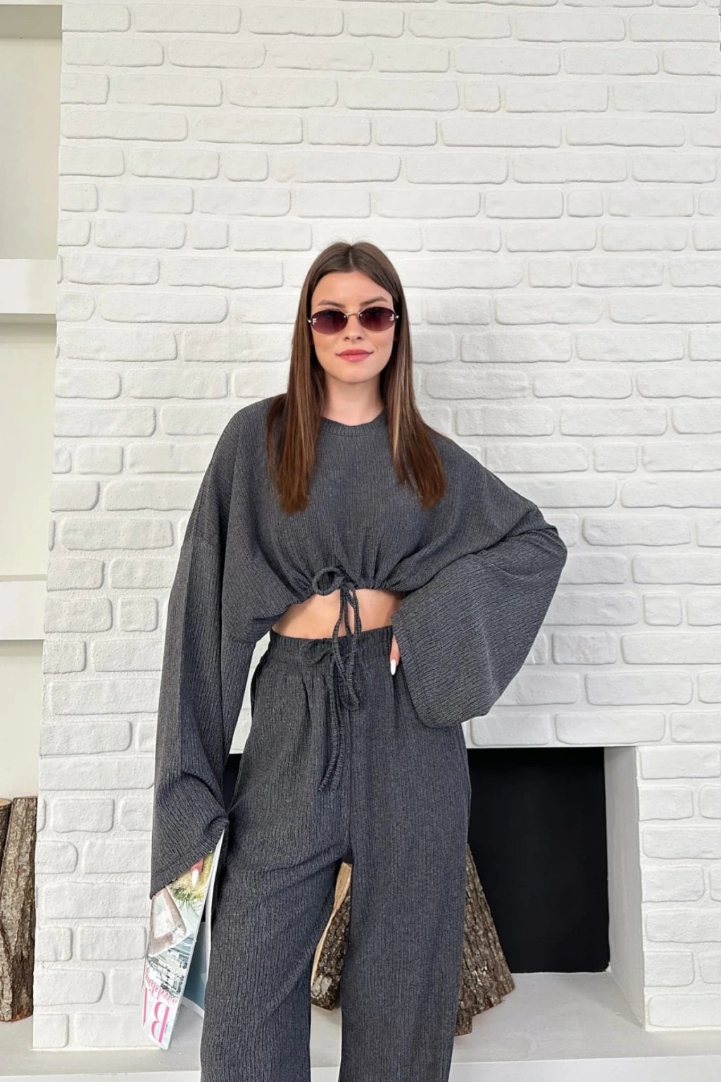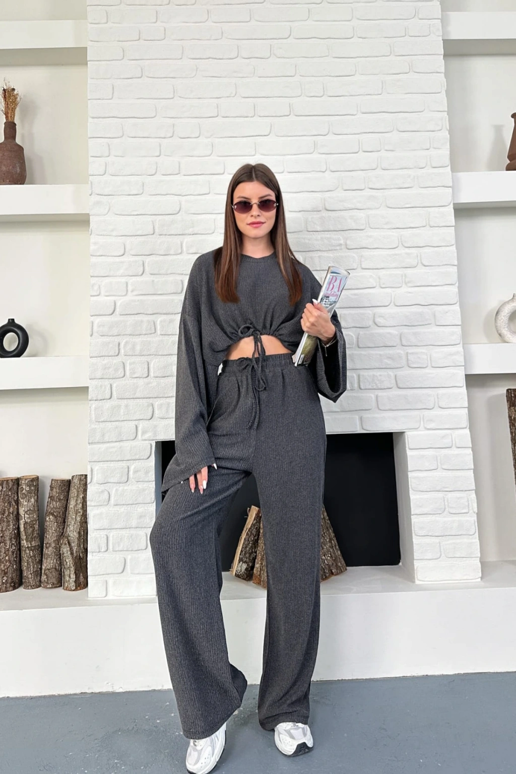 - Bağlama detaylı tasarımı ile modern ve şık bir görünüm sunar.; - Orta kalınlıkta kumaşı, mevsim geçişlerinde ideal konfor sağlar.; - Young koleksiyonuna ait bu takım, genç ruhunuza hitap eder.; - Bisiklet yakası sayesinde rahat bir kullanım sunarken, bağcık kapama şekliyle kişisel zevkinize göre ayarlama imkanı tanır.; - Yüksek bel pantolon kesimi ile vücut hatlarınıza mükemmel uyum sağlar.; - İki parçadan oluşan set, pratik kombinler için idealdir; hem crop üst hem de yüksek bel pantolonla stilinizi tamamlamanız kolaylaşır.; - Sürdürülebilirlik detayına önem vermeyen bu takım, günlük kullanım için uygundur.; - Baskısız deseniyle sadelikten yana olanların tercihi olacak şekilde tasarlanmıştır.; - Basic silueti ile zamansız parçalar arasında yerini alır; her gardıropta bulunması gereken temel ürünlerden biridir.; - İlkbahar/Sonbahar sezonuna uygun olarak tasarlanmıştır; mevsimsel geçişlerde rahatlıkla tercih edilebilir.; - Geniş paça pantolon kesimi hareket özgürlüğü sunarken şık duruşundan ödün vermez.; - Kutusuz paket içeriğiyle minimalist yaklaşımı benimseyenlere hitap eder.; - Astarsız yapısıyla hafiflik hissi verirken, çift cepli tasarım fonksiyonellik kazandırır.; - Düz renk seçeneğiyle kolayca kombinlenebilir; farklı aksesuarlarla kişisel tarzınızı yansıtma fırsatını sunar.; - Relaxed kalıp sayesinde vücudu sarmayan rahat bir oturuşa sahiptir; gün boyu konforlu hissetmenizi sağlar.; - Kadın / kız cinsiyetine yönelik olarak tasarlanmış olup her yaş grubundan kadına hitap eder.; - Dokuma kumaşı dayanıklılığı arttırırken örgü detaylarıyla estetik bir dokunuş katmaktadır.; - Ek özellikler barındırmayan basit tasarımla sadeliği ön plana çıkartır.; - Casual/günlük ortamlarda rahatlıkla kullanılabilen bu takım, günlük giyimin vazgeçilmezi arasına girecek.; - Bluz-pantolon alt üst takımı olarak ideal kombin seçenekleri sunarak stilinizi tamamlamanızda yardımcı olur.