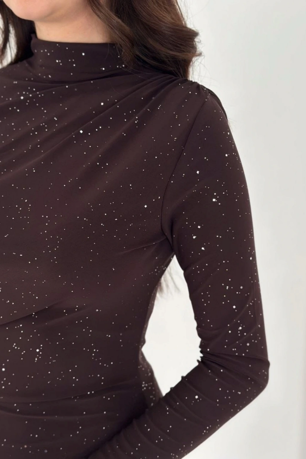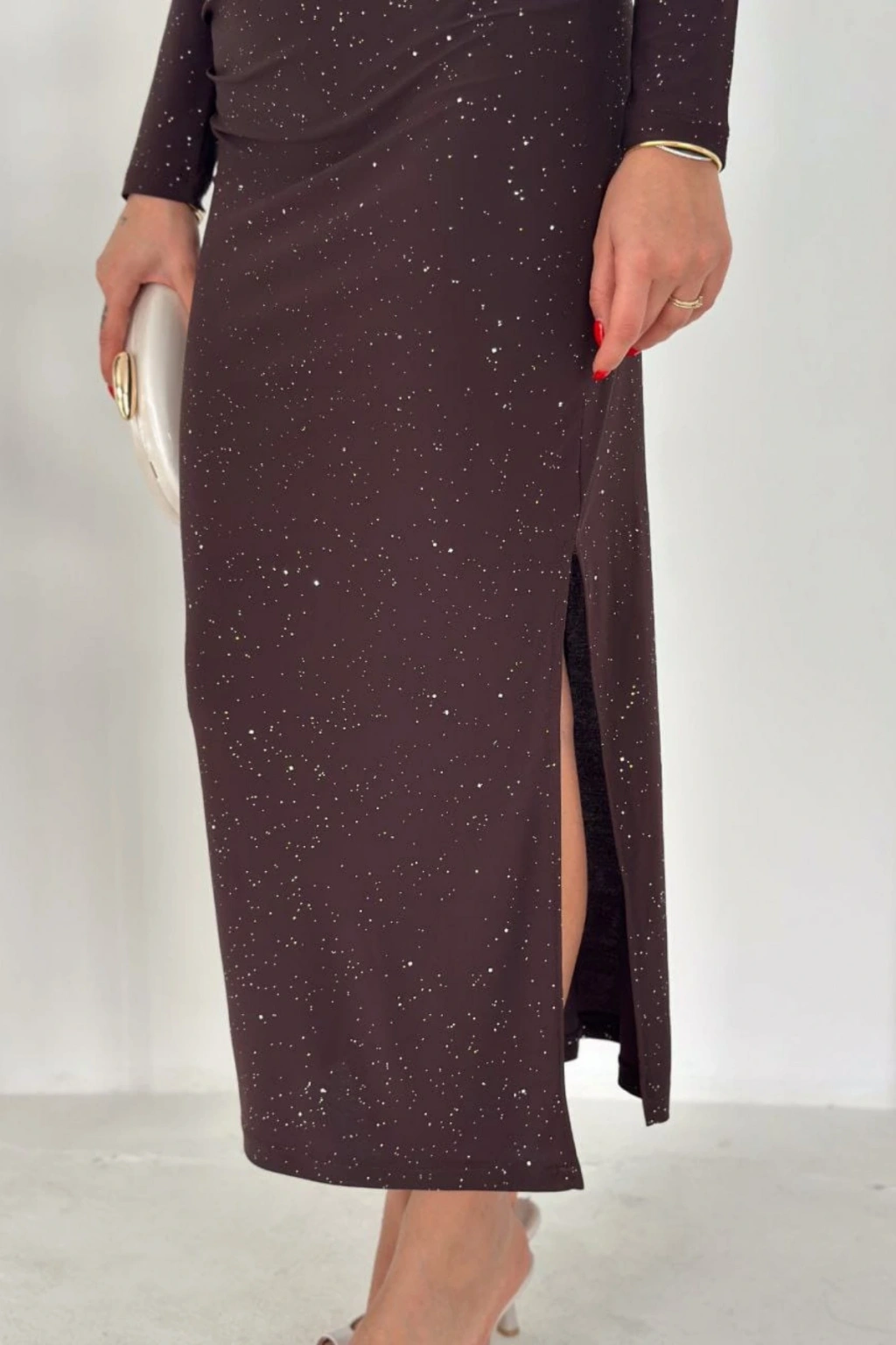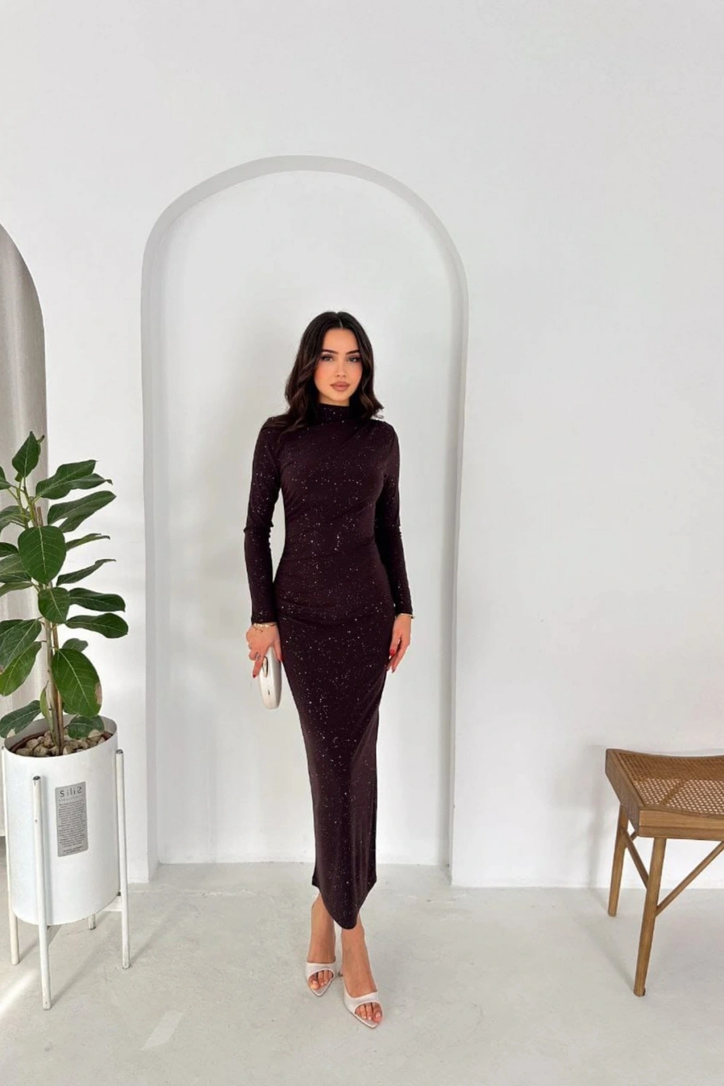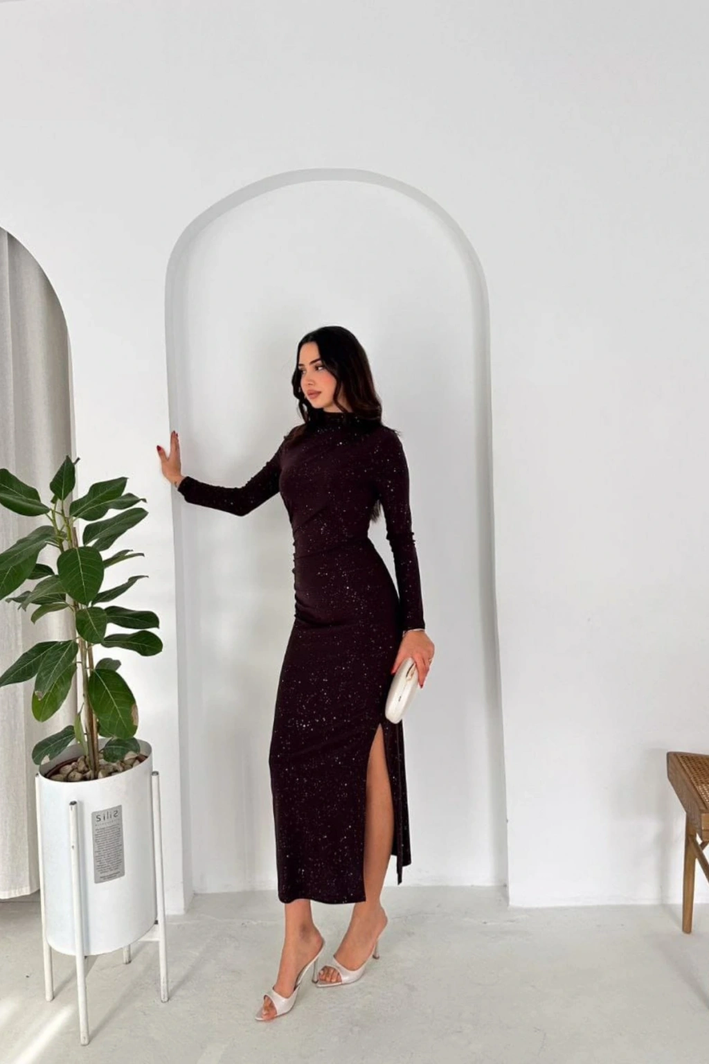 - Sandy dokuma kumaşı ile yumuşak bir dokunuş ve konforlu bir kullanım sunar.; - Yırtmaç detayı ile modern ve şık bir görünüm kazandırır, hareket özgürlüğü sağlar.; - Vücudu saran kesimi sayesinde feminen hatları ön plana çıkarır.; - Kapamasız tasarımı ile kolay giyilip çıkartılabilir ve rahat bir kullanım sunar.; - Uzun kollu yapısı ile mevsim geçişlerinde ideal koruma sağlar.; - Düz deseniyle sade ve zarif bir stil oluşturur, farklı aksesuarlarla kombinlenebilir.; - Bodycone silueti vücut hatlarını zarifçe sararak feminen bir duruş sergiler.; - Astarsız yapısı sayesinde hafiflik ve rahatlık hissi verir.; - Uzun kol tipi ile kollarınızı tamamen sararak şık ve koruyucu bir görünüm sunar.; - Kemersiz tasarımı sayesinde vücut hatlarını doğal şekilde vurgular.; - Cepsiz olması, elbisenin minimal ve düzgün hatlarını korur.; - Party koleksiyonunun parçası olarak özel gecelerde dikkat çekici bir stil yaratır.; - Tüm sezonlar için uygunluğu ile yılın her zamanında tercih edilebilir.; - Yarım balıkçı yaka tipiyle zarif boyun hatlarını vurgular ve sofistike bir görünüm sağlar.; - Cool & Comfort persona
