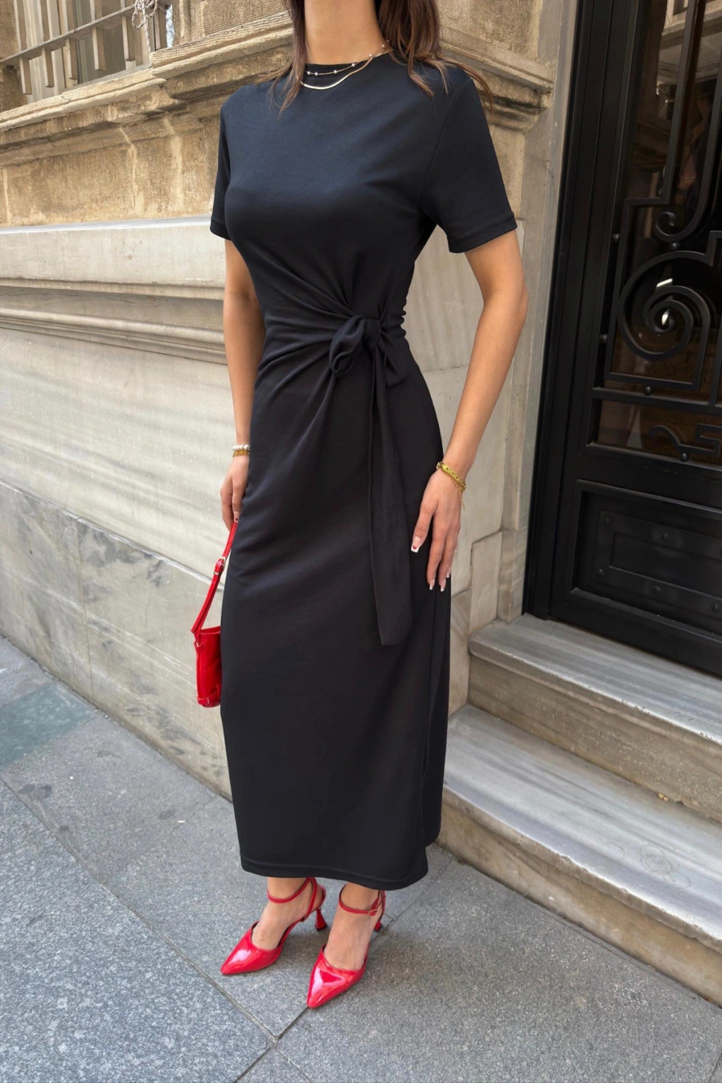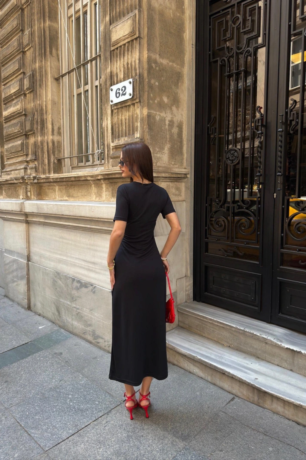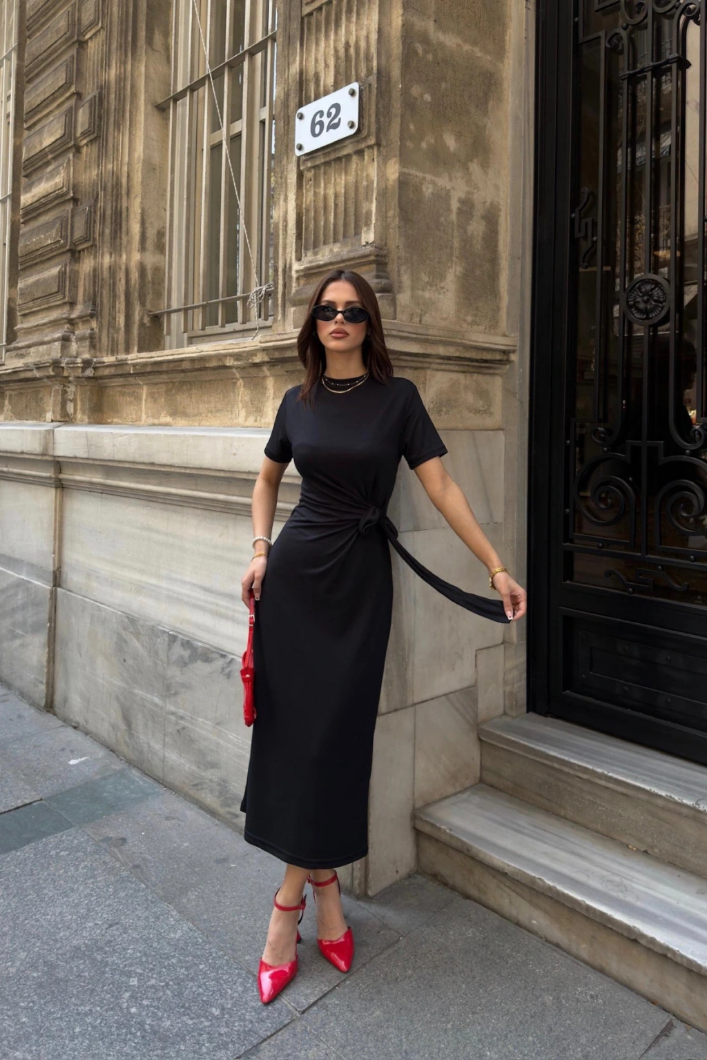 - Rahat kesimi ile günlük kullanım için ideal, siyah renkli modal kumaştan üretilmiş elbise.; - Yandan bağlama detayı sayesinde feminen bir görünüm sunar ve kişisel zevke göre ayarlanabilir.; - Büzgü detayı ile modern ve şık bir siluet oluştururken, kuşak detayı bel bölgesini vurgular.; - Astarsız yapısıyla hafif ve nefes alabilen bir kullanım sunar; iç göstermez.; - Basic koleksiyonun sadeliğiyle her ortamda rahatlıkla tercih edilebilir.; - Orta kalınlığındaki modal kumaşı mevsim geçişlerinde ideal konfor sağlar.; - Trend bir görünüm için kısa kollu ve bisiklet yaka tasarımıyla genç tarza hitap eder.; - Pamuklu materyali sayesinde cildinizle dost dokunuşlar yaşatır ve gün boyu rahat hissetmenizi sağlar.; - Midi boyu ile hem günlük hem de özel günlerde şıklığınızdan ödün vermeden stil sahibi olmanızı mümkün kılar.; - Comfort kalıbıyla vücudu saran ancak sıkmayan yapıya sahiptir, hareket özgürlüğünüzü kısıtlamaz.; - TR menşeli olmasıyla yerel üretim avantajını yakalarsınız.; - Yetişkin yaş grubuna uygun olarak tasarlanmıştır; zamansız parçalar arasında yerini alır.; - Trend ortamlarda dahi güncel moda akımlarıyla uyum içinde olmanız için idealdir.