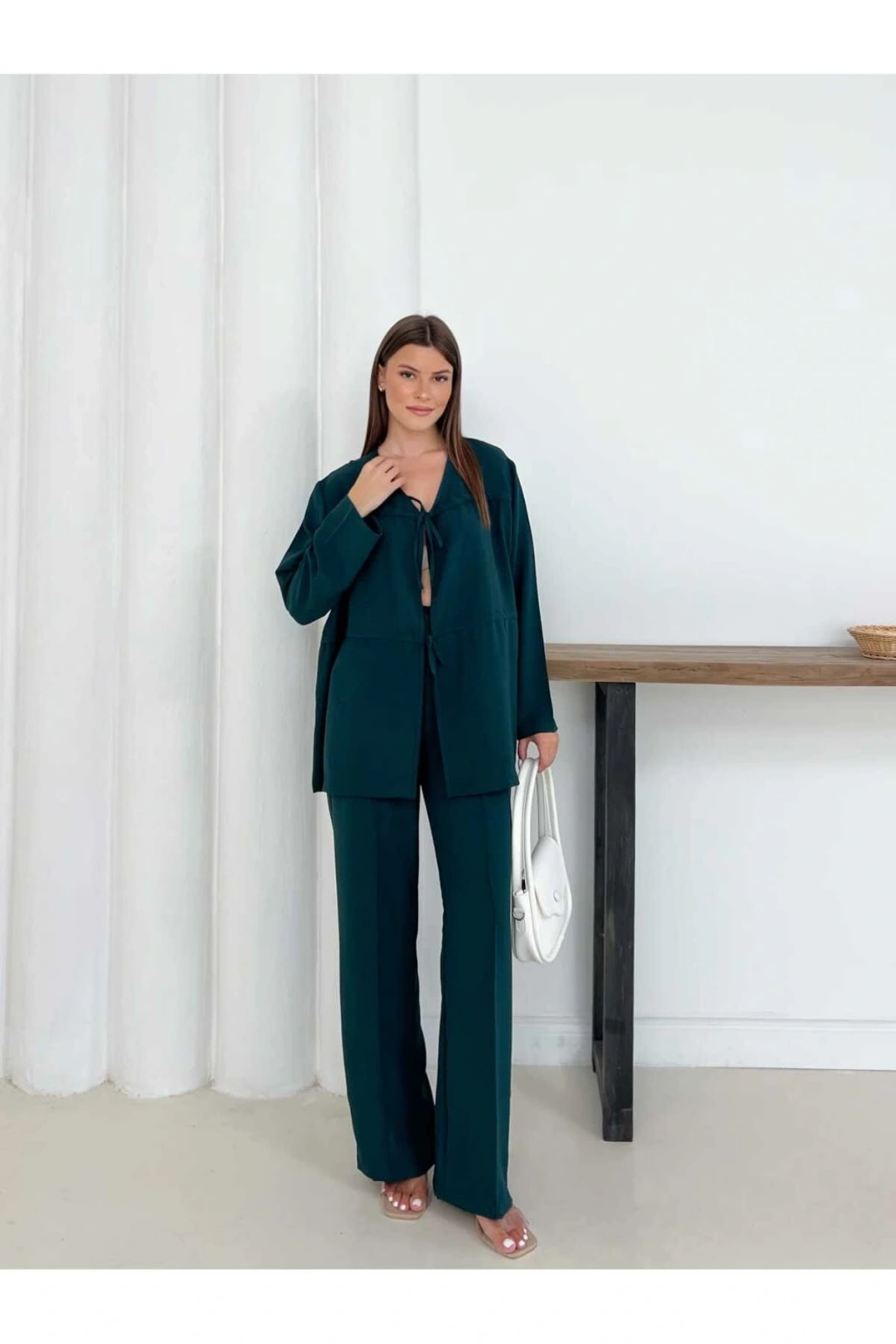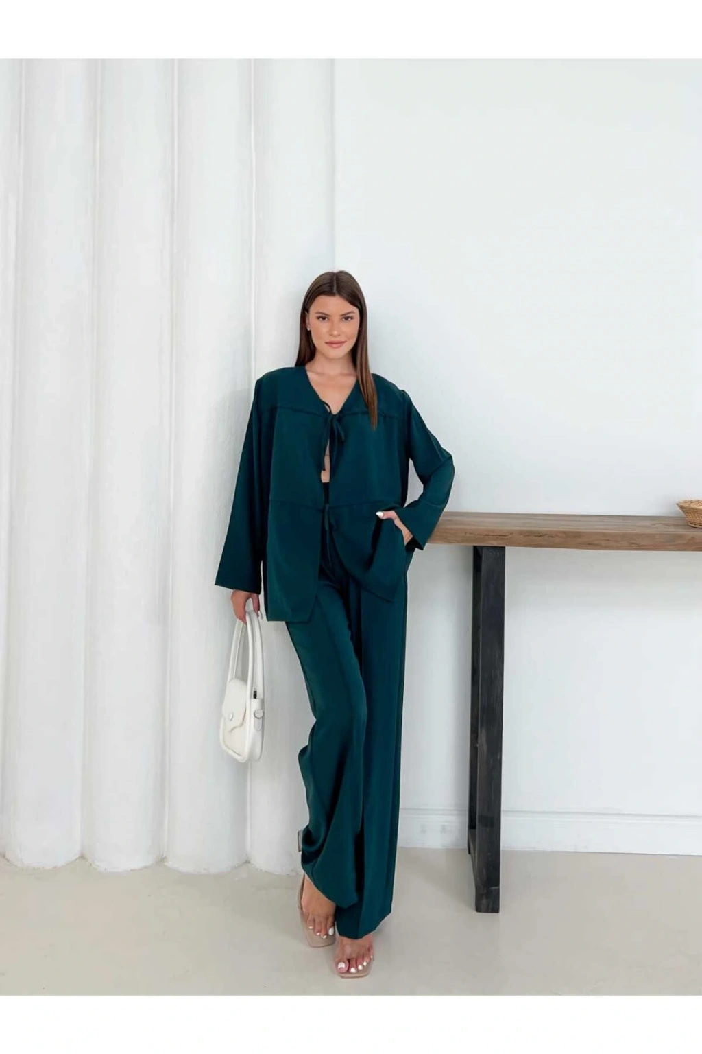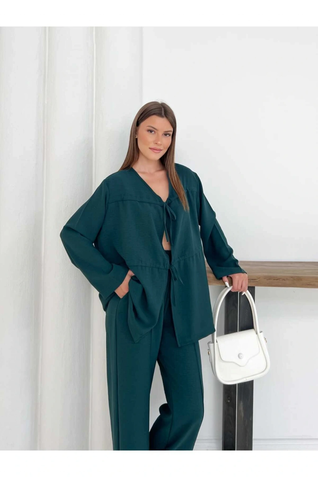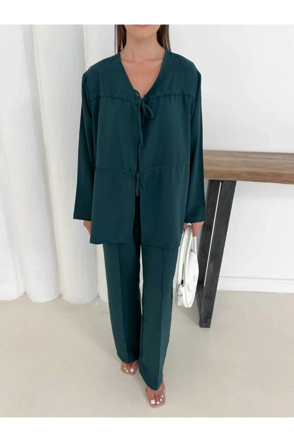 Kadın Zümrüt Yeşili Aerobin Kumaş Pantolon Ve Kimona İkili Takım