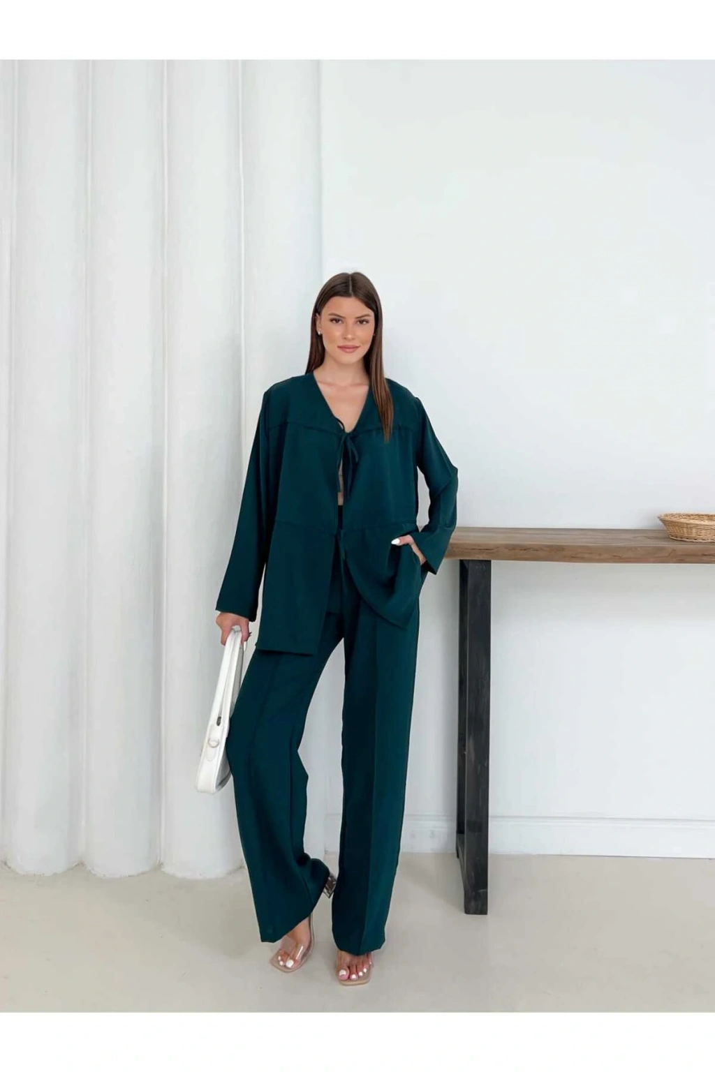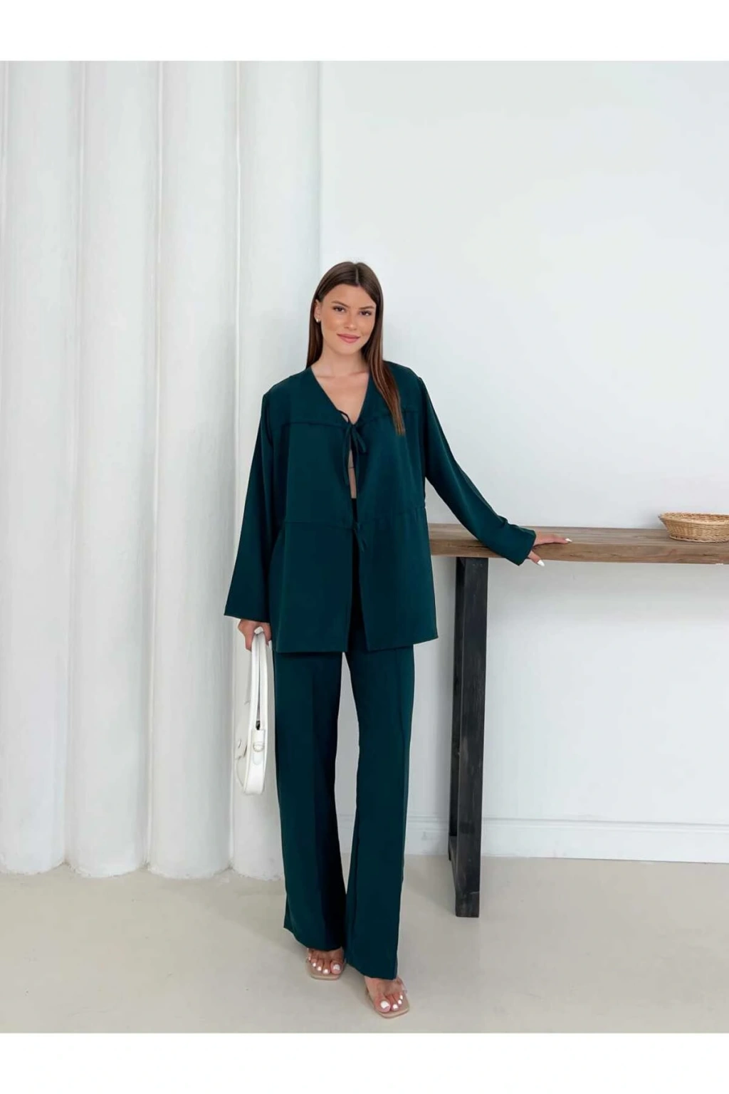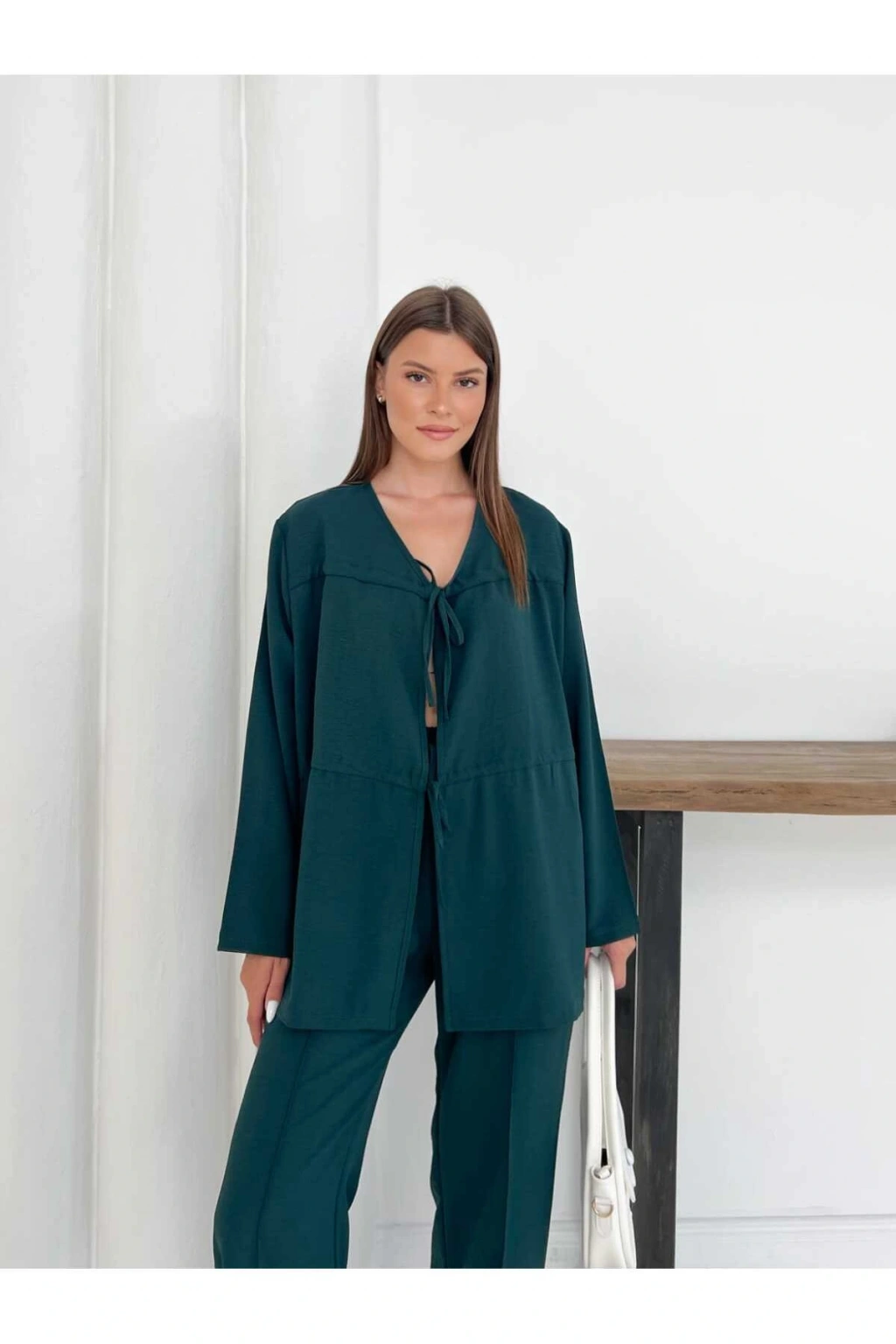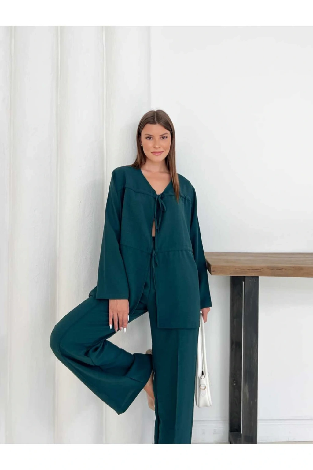 Kadın Zümrüt Yeşili Aerobin Kumaş Pantolon Ve Kimona İkili Takım