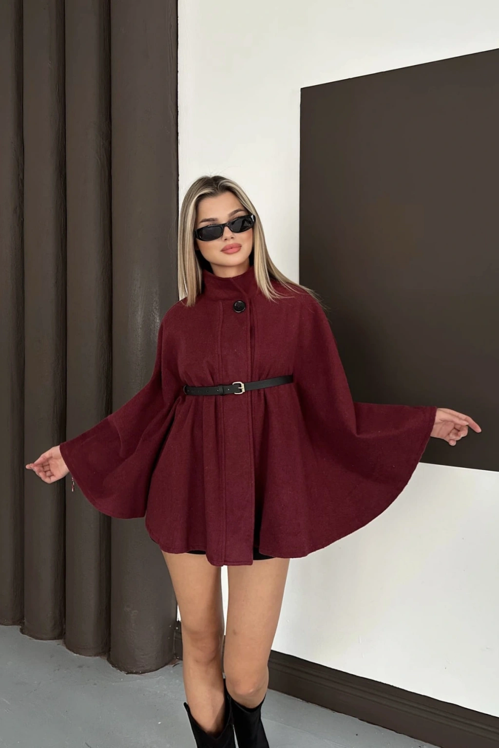 - Kış aylarında sıcak tutan ve şıklığı ön planda tutan kaşe panço, soğuk havalarda vazgeçilmez bir parça.; - İç göstermeyen yapısı ile rahat bir kullanım sunar ve günlük aktivitelerinizde konfor sağlar.; - Kemer detayı sayesinde belinizi vurgularken, zarif bir görünüm kazandırır.; - Uzun kollu tasarımı ile kollarınızı soğuktan korurken, hareket özgürlüğünüzü kısıtlamaz.; - Düz deseniyle kolayca kombinlenebilir ve her türlü kıyafetle uyum sağlar.; - Pamuk ve polyester karışımı materyali sayesinde dayanıklılık ve yumuşaklık sunar.; - Bağlama / bağcık kapama şekli ile kolayca giyilip çıkartılabilir ve pratik kullanım imkanı tanır.; - Polo yaka tasarımı, modern ve sofistike bir görünüm kazandırırken, casual ortamlarda rahatlıkla tercih edilebilir.; - Cool & Comfort persona ile hem stil sahibi hem de rahat hissetmenizi sağlar.; - Tesettür giyim koleksiyonuna uygun olarak tasarlanmıştır;