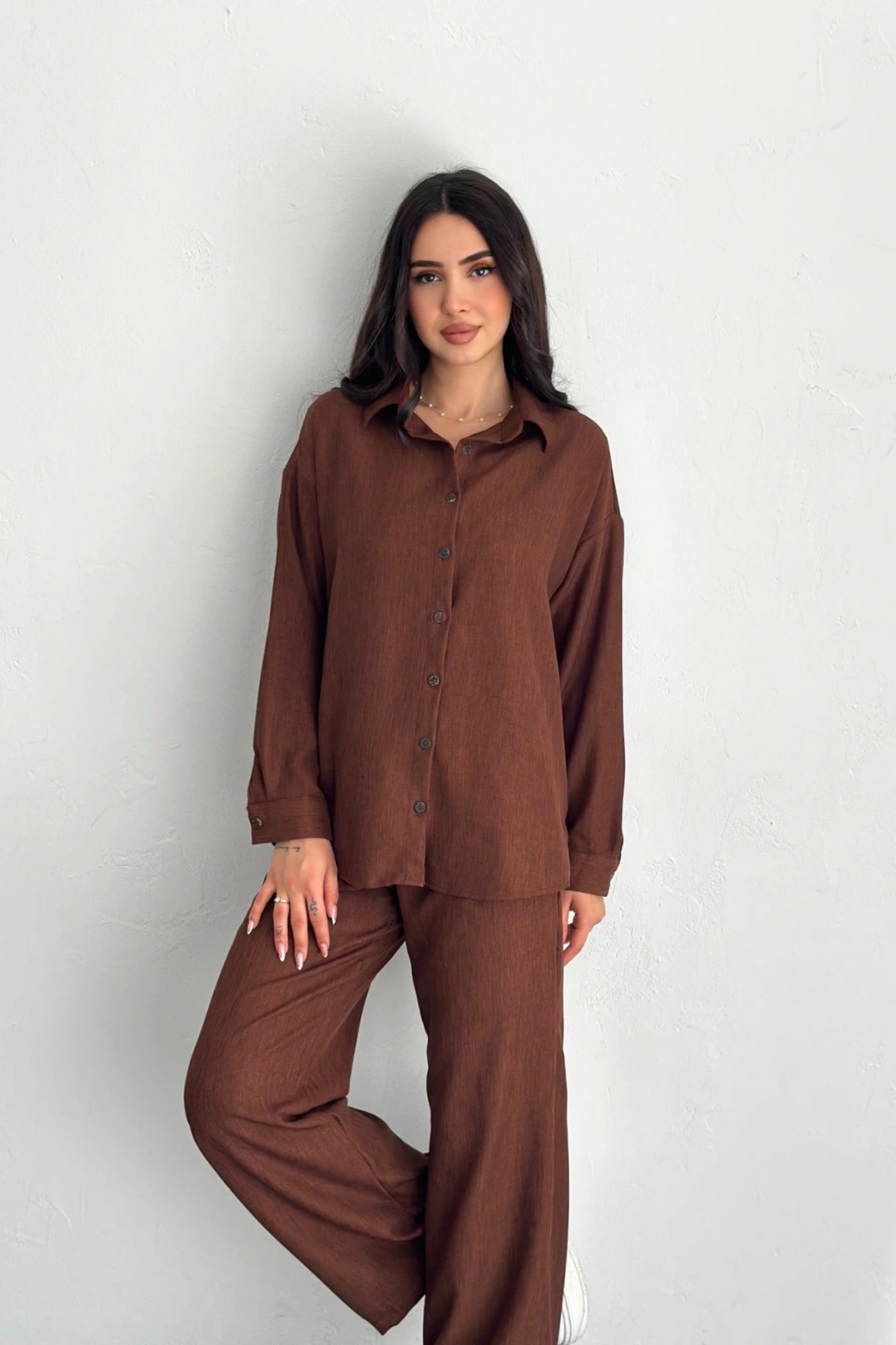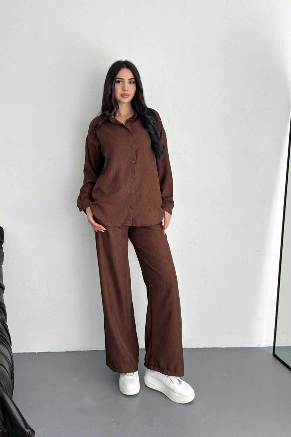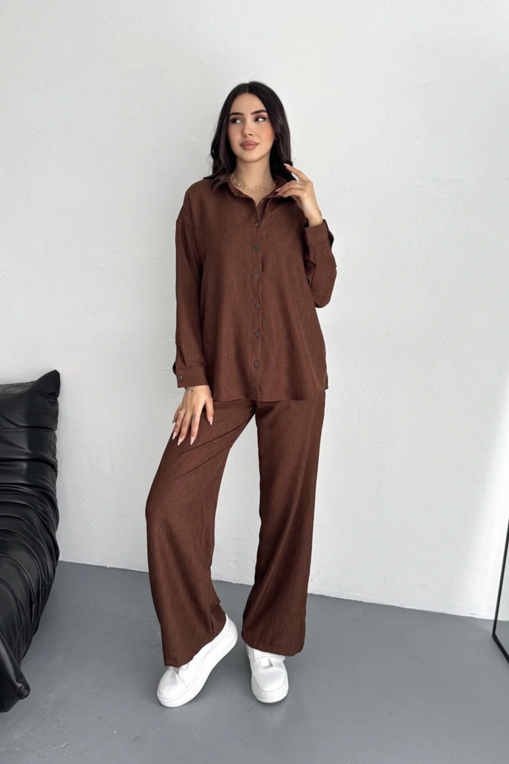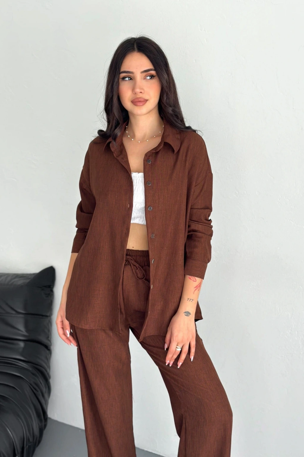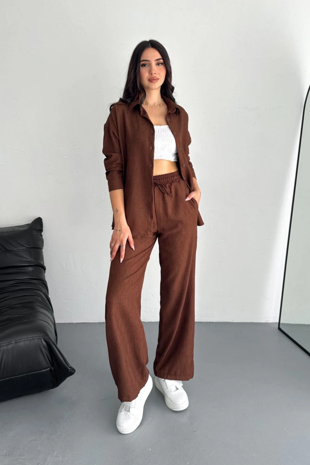 - Gömlek yaka tasarımı ile şıklığı ve rahatlığı bir arada sunar.; - Baskısız yapısıyla sade ve zamansız bir görünüm sağlar.; - Bağcıklı kemer detayı sayesinde farklı stiller yaratma imkanı tanır.; - Her mevsim tercih edilebilen, çok yönlü kullanım sunan bir koleksiyona aittir.; - Basic siluetiyle günlük giyimin vazgeçilmez parçasıdır.; - 2'li paket içeriğiyle hem gömlek hem de pantolon ihtiyacınızı karşılar.; - Kutusuz ambalajıyla minimalist bir yaklaşım sergiler.; - Bağlama veya bağcık detaylarıyla kişisel zevke göre ayarlama yapılabilir.; - Normal bel kesimi konforlu bir oturuş sağlarken, geniş paça tasarımı modern bir hava katmaktadır.; - Sürdürülebilirlik açısından bilinçli seçimler yapmak isteyenler için idealdir; ancak bu konuda özel bir vurgusu yoktur.; - Düğmeli detayları ile pratik kullanım sunarken, astarsız yapısı hafifliği ön plana çıkartır.; - İki parça kombini olarak tasarlanmıştır; gömlek ve pantolon tek başına da tercih edilebilir.; - Casual ortamlarda rahatlıkla kullanılabilen düz deseniyle her türden etkinliğe uyum sağlar.; - Dokuma kumaşı dayanıklılığı arttırarak uzun süreli kullanım vaad eder.; - Uzun kol boyu mevsimsel geçişlerde ideal koruma sunarken düşük kol tipi hareket özgürlüğü sağlar.; - Gömlek-pantolon ikilisi olarak tasarlanmış olup casual tarza sahip kişiler için uygundur.; - Günlük kullanım için ideal olan bu takım, rahatlığı estetikle buluşturmayı amaçlamaktadır.; - Düşük kol tipine sahip olmasıyla yaz ayları için ferahlatıcı bir seçenek oluştururken, oversize kalıbı trendleri takip edenler için idealdir.; - Yetişkin yaş grubuna hitap eden bu ürün, herkes tarafından rahatlıkla tercih edilebilir.; - Düz deseniyle sadelikten yana olanların beğenisini kazanacak şekilde dizayn edilmiştir.