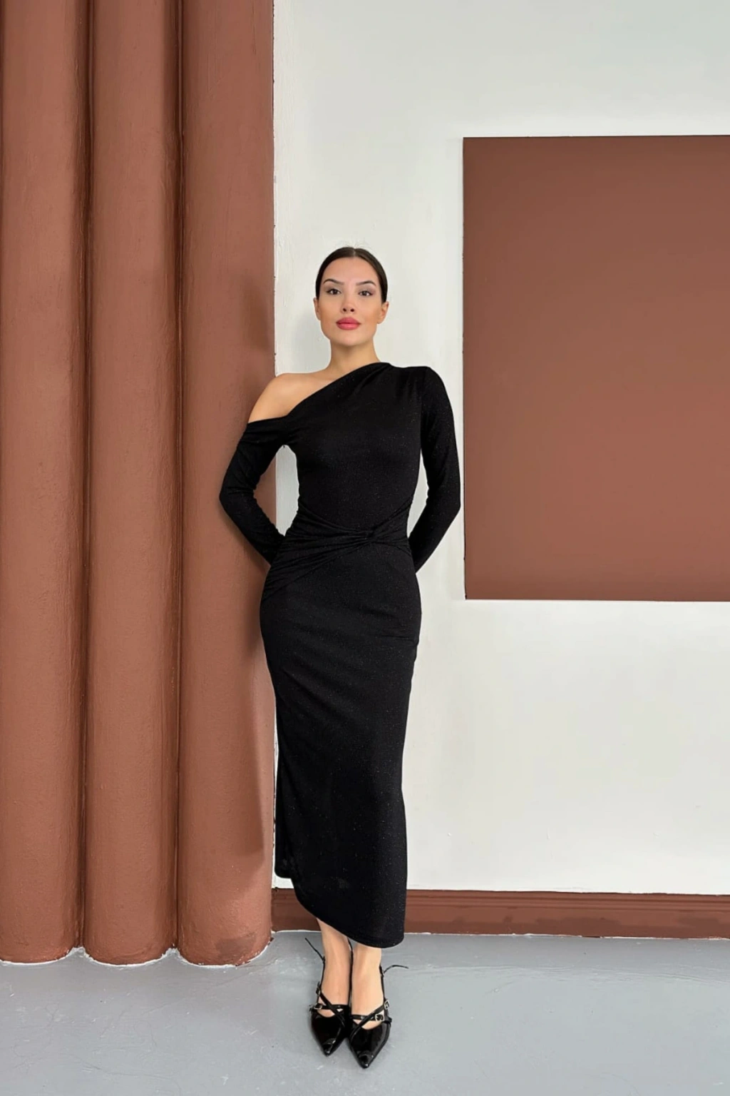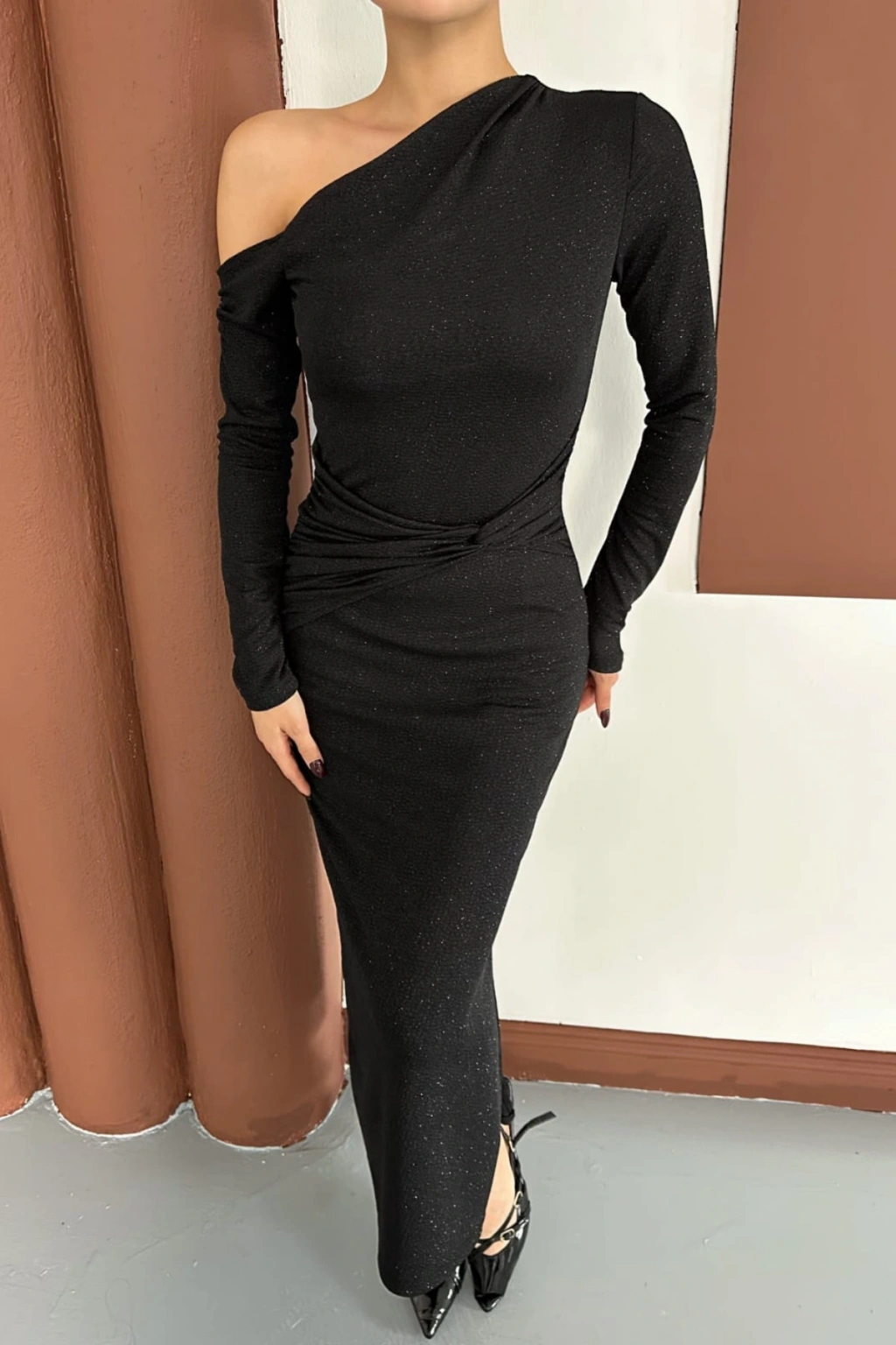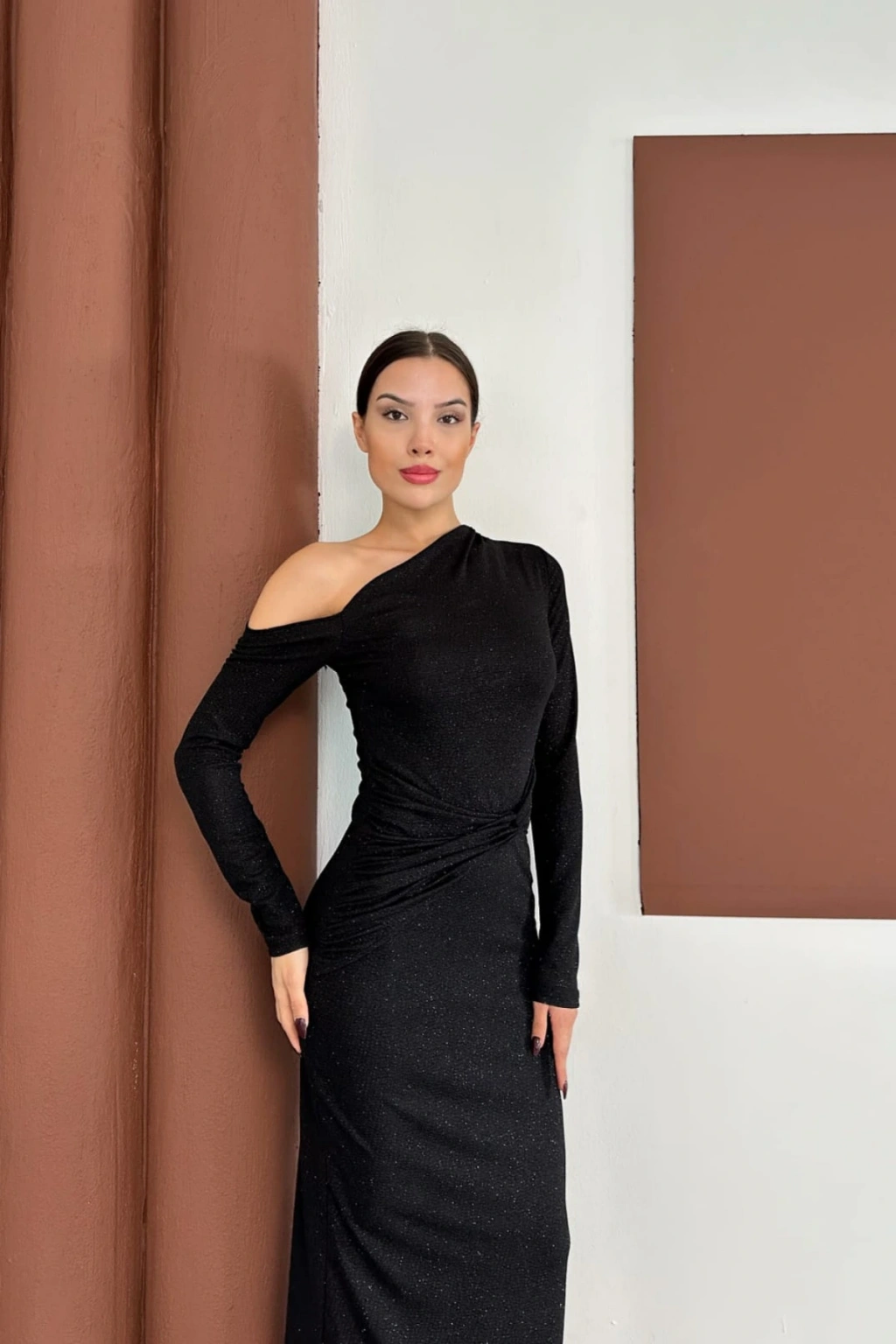 - Şık ve gece kullanımına uygun tasarımıyla, her ortamda göz alıcı bir görünüm sunar.; - Tek kol detayı ile modern ve sofistike bir stil yaratır.; - Sandy dokuma kumaşı sayesinde hafif ve rahat bir kullanım sağlar.; - Asimetrik yaka tipi ile feminen çizgileri ön plana çıkarır.; - Slim silueti sayesinde vücut hatlarını zarifçe sarar ve şık bir duruş sergiler.; - Uzun boyu ile zarif bir siluet oluştururken, düz deseniyle sade ve şık bir görünüm sunar.; - Örme kumaş tipi, esneklik ve konforu bir arada sunarak gün boyu rahatlık sağlar.; - Türkiye'de üretilmiş olup, yerel üretim desteklenerek sürdürülebilir moda anlayışına katkıda bulunur.;