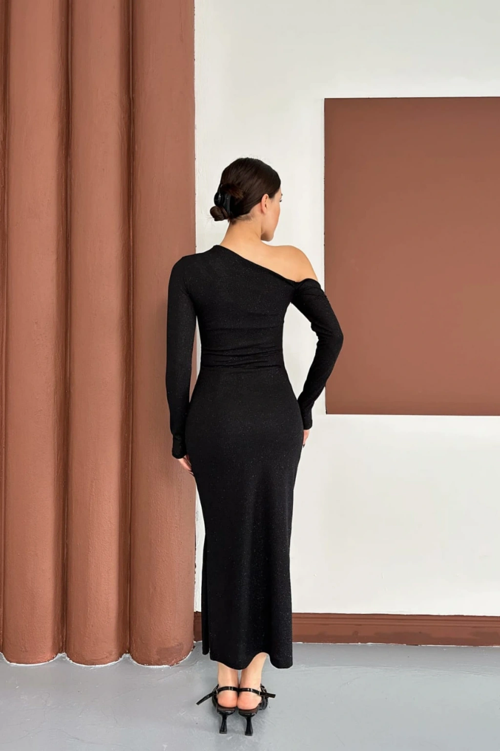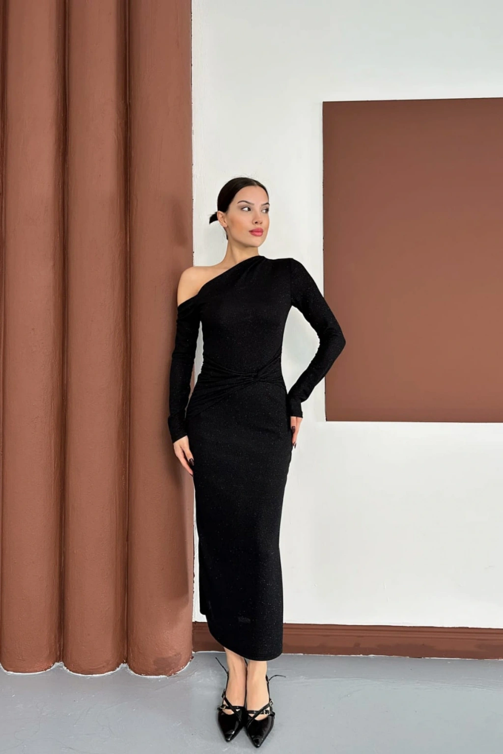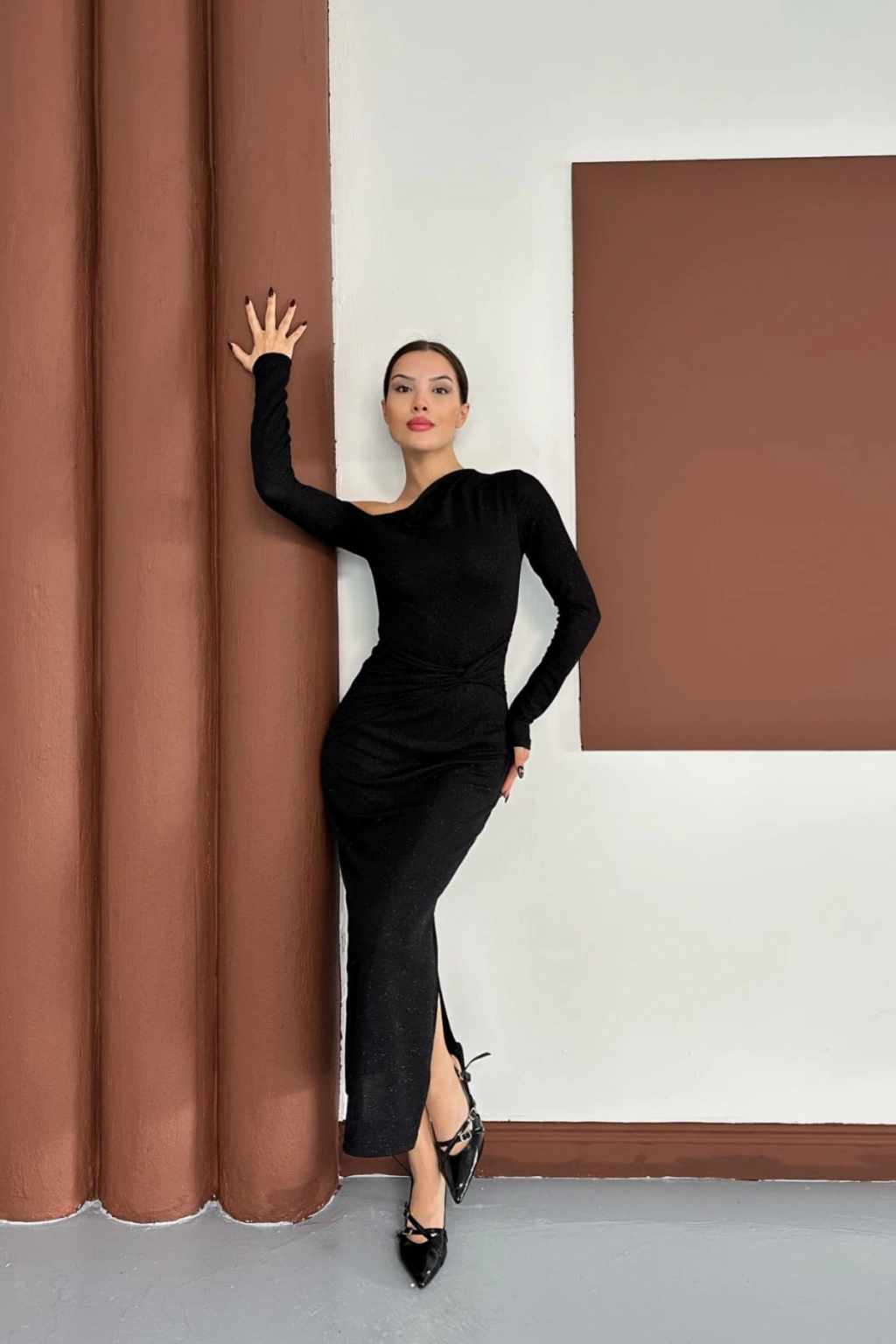 - Şık ve gece kullanımına uygun tasarımıyla, her ortamda göz alıcı bir görünüm sunar.; - Tek kol detayı ile modern ve sofistike bir stil yaratır.; - Sandy dokuma kumaşı sayesinde hafif ve rahat bir kullanım sağlar.; - Asimetrik yaka tipi ile feminen çizgileri ön plana çıkarır.; - Slim silueti sayesinde vücut hatlarını zarifçe sarar ve şık bir duruş sergiler.; - Uzun boyu ile zarif bir siluet oluştururken, düz deseniyle sade ve şık bir görünüm sunar.; - Örme kumaş tipi, esneklik ve konforu bir arada sunarak gün boyu rahatlık sağlar.; - Türkiye'de üretilmiş olup, yerel üretim desteklenerek sürdürülebilir moda anlayışına katkıda bulunur.;