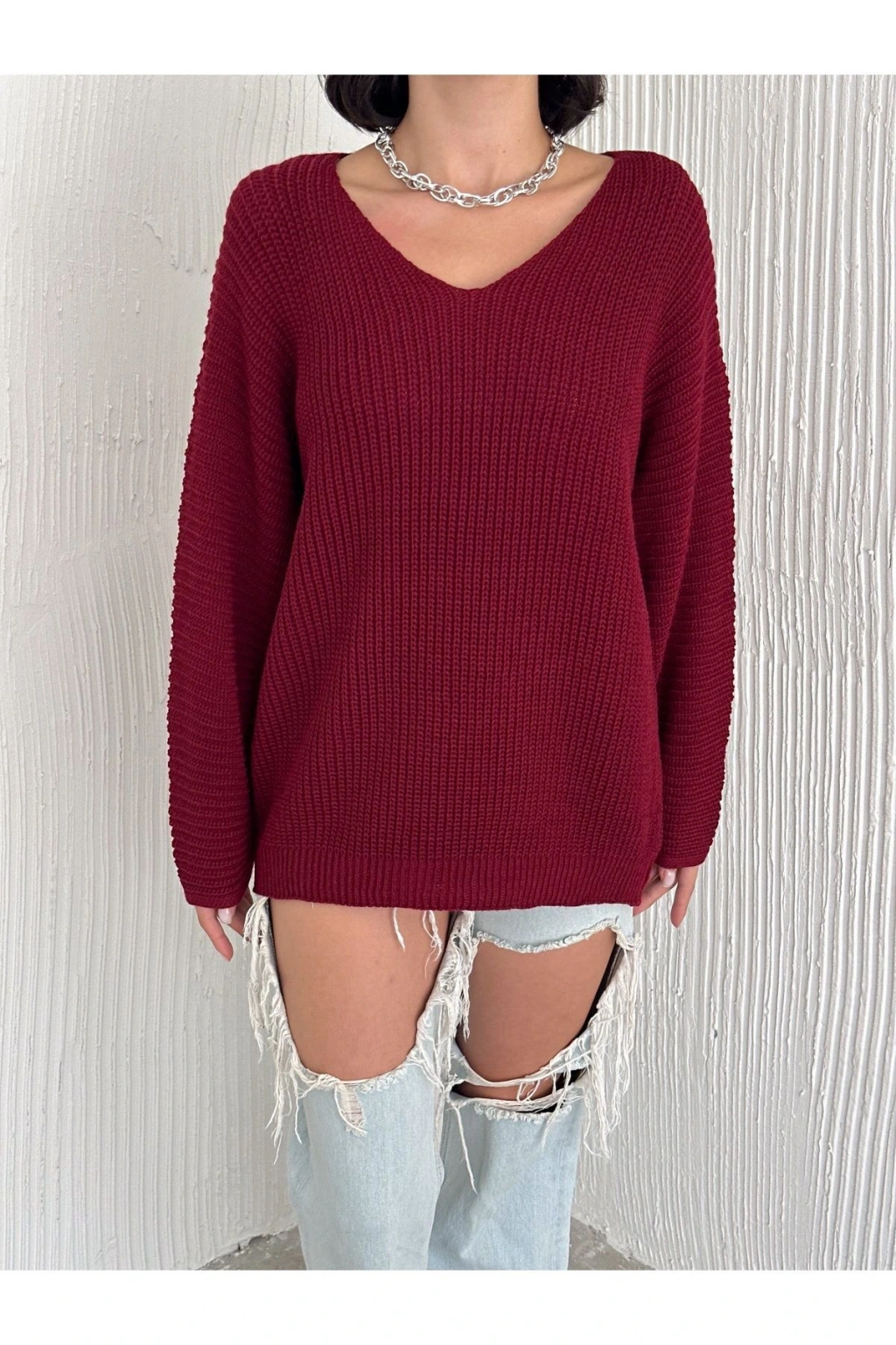 V Yaka Detaylı Modern ve Sade Örgü Kazak Modeli