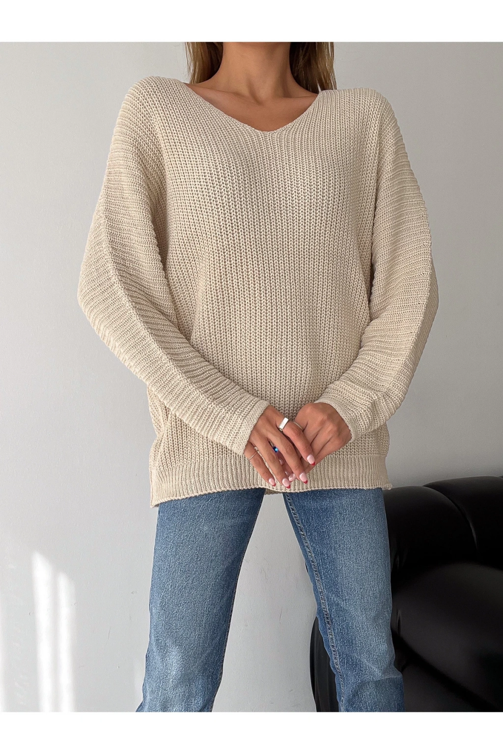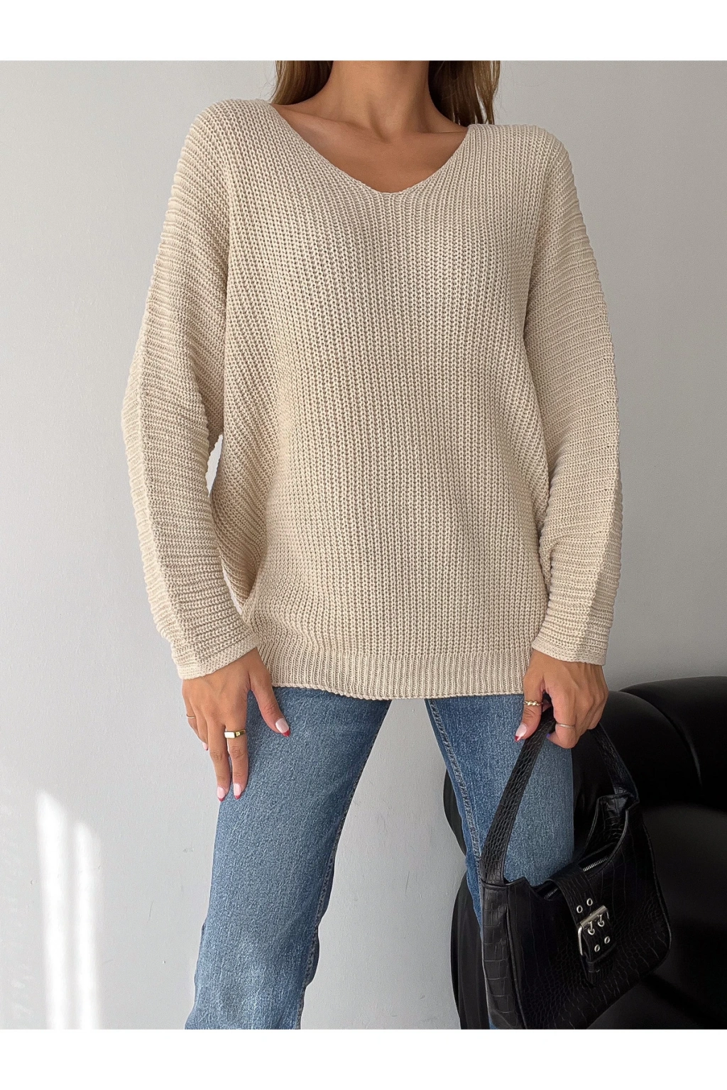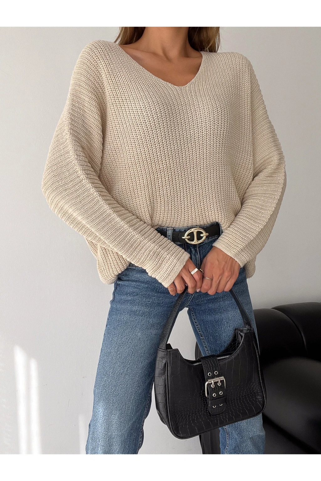 V Yaka Detaylı Modern ve Sade Örgü Kazak Modeli