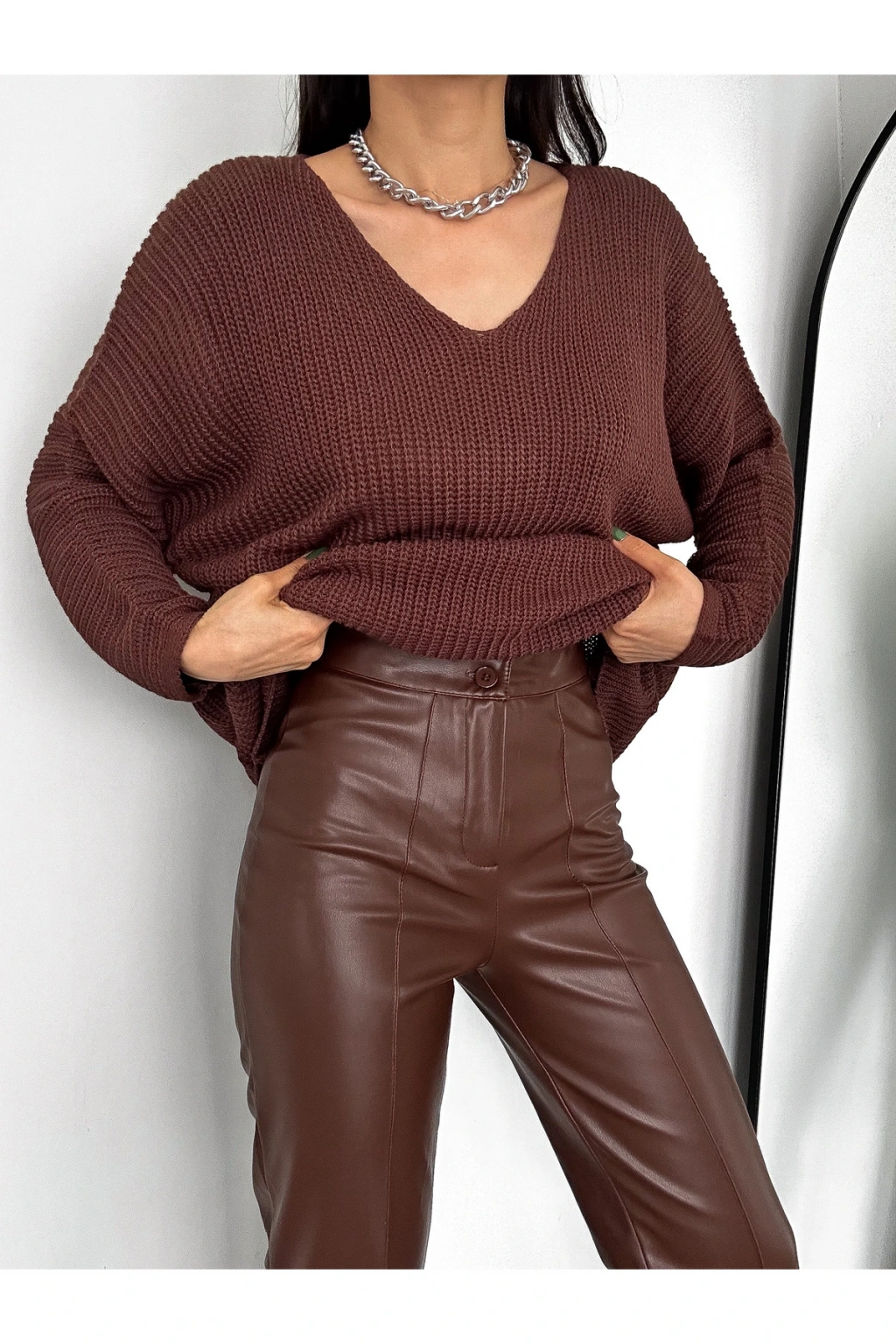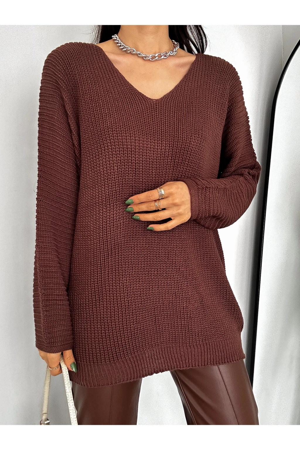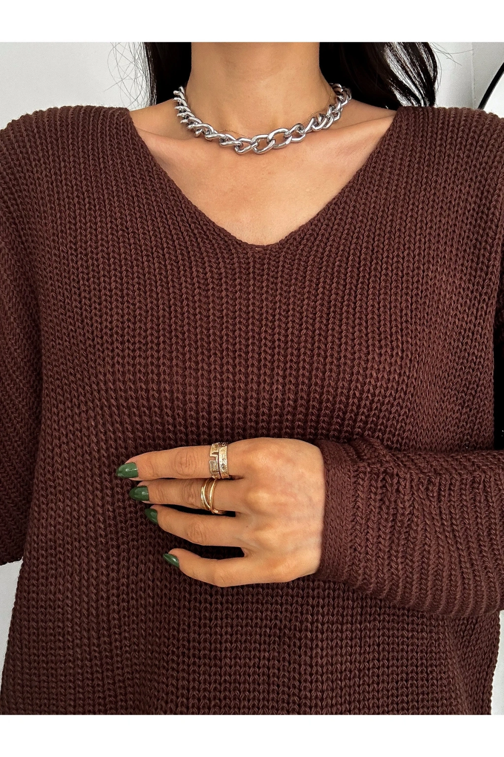 V Yaka Detaylı Modern ve Sade Örgü Kazak Modeli