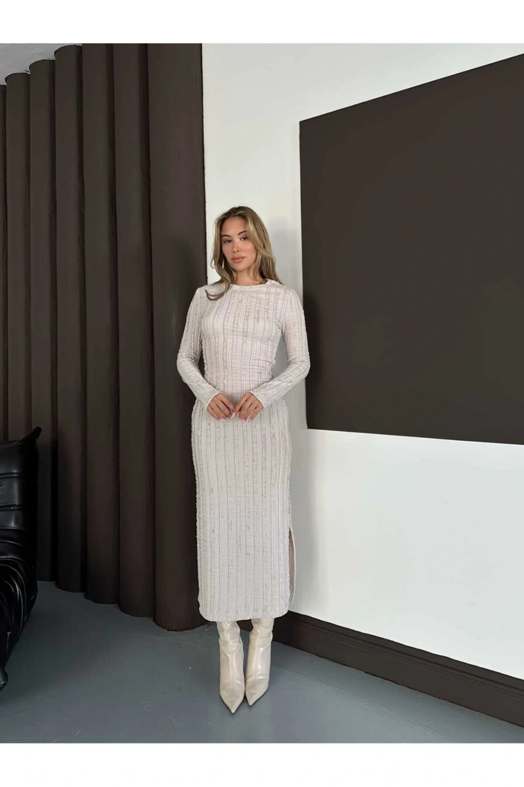 Yırtmaç Detaylı Fırfırlı Bej Elbise